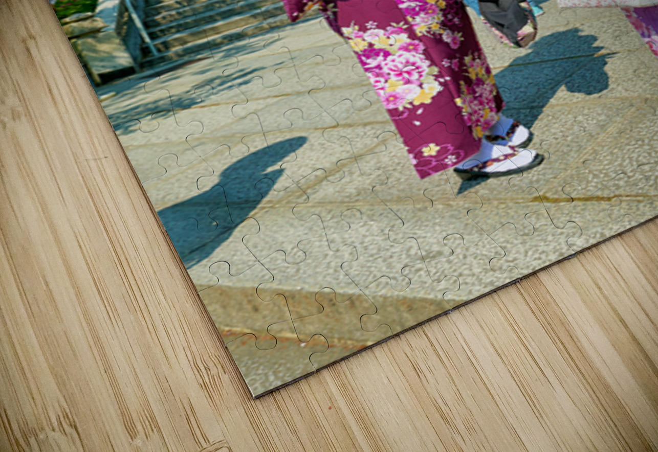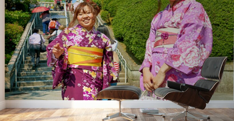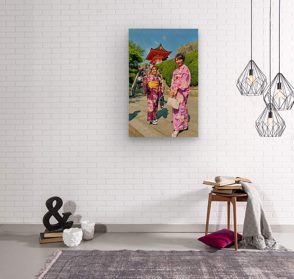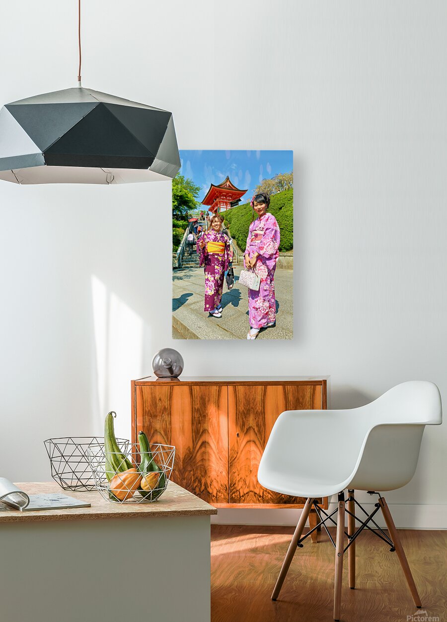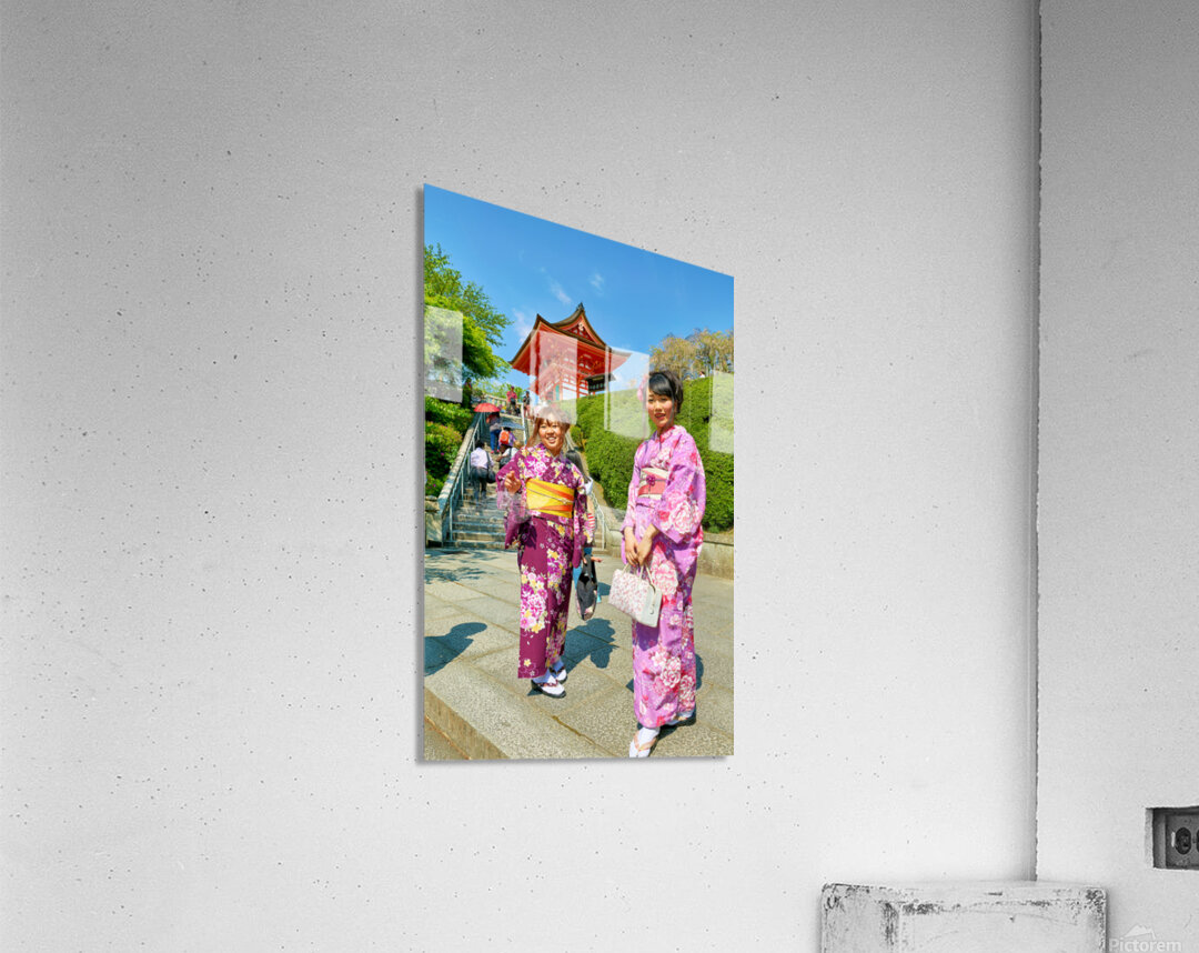 Two young women in colorful kimono stand near Koyasu Pagoda at Kiyomizu Dera Temple. The sun shines brightly on this clear day in Kyoto.
