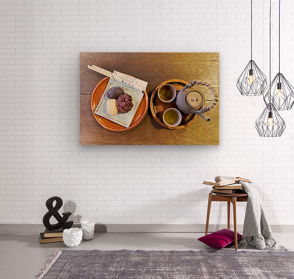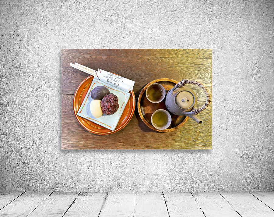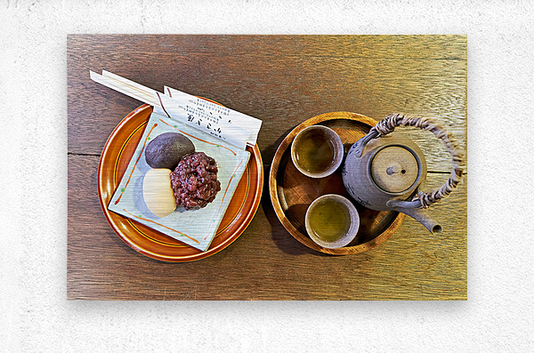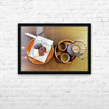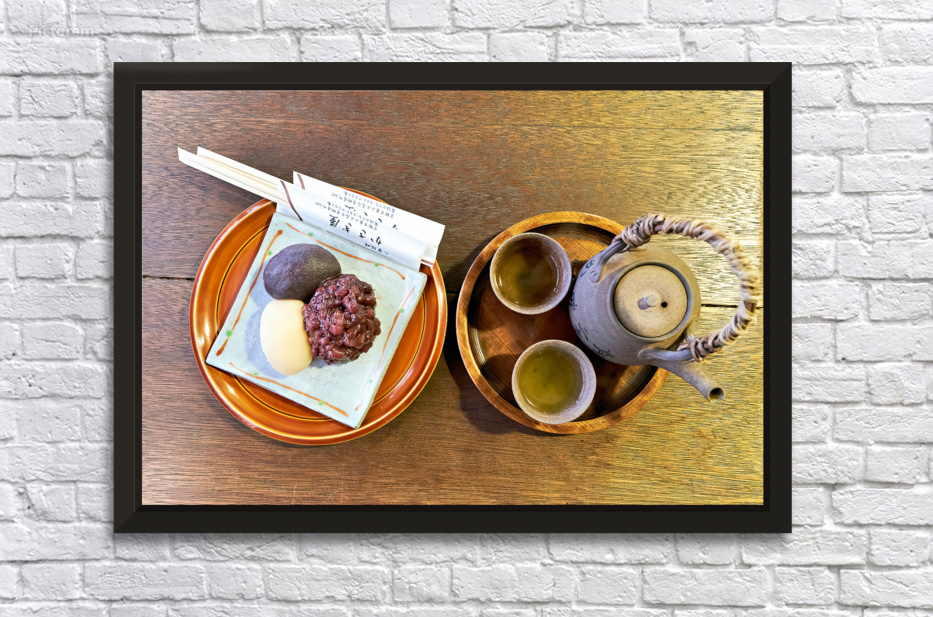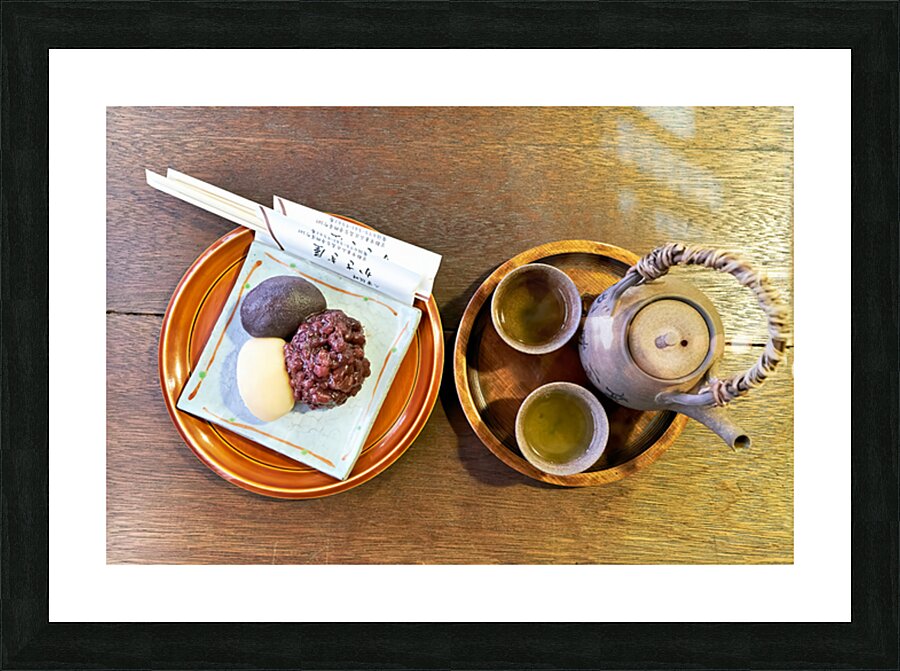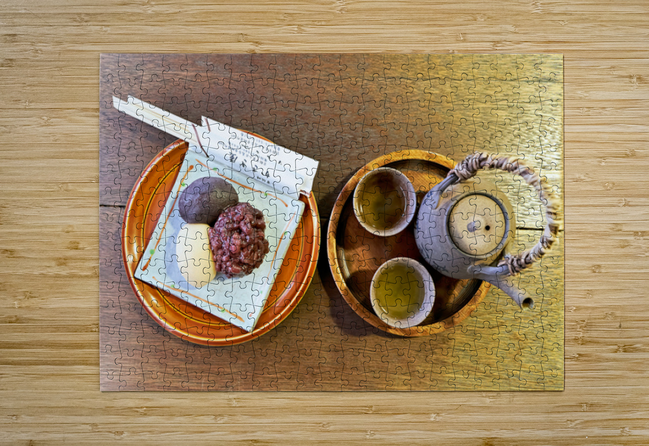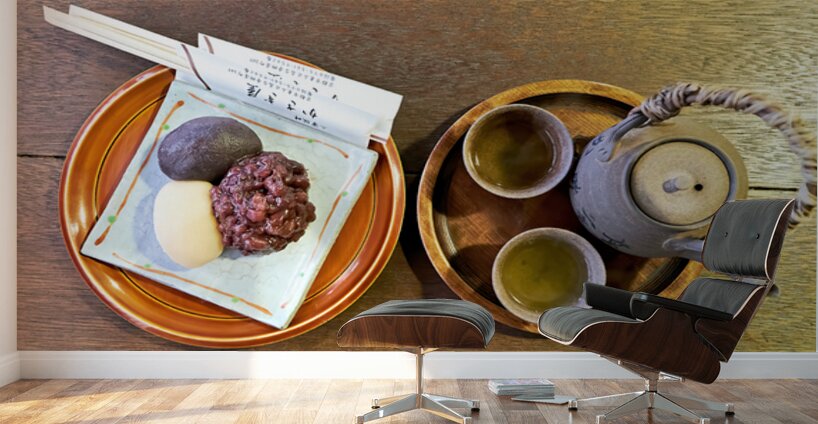 People enjoy traditional sweets and green tea in a shop in Higashiyama Kyoto. The setting features wooden trays and utensils.