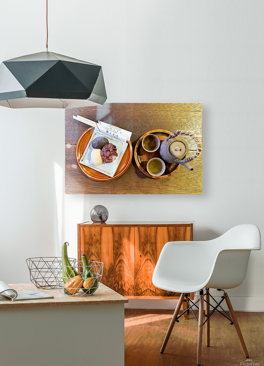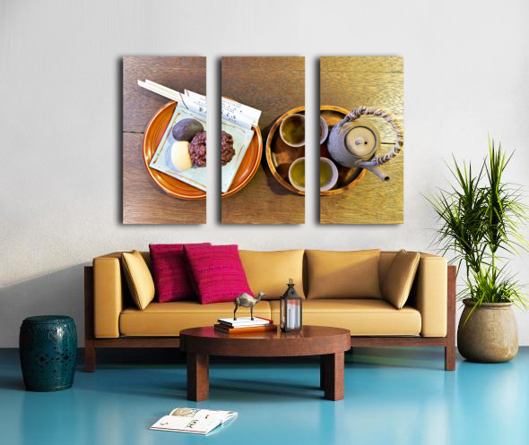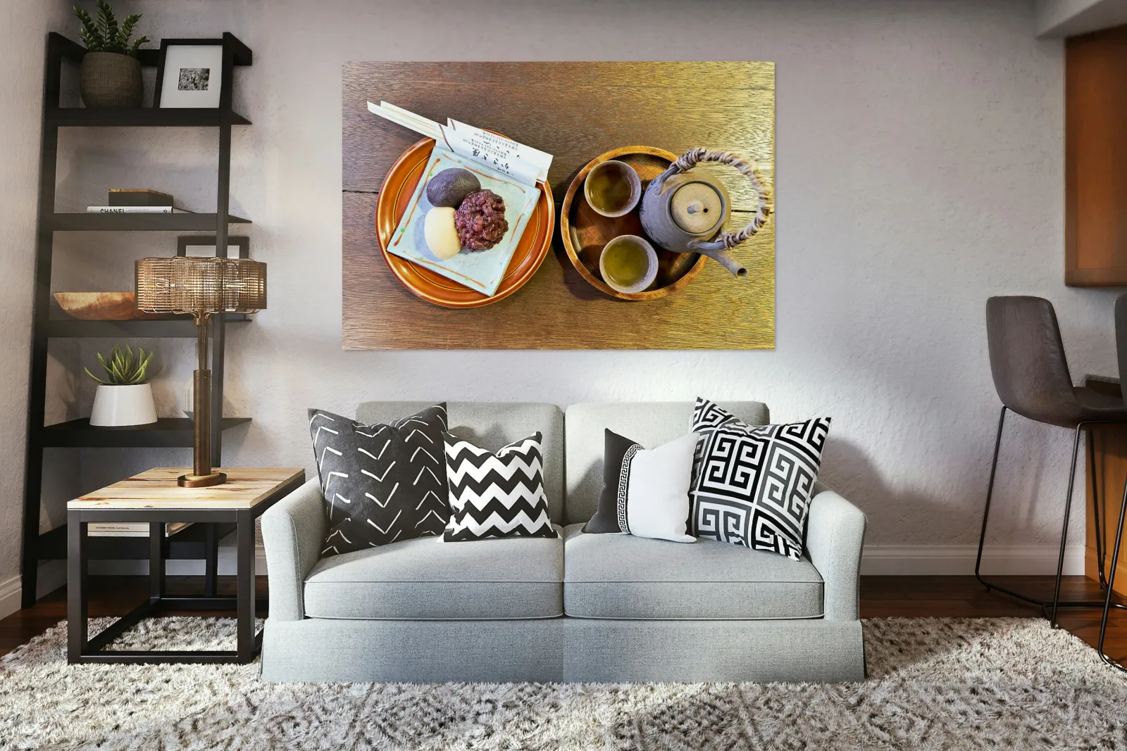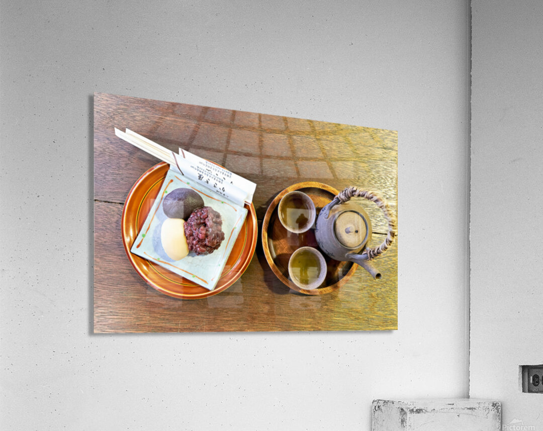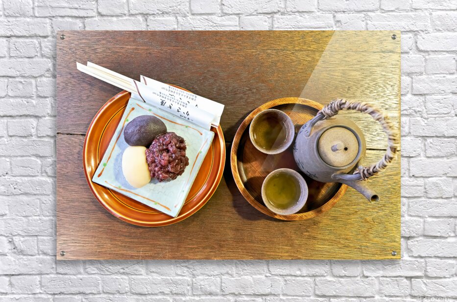 People enjoy traditional sweets and green tea in a shop in Higashiyama Kyoto. The setting features wooden trays and utensils.