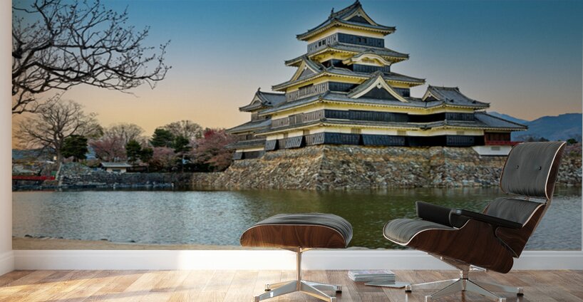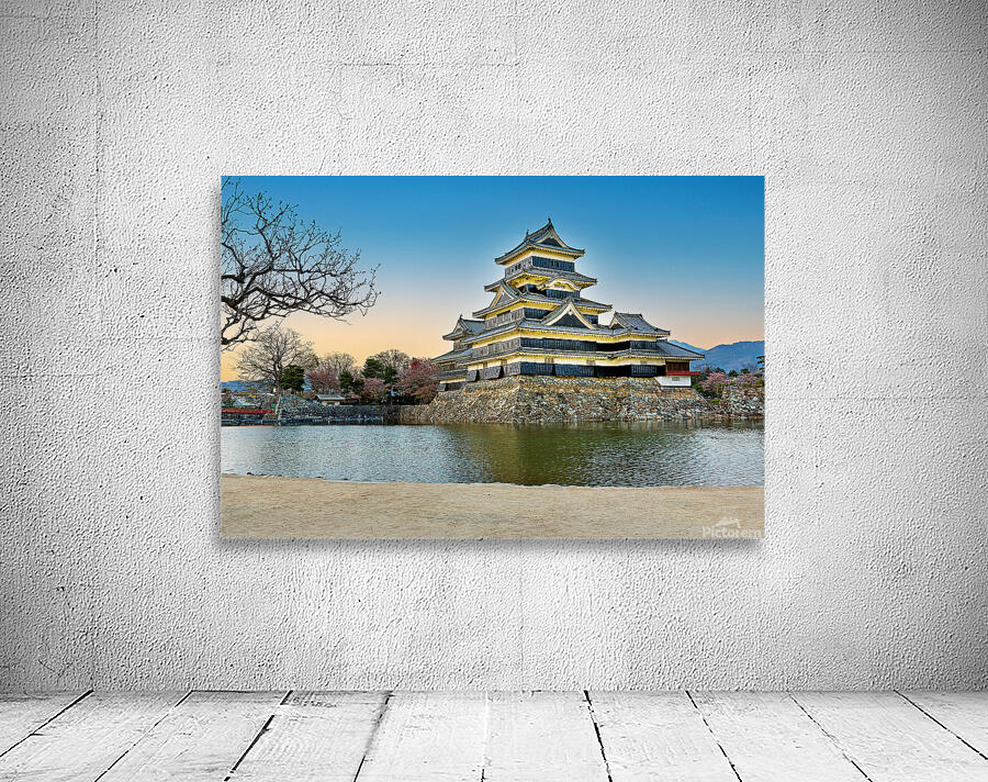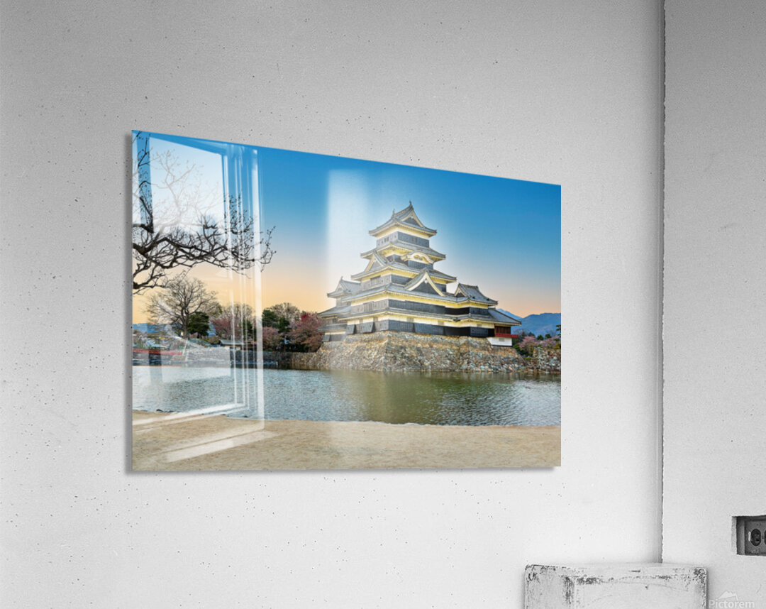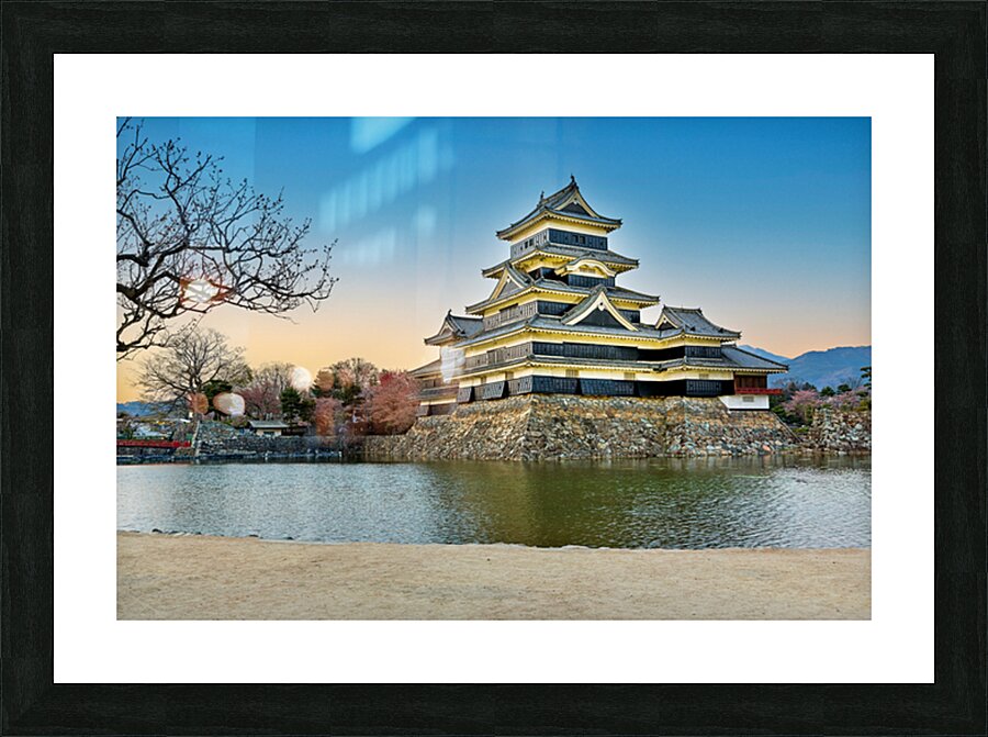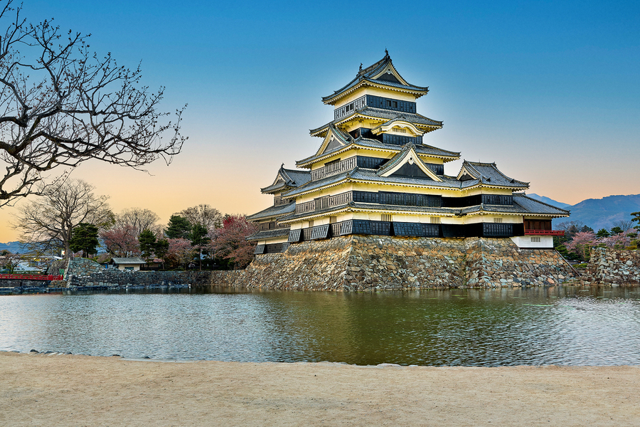 Matsumoto Castle is seen with a clear sky at sunset. The water reflects the castle and trees are present nearby.
