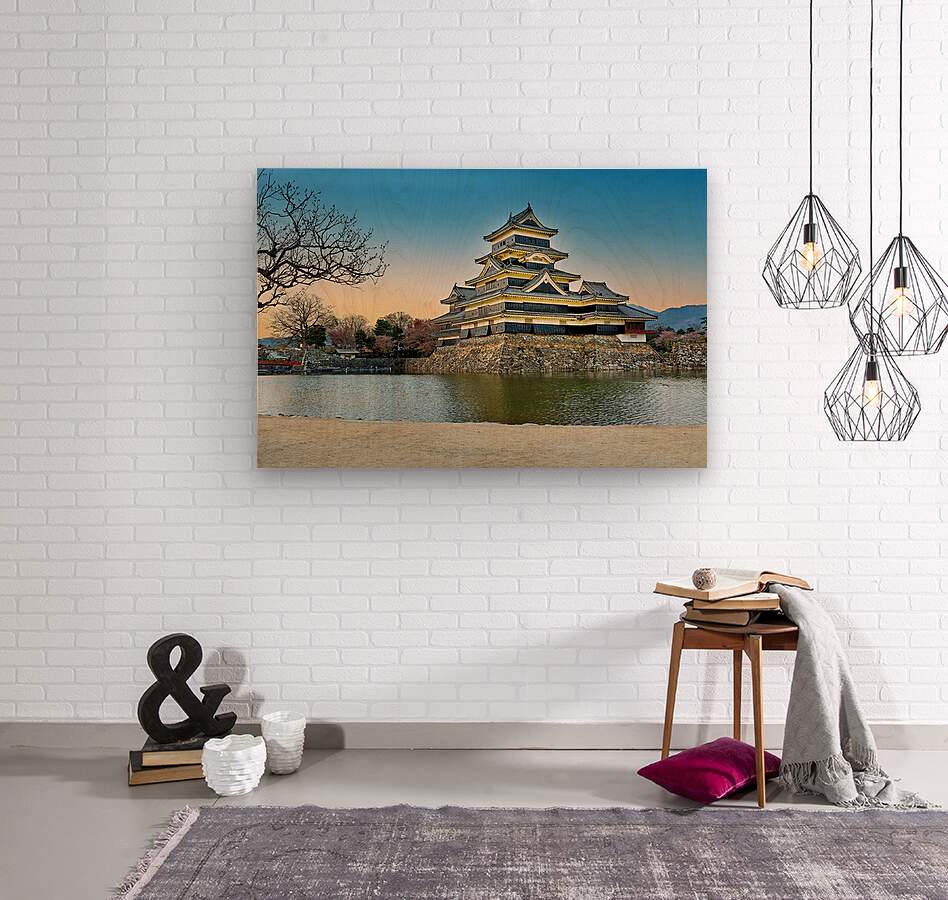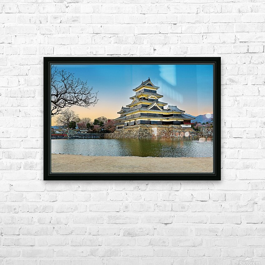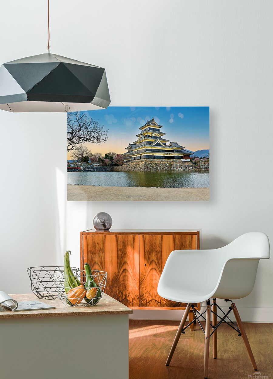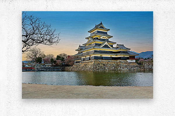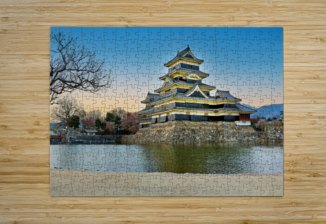Matsumoto Castle is seen with a clear sky at sunset. The water reflects the castle and trees are present nearby.
