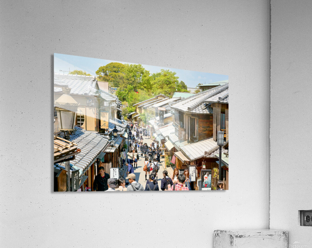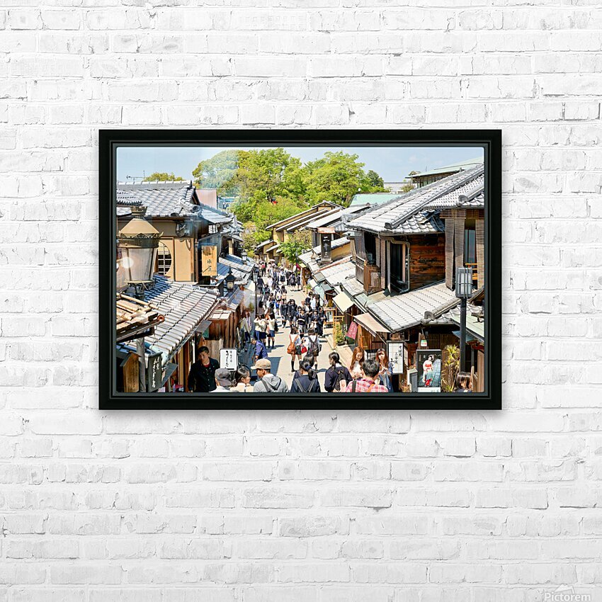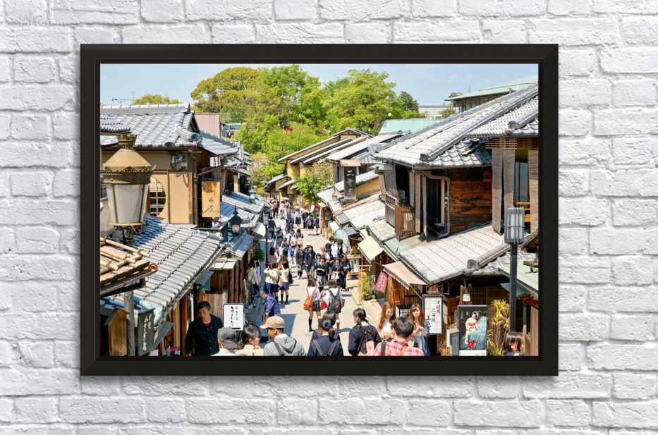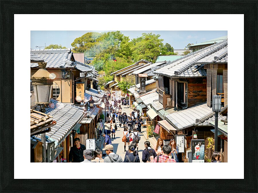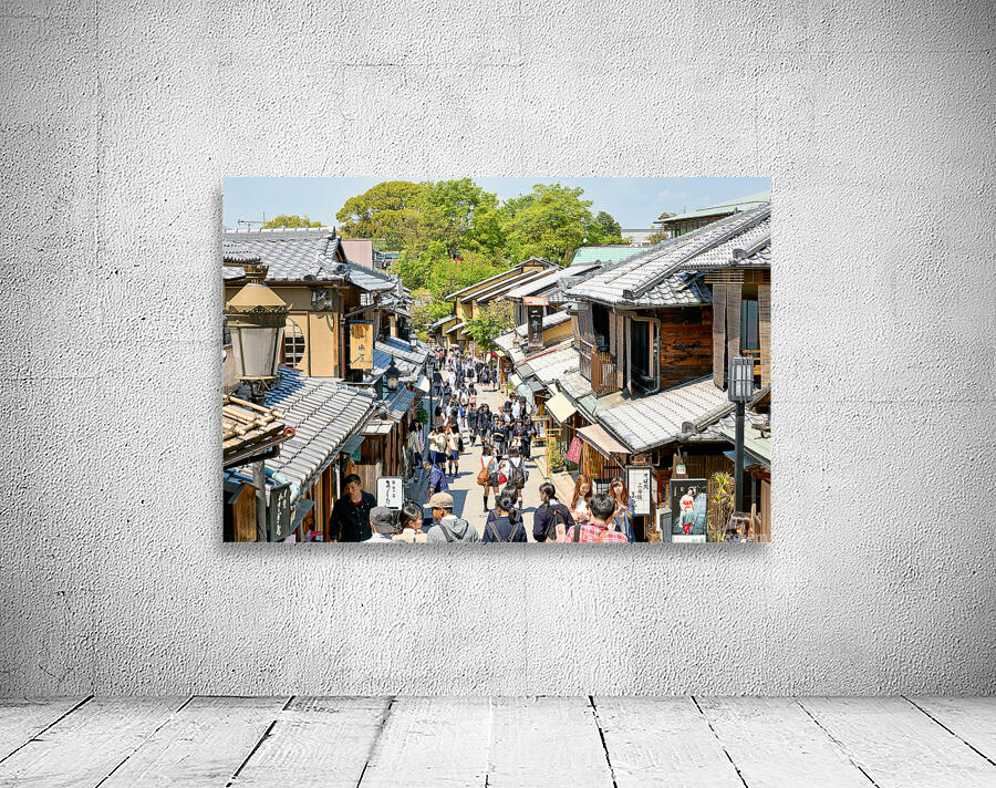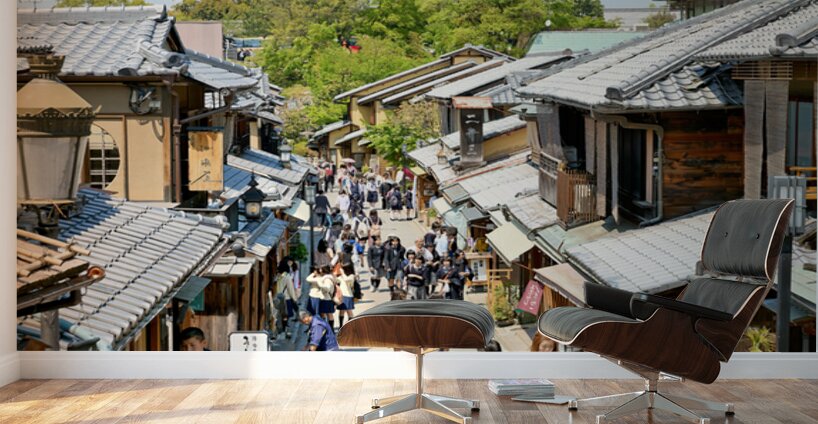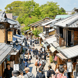 Many people stroll along the streets of Higashiyama district in Kyoto. The area features traditional wooden buildings and shops.