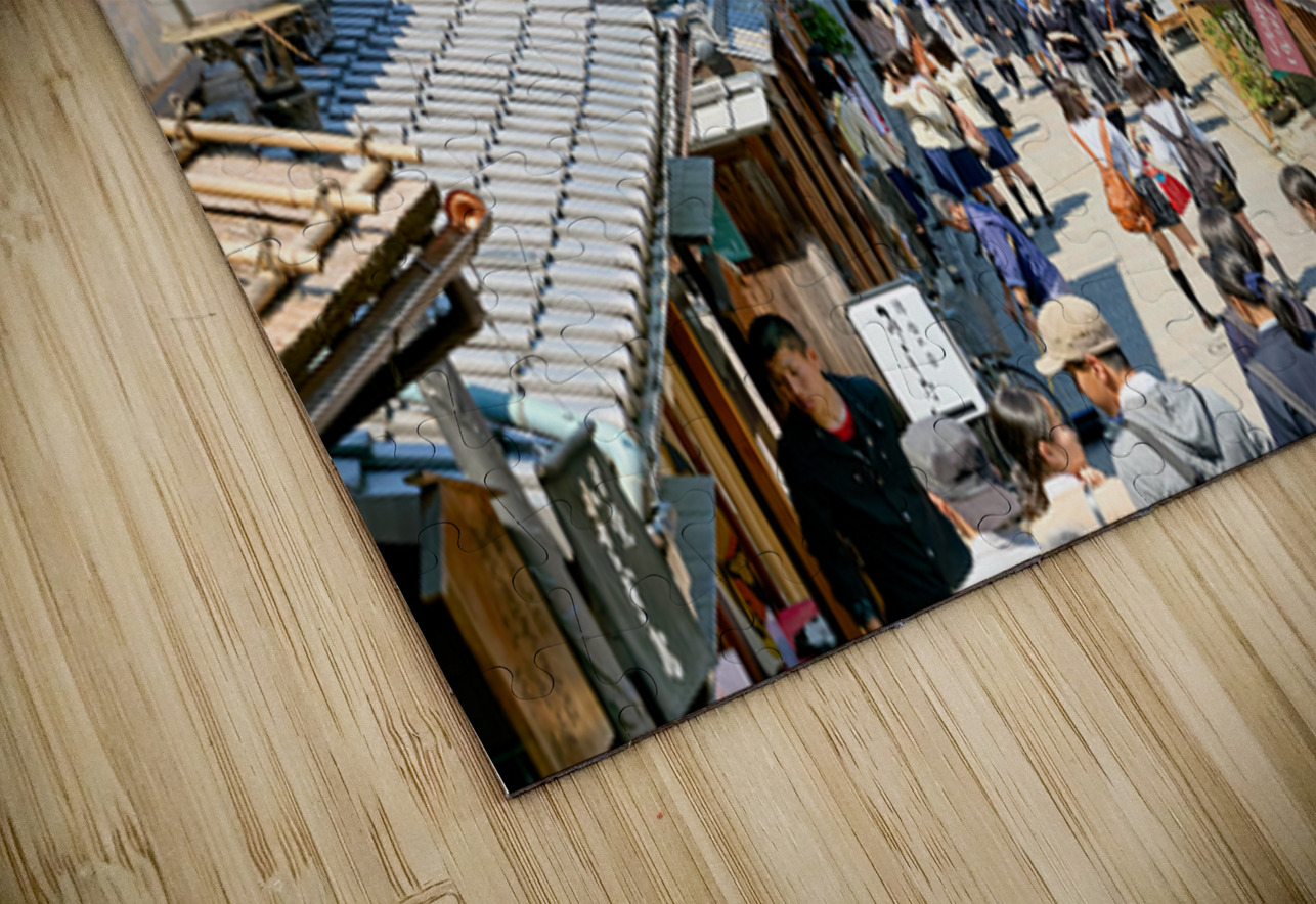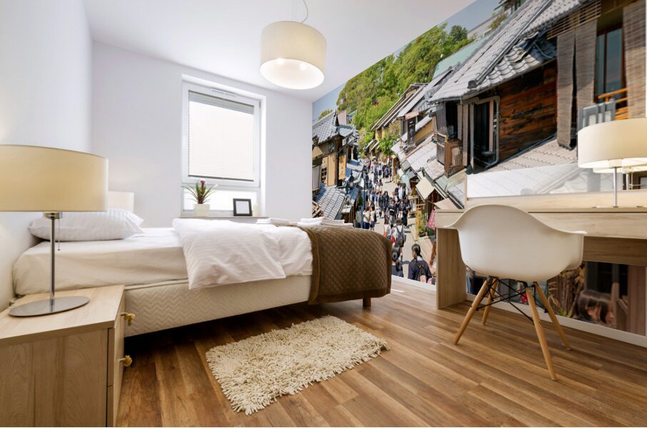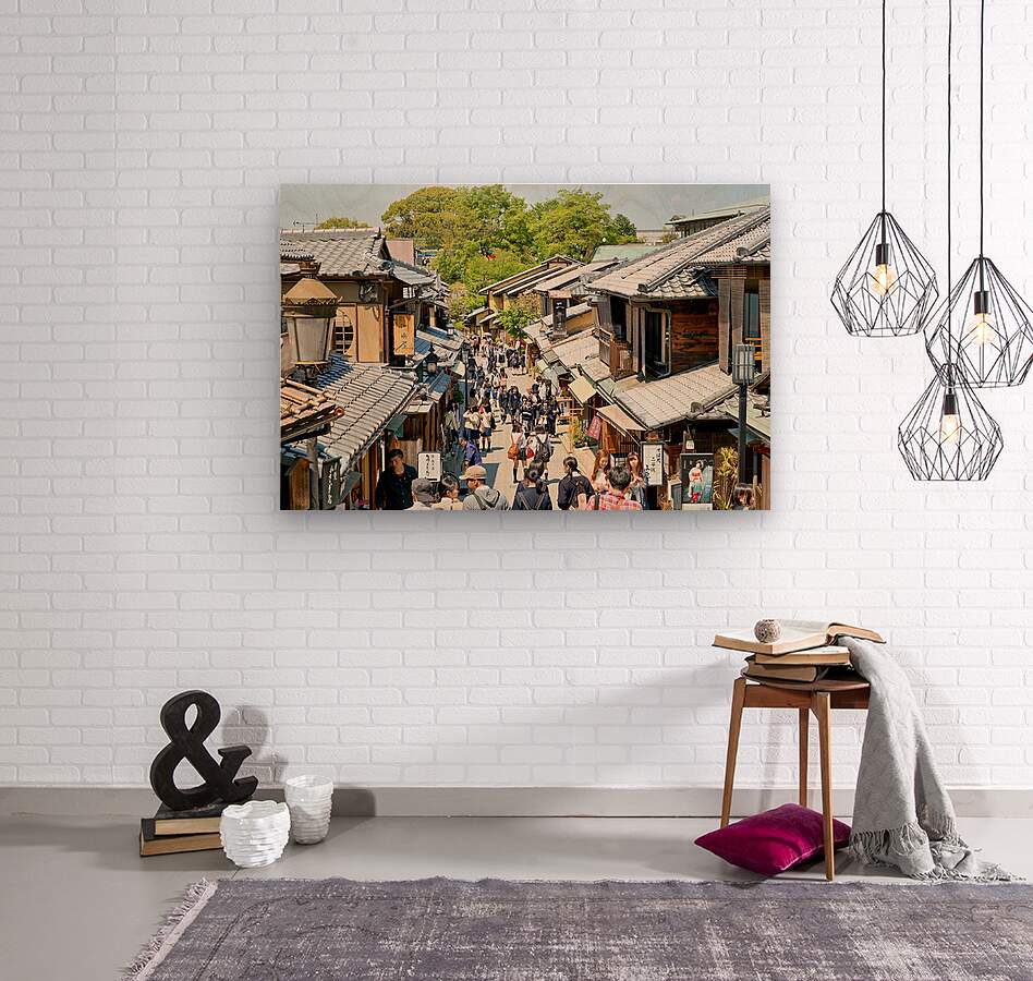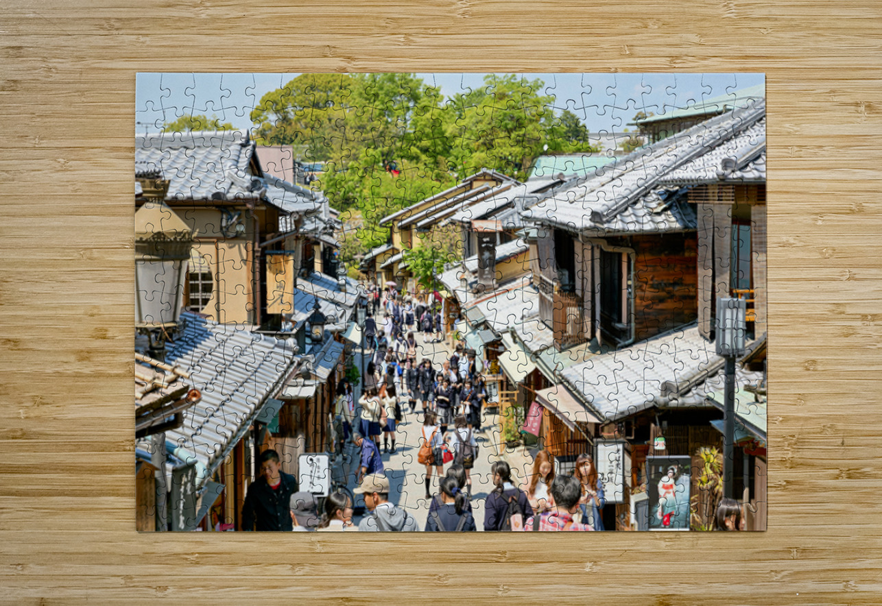 Many people stroll along the streets of Higashiyama district in Kyoto. The area features traditional wooden buildings and shops.