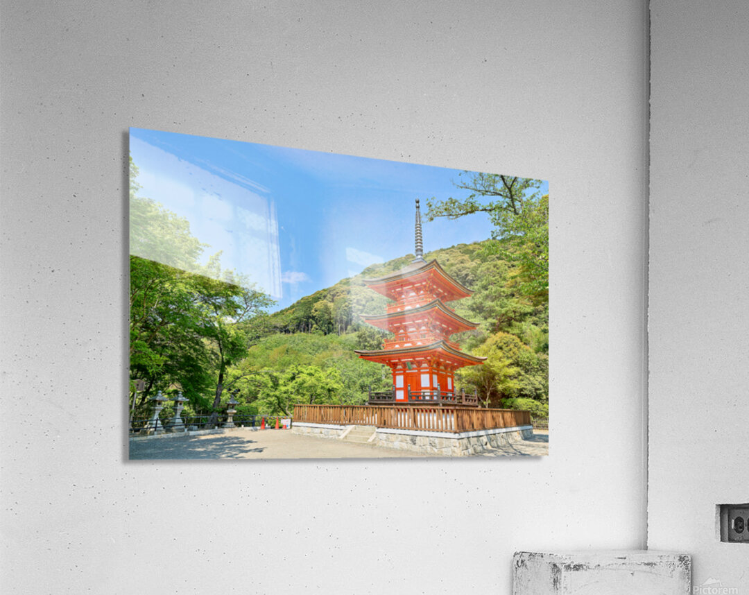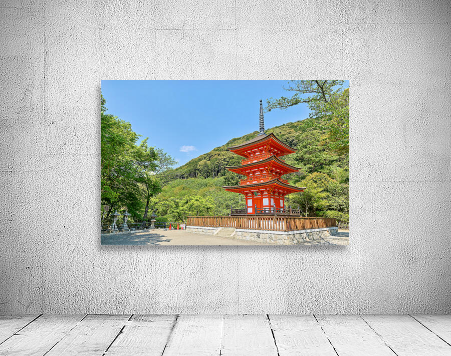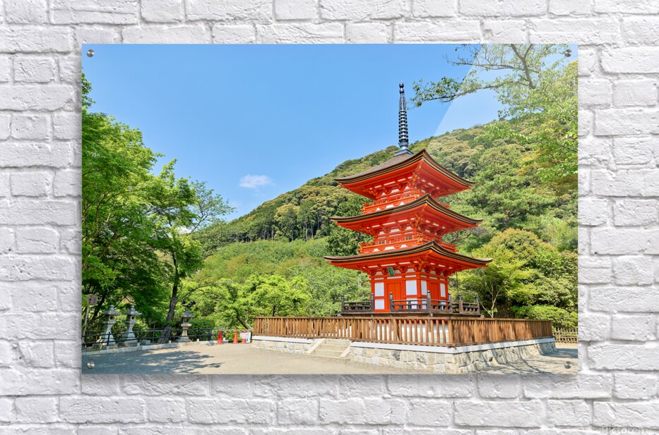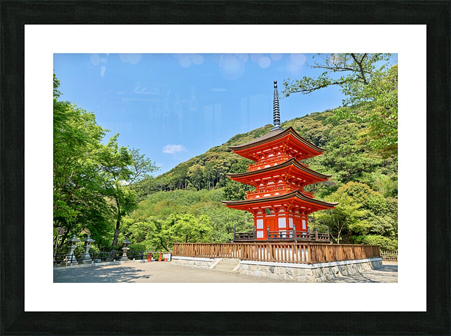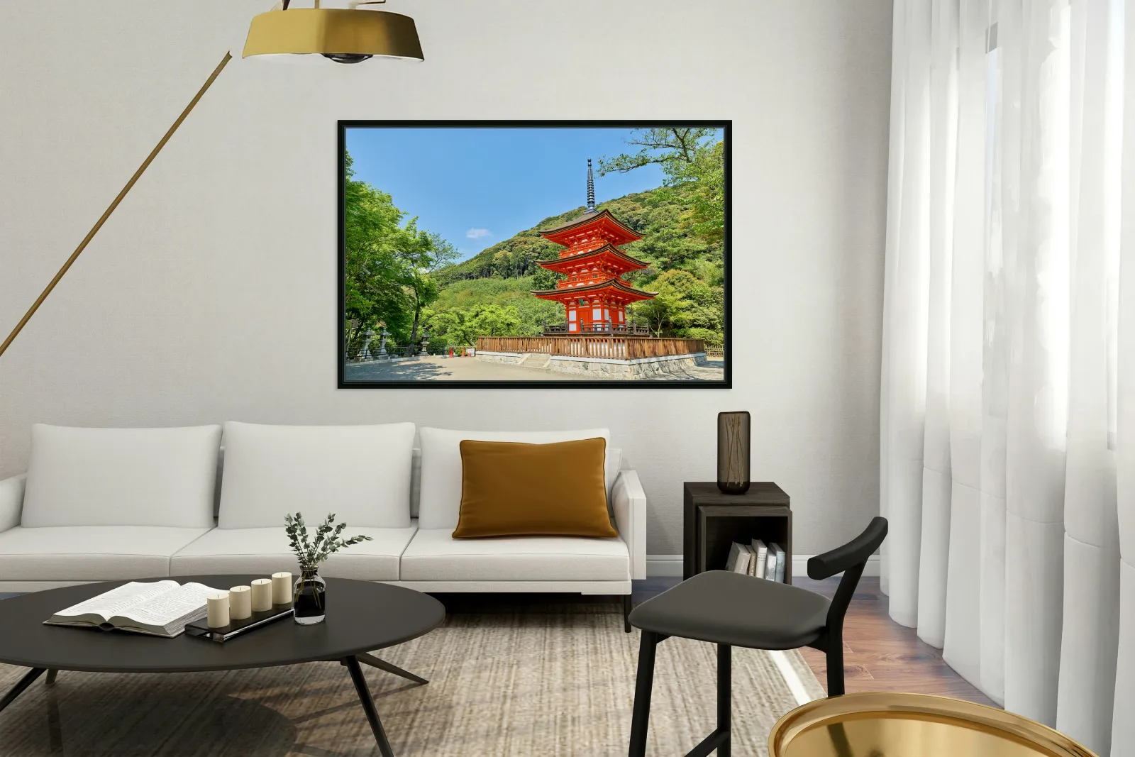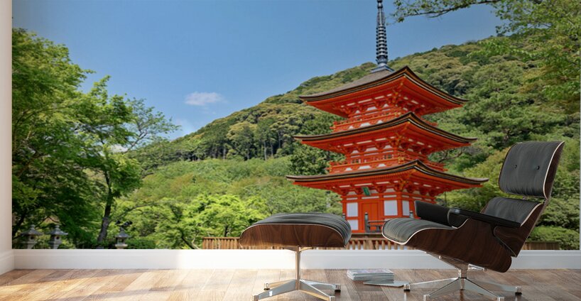Visitors explore the Koyasu Pagoda at Kiyomizu Dera Temple surrounded by green hills. The scene captures the traditional architecture against nature.