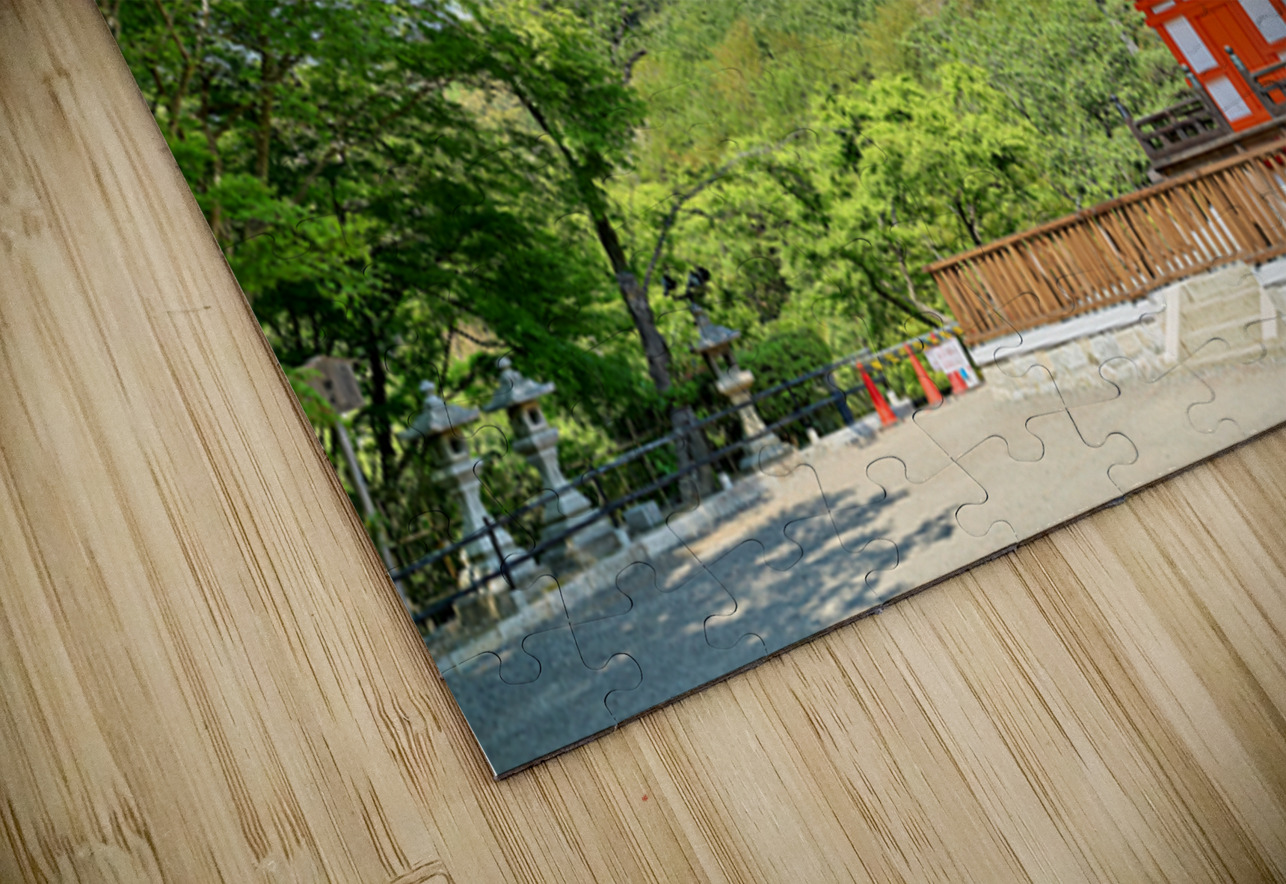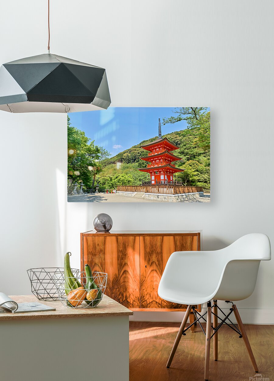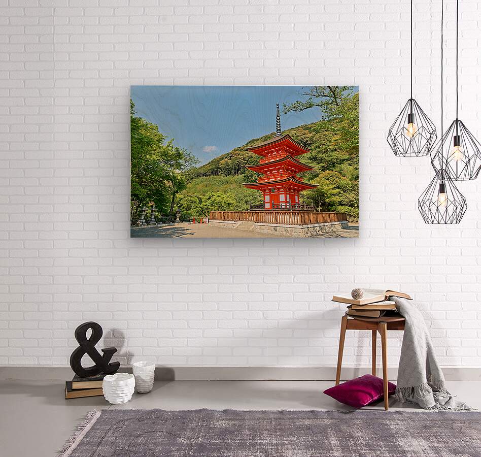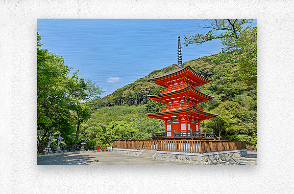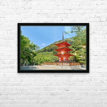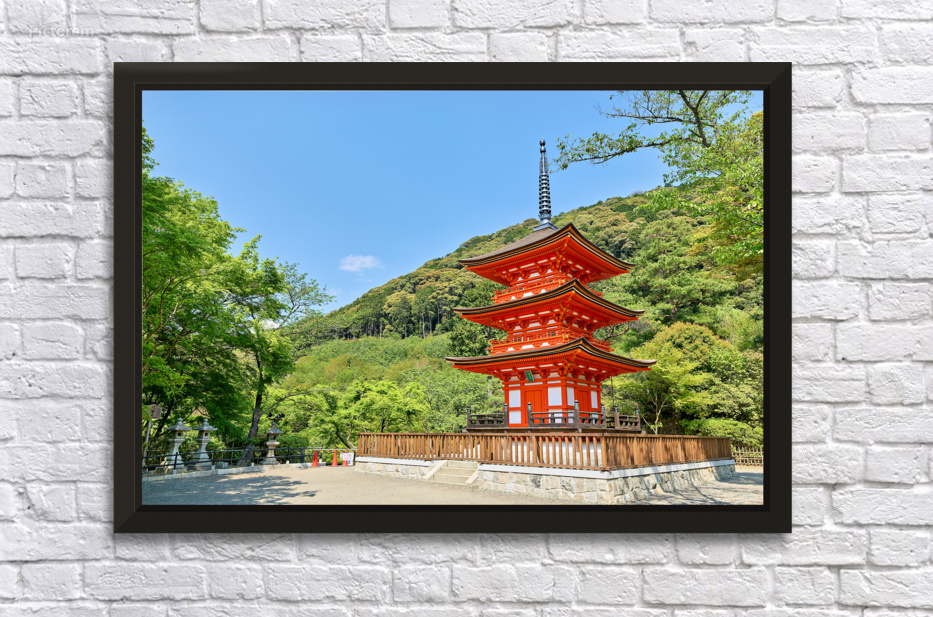 Visitors explore the Koyasu Pagoda at Kiyomizu Dera Temple surrounded by green hills. The scene captures the traditional architecture against nature.