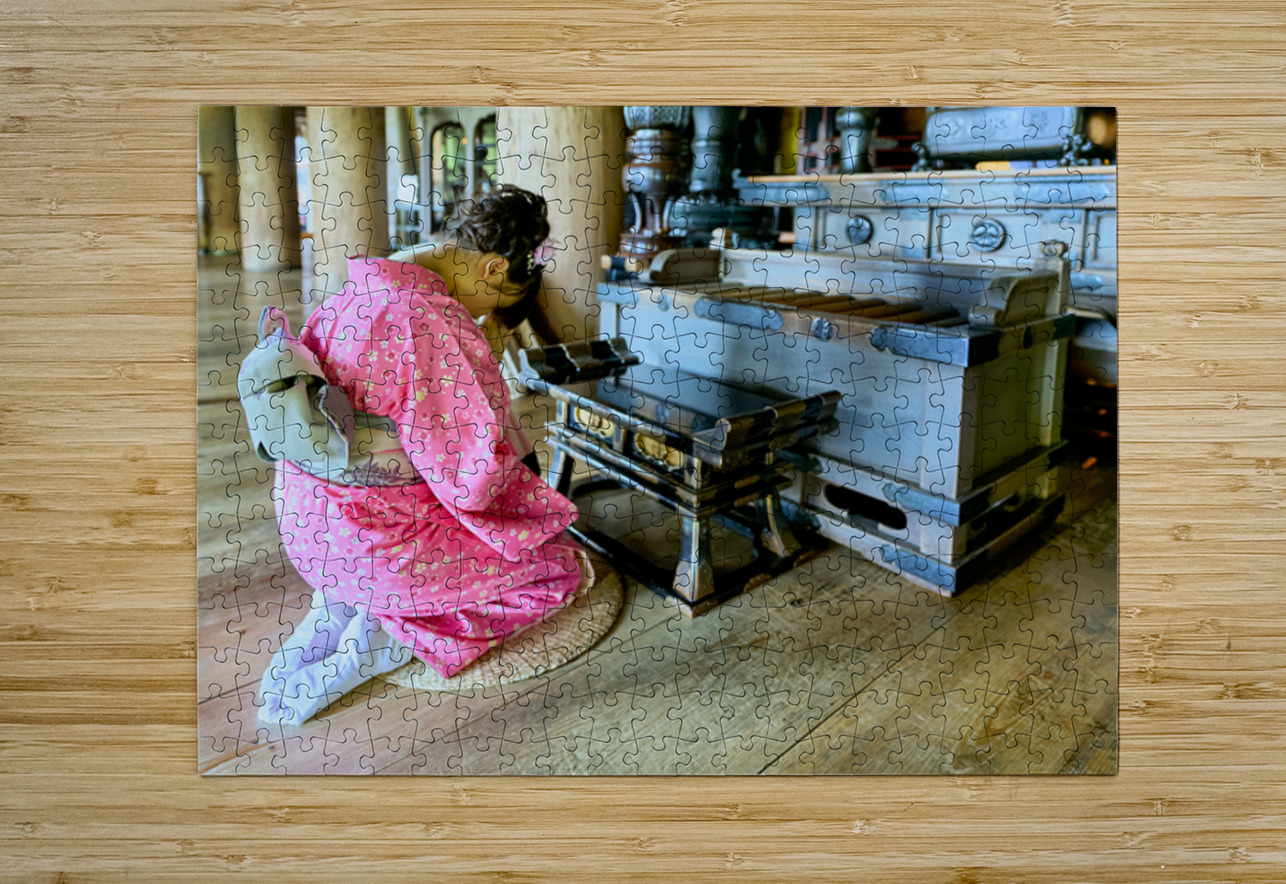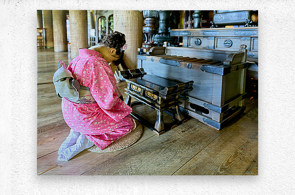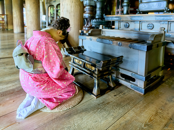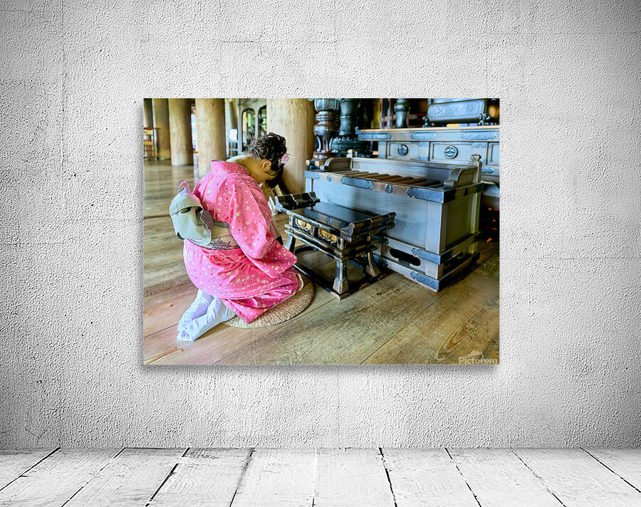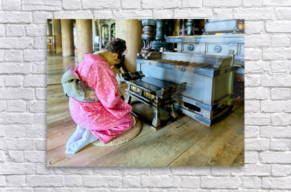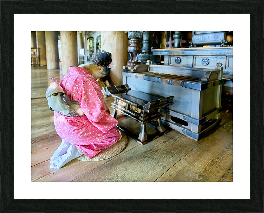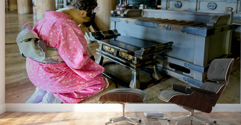 A young woman kneels in prayer at Kiyomizu Dera Temple in Kyoto Japan. She wears a traditional kimono and focuses on her devotion.