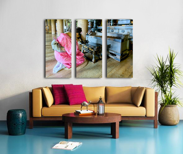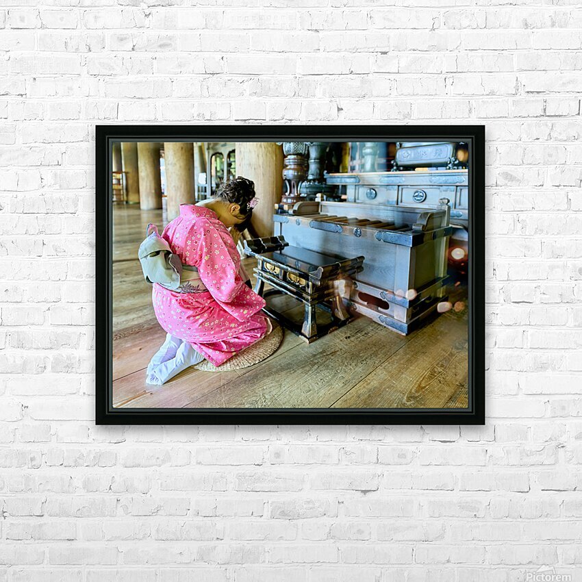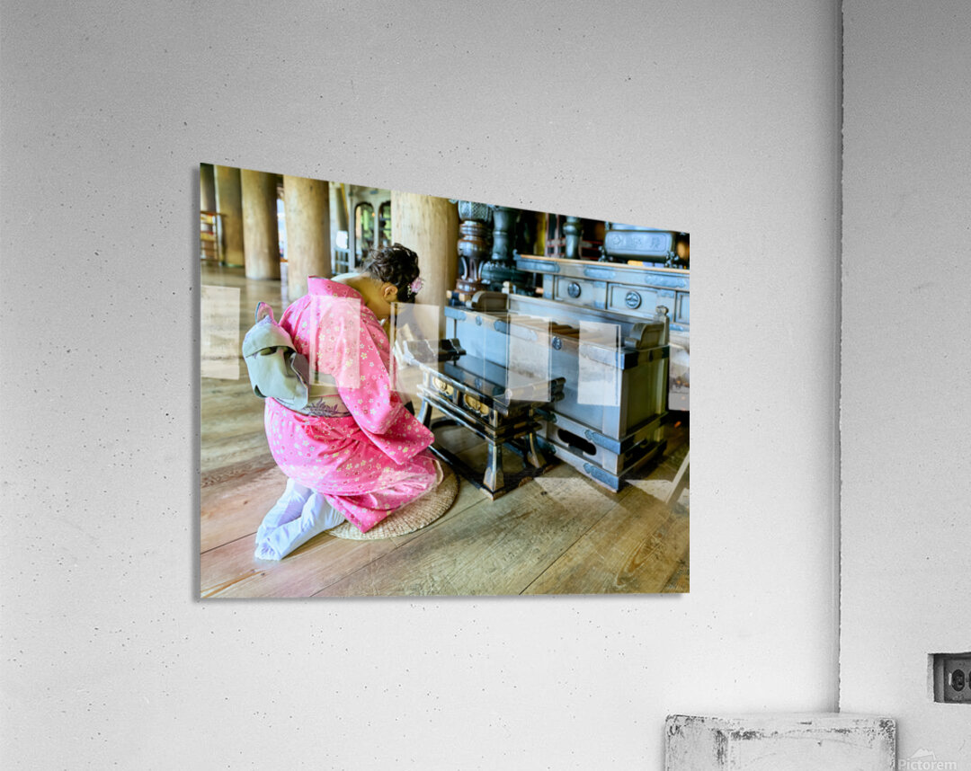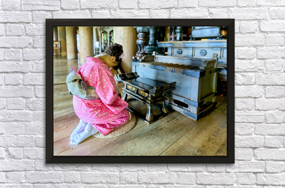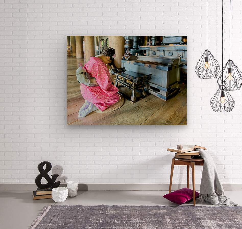 A young woman kneels in prayer at Kiyomizu Dera Temple in Kyoto Japan. She wears a traditional kimono and focuses on her devotion.
