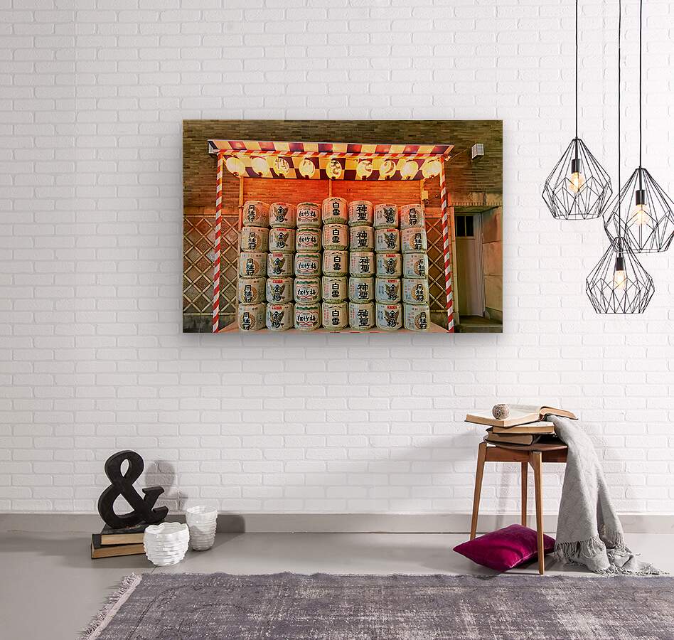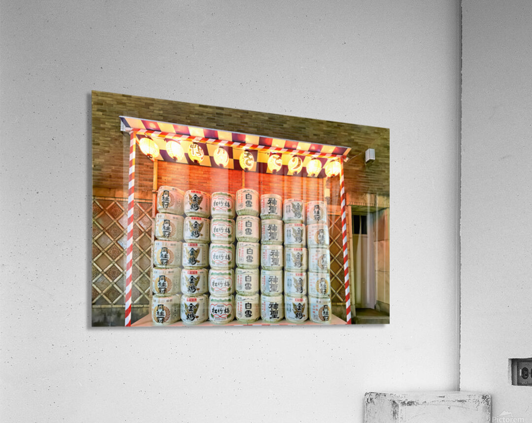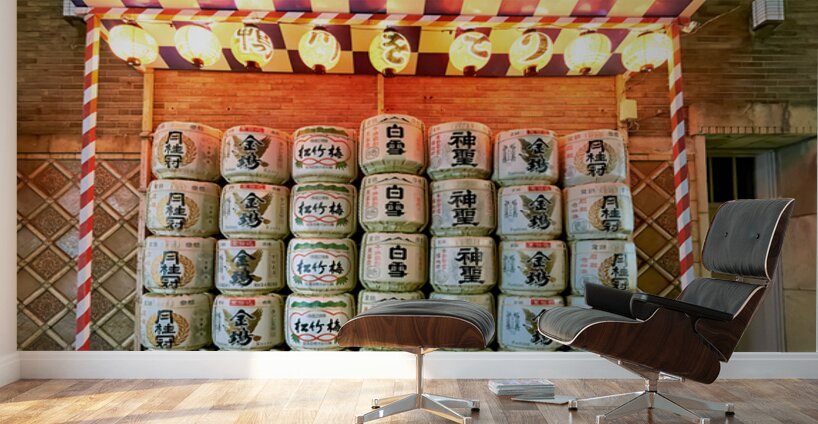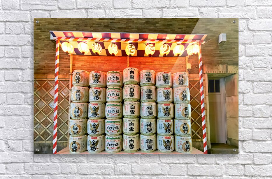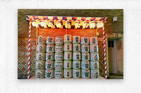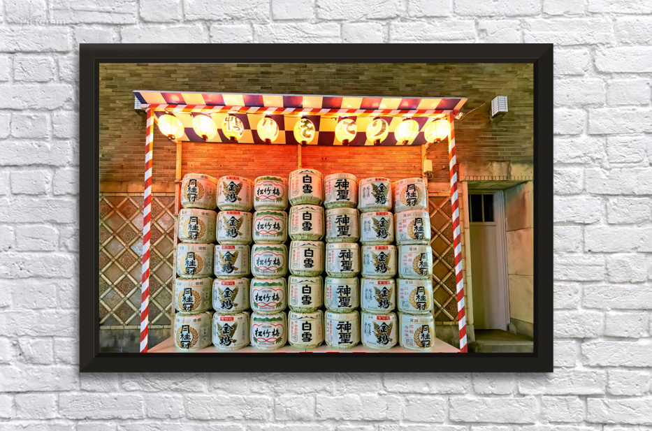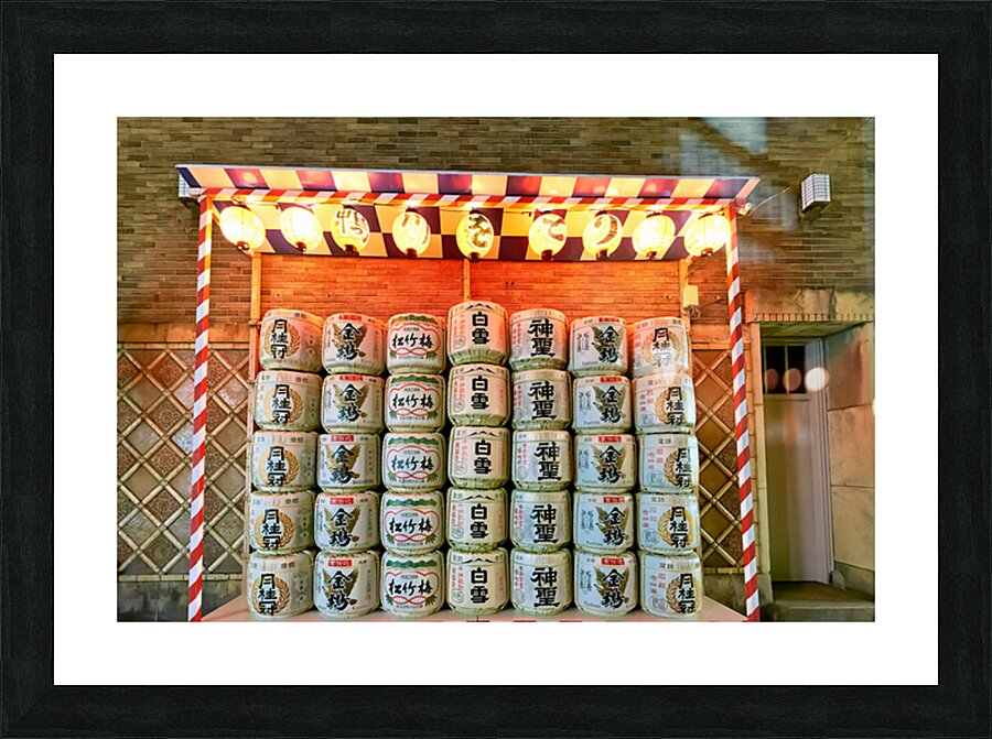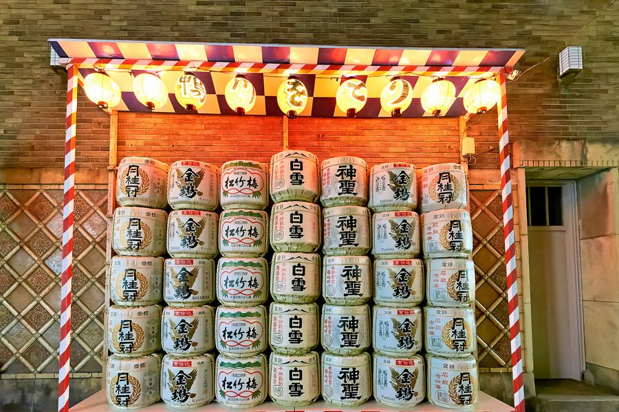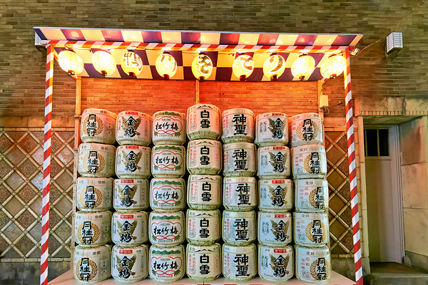 Sake barrels are stacked in a row in Gion district Kyoto. Lanterns hang above and create a warm glow during the night.