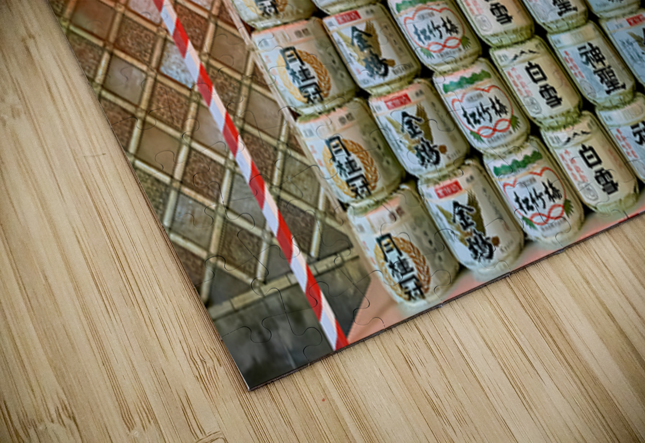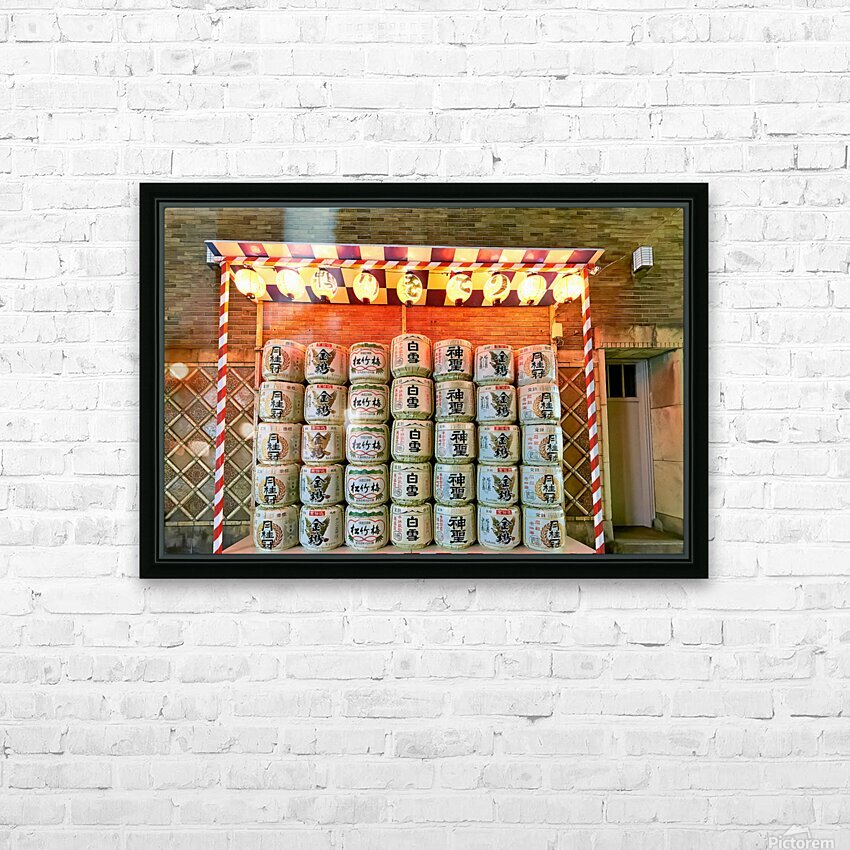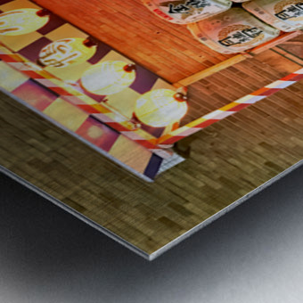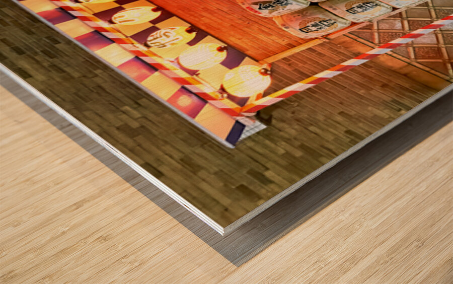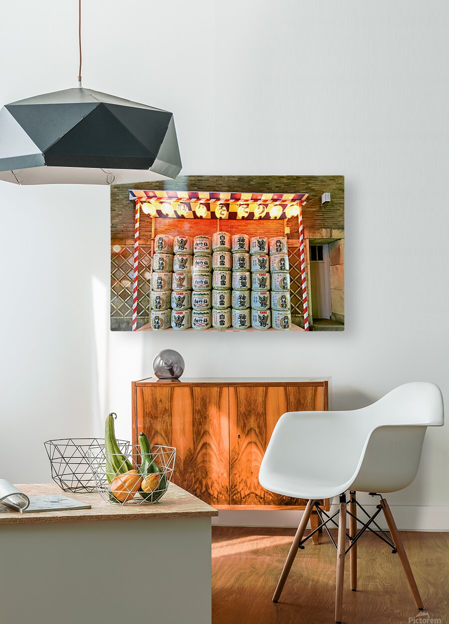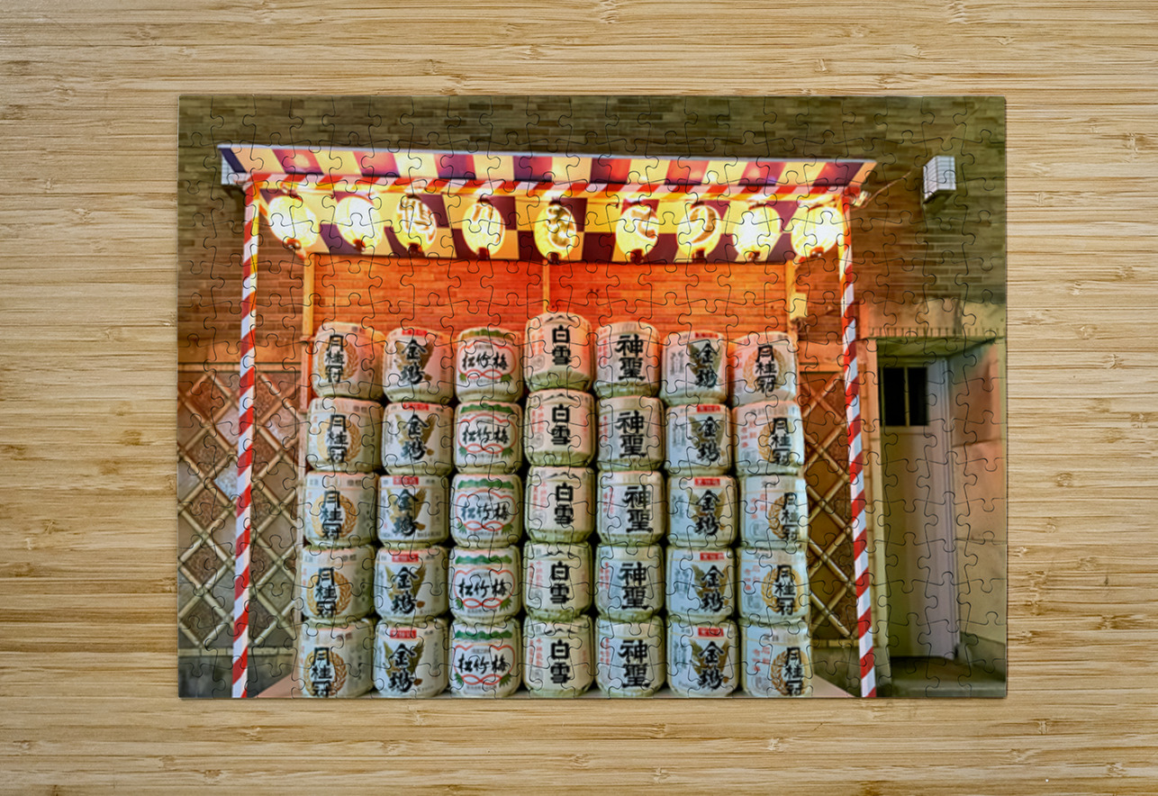 Sake barrels are stacked in a row in Gion district Kyoto. Lanterns hang above and create a warm glow during the night.