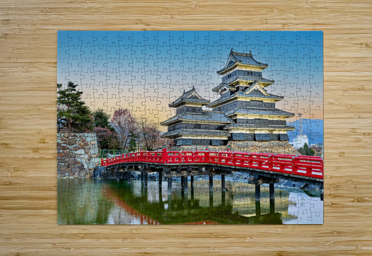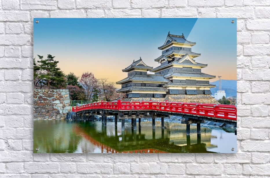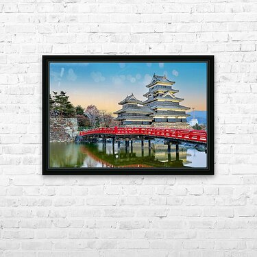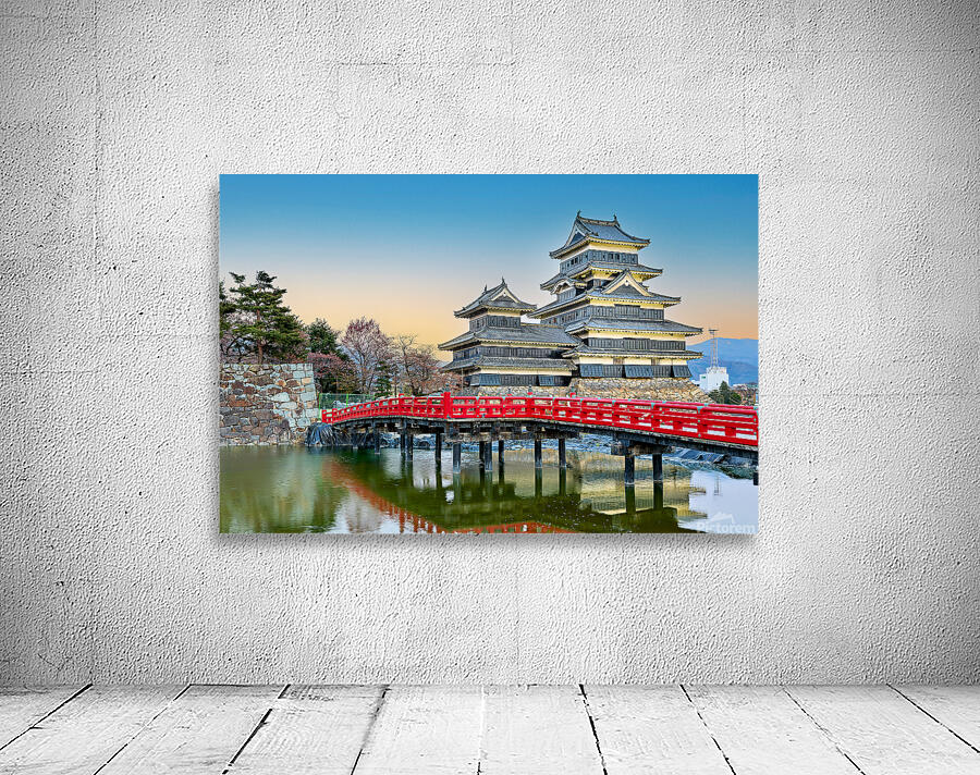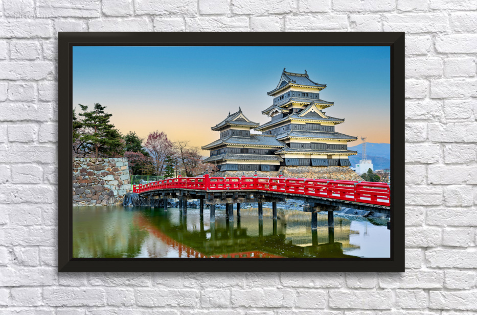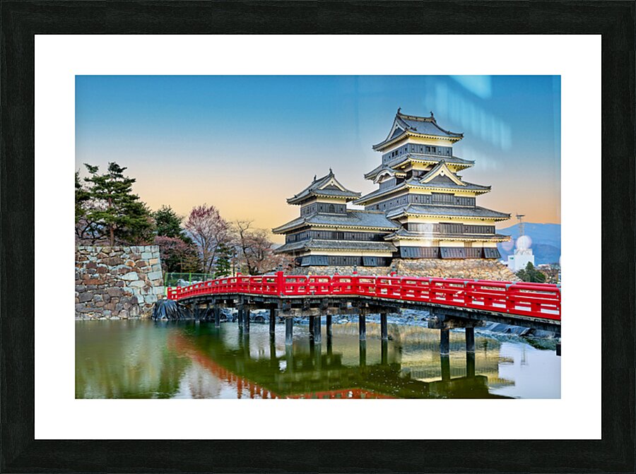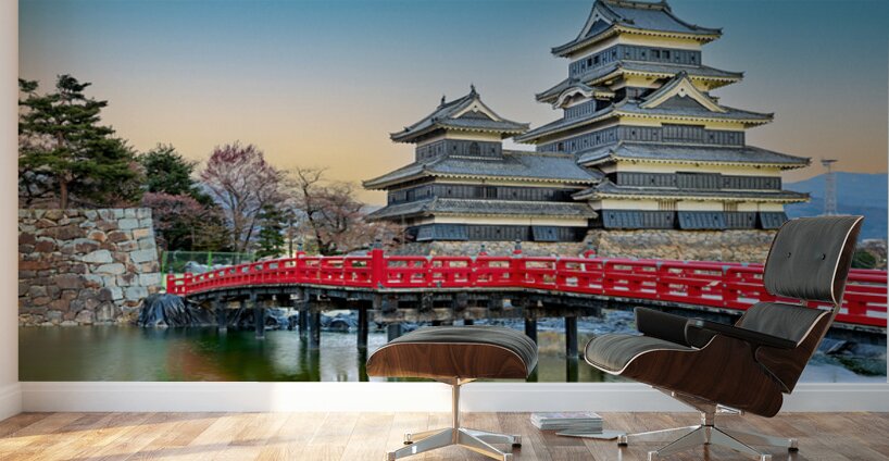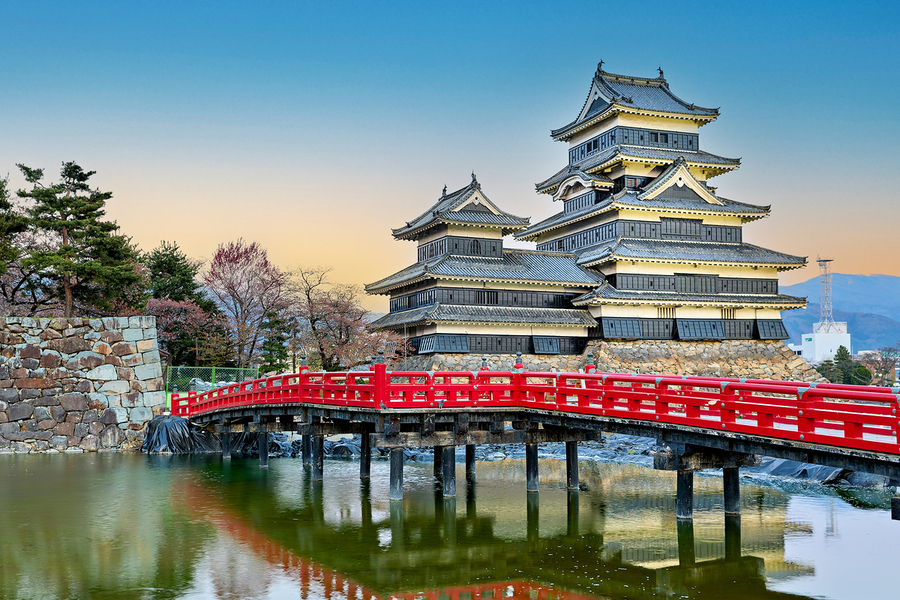 Matsumoto Castle stands by the water during sunset. The scene shows the castle and red bridge with trees in the background.
