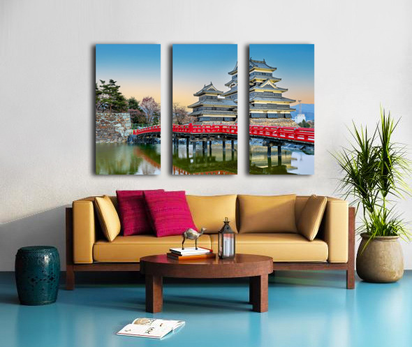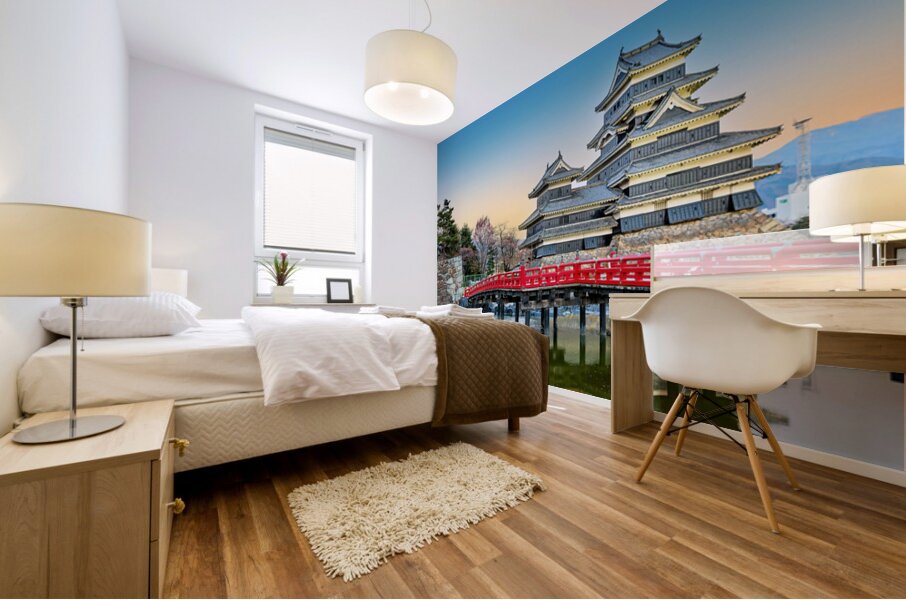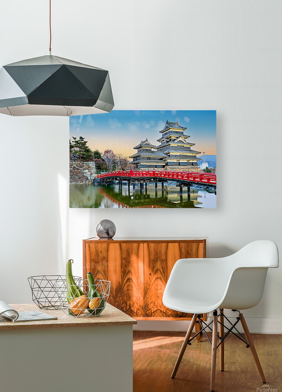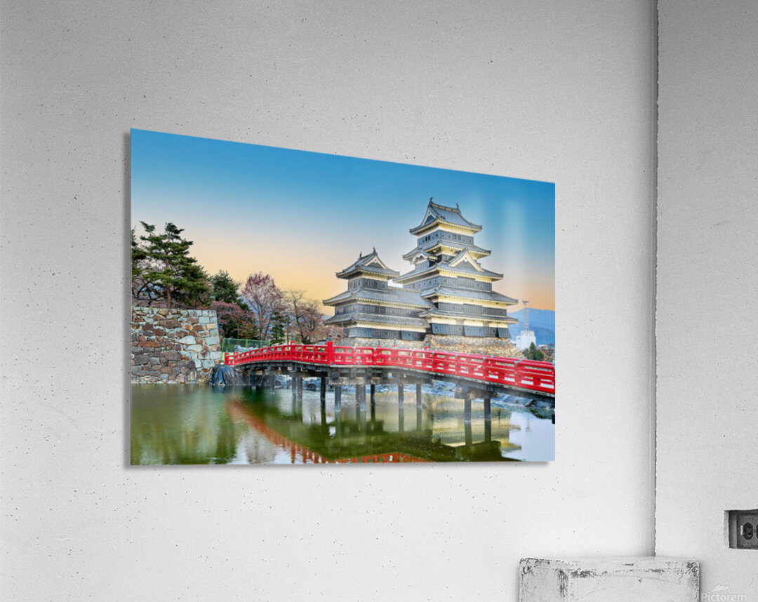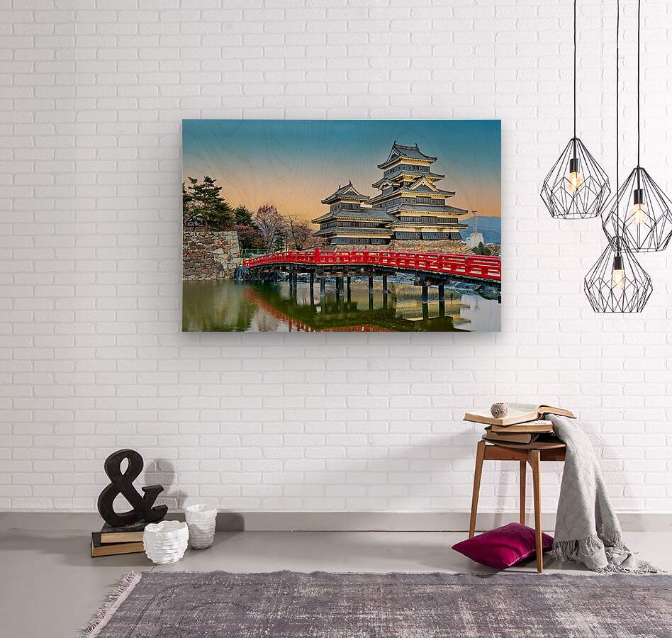 Matsumoto Castle stands by the water during sunset. The scene shows the castle and red bridge with trees in the background.