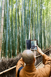 BUDDHIST MONK TAKES PICTURES IN ARASHIYAMA BAMBOO GROVE IN JAPAN