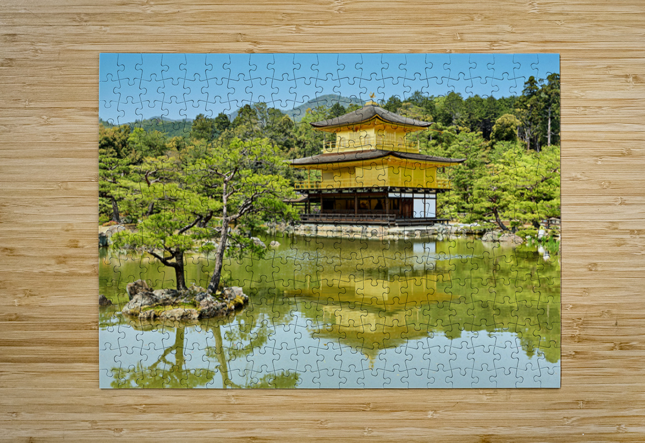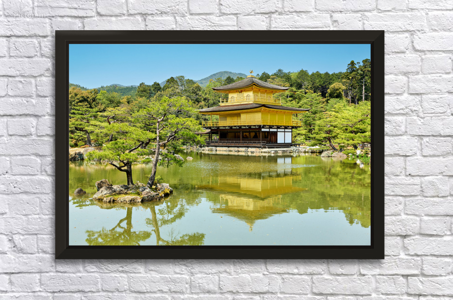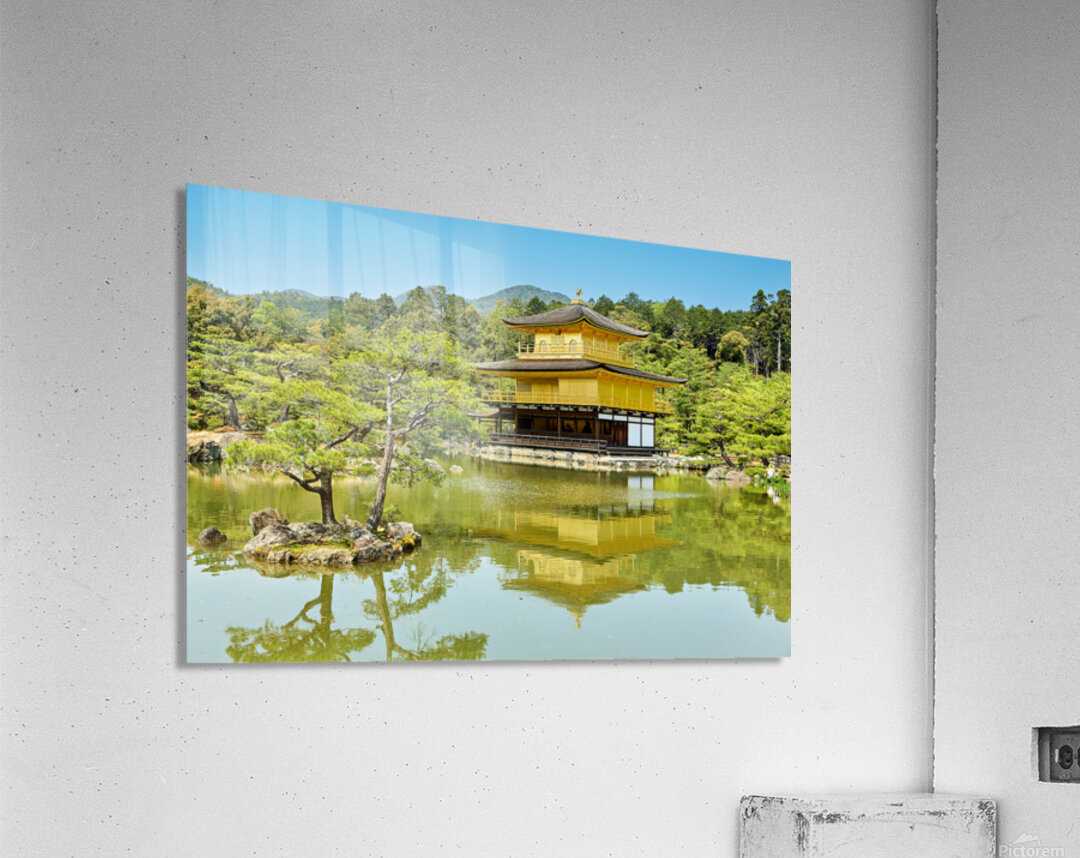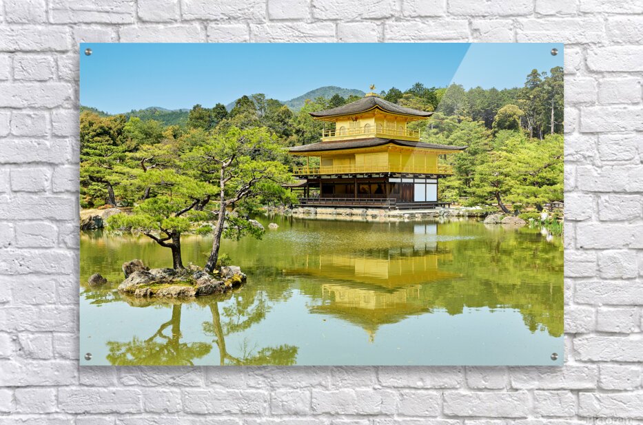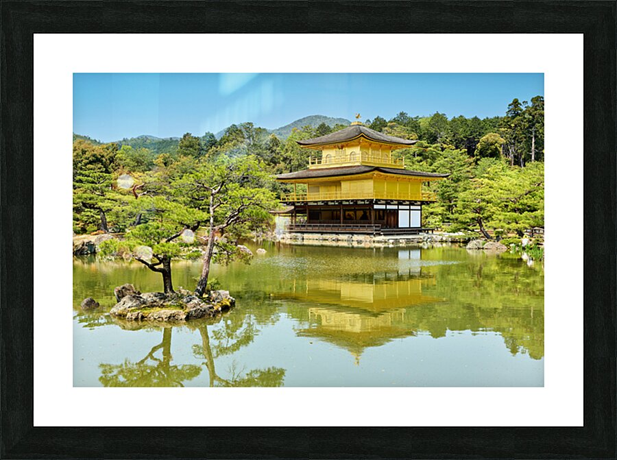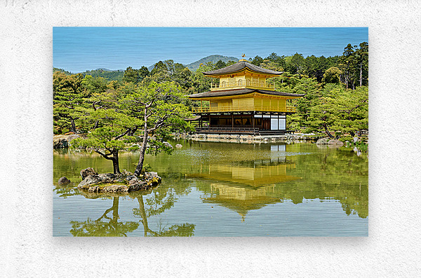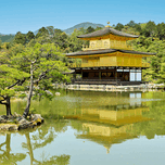 Kinkaku-ji Temple stands by a pond in Kyoto Japan. Trees and mountains surround the golden structure on a clear day.