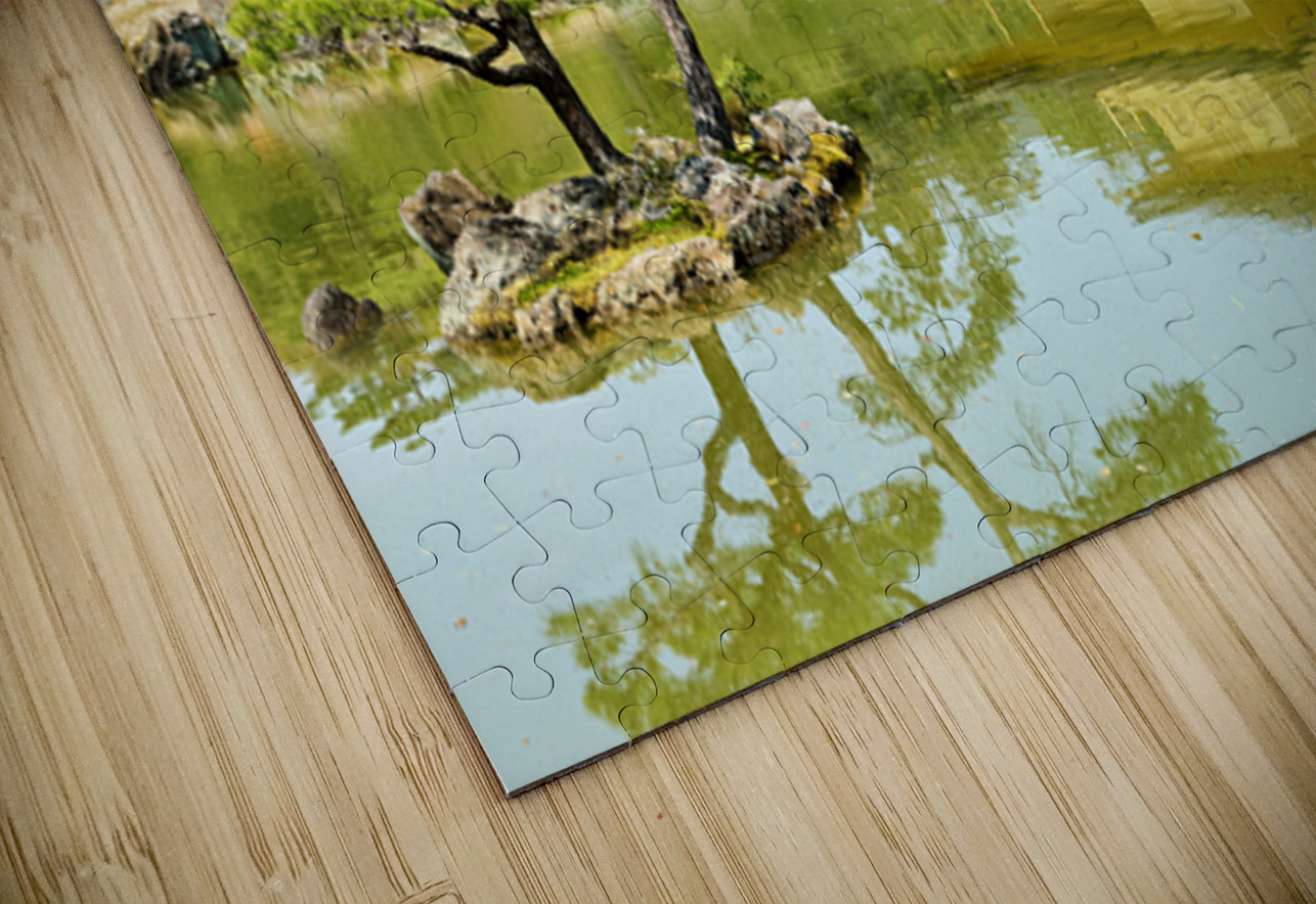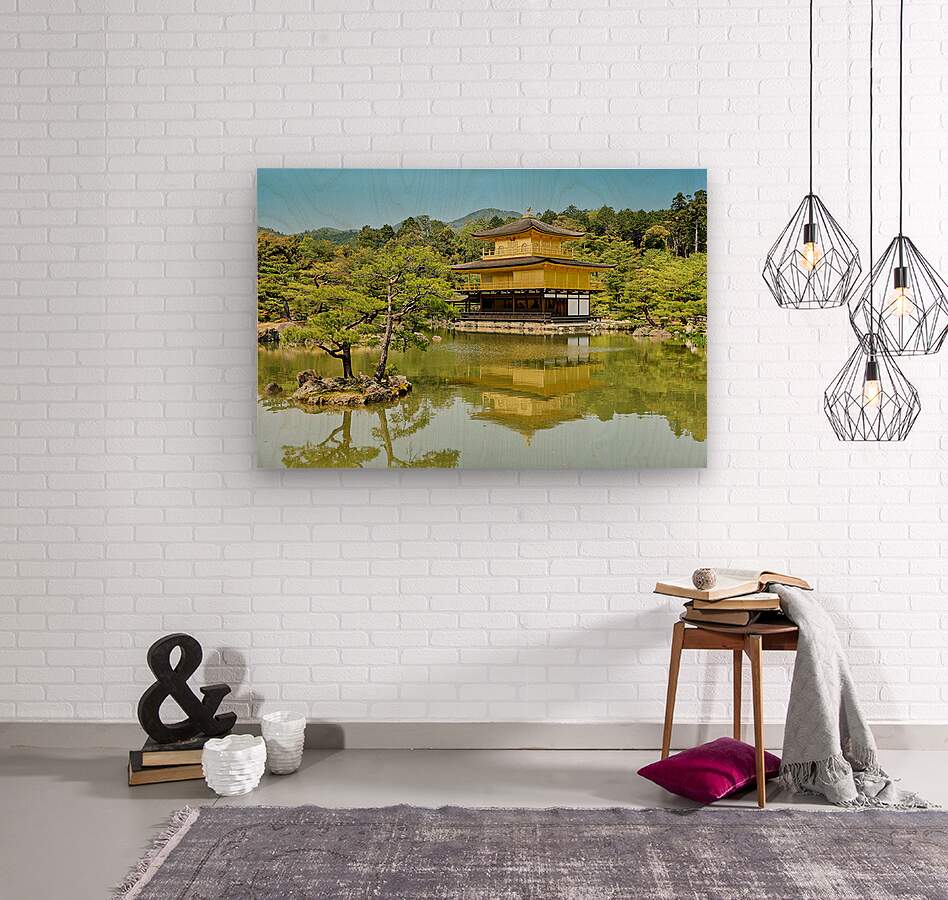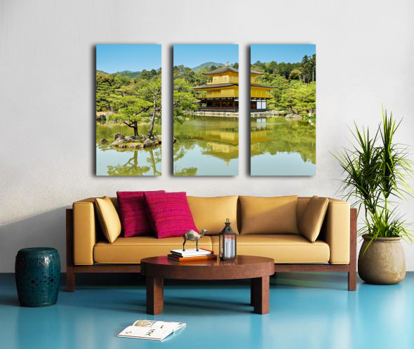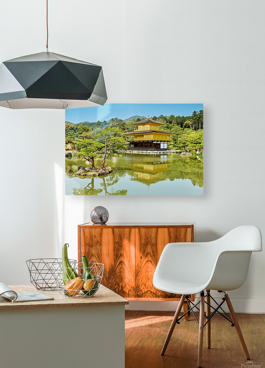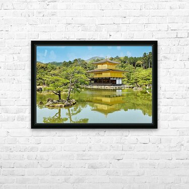 Kinkaku-ji Temple stands by a pond in Kyoto Japan. Trees and mountains surround the golden structure on a clear day.