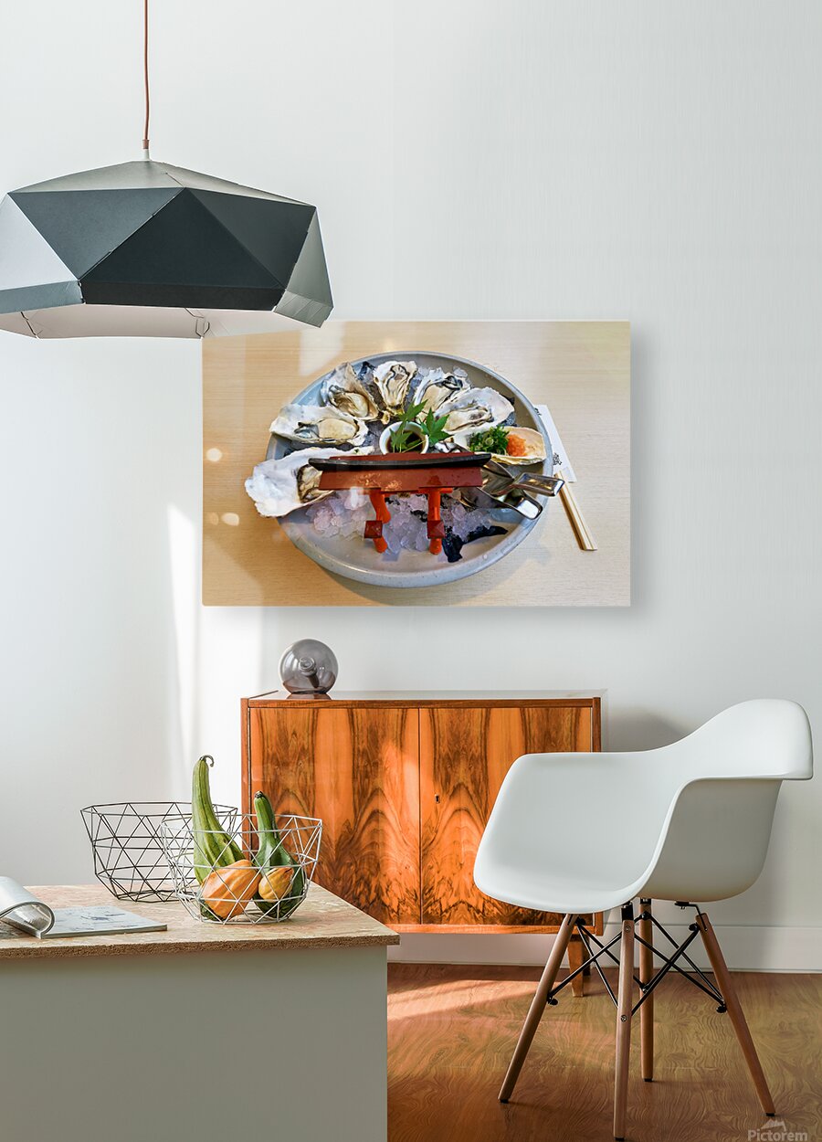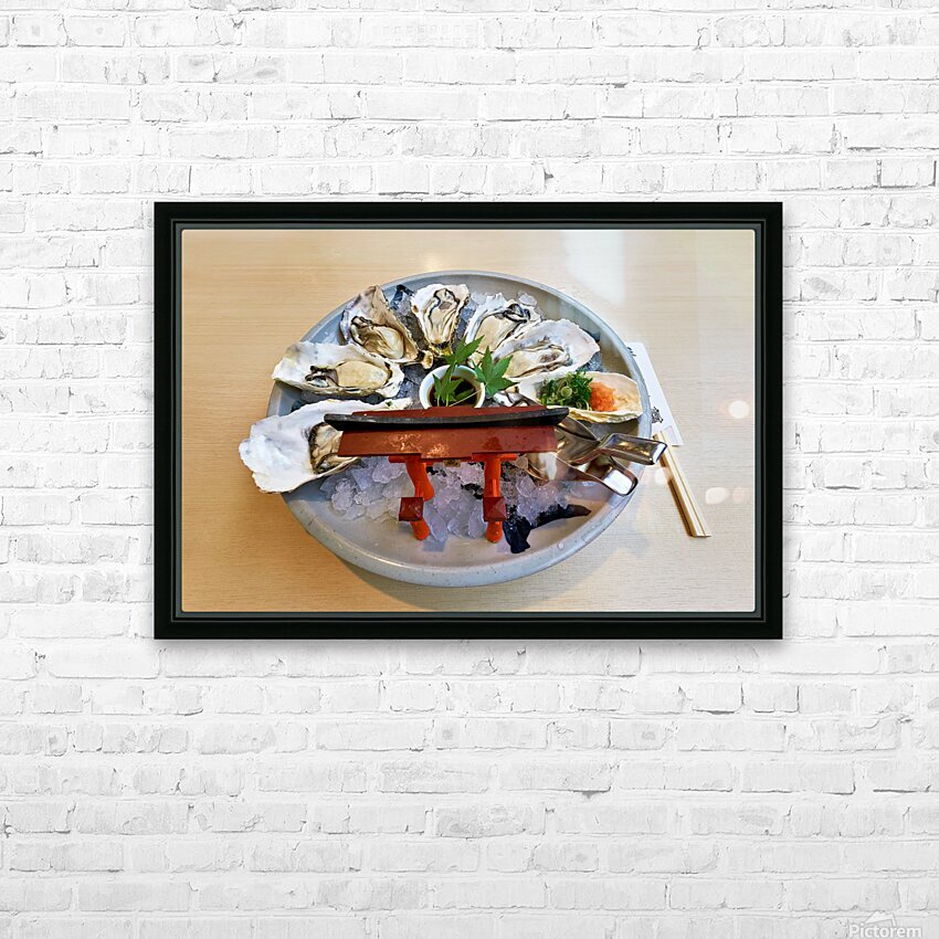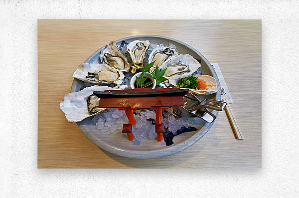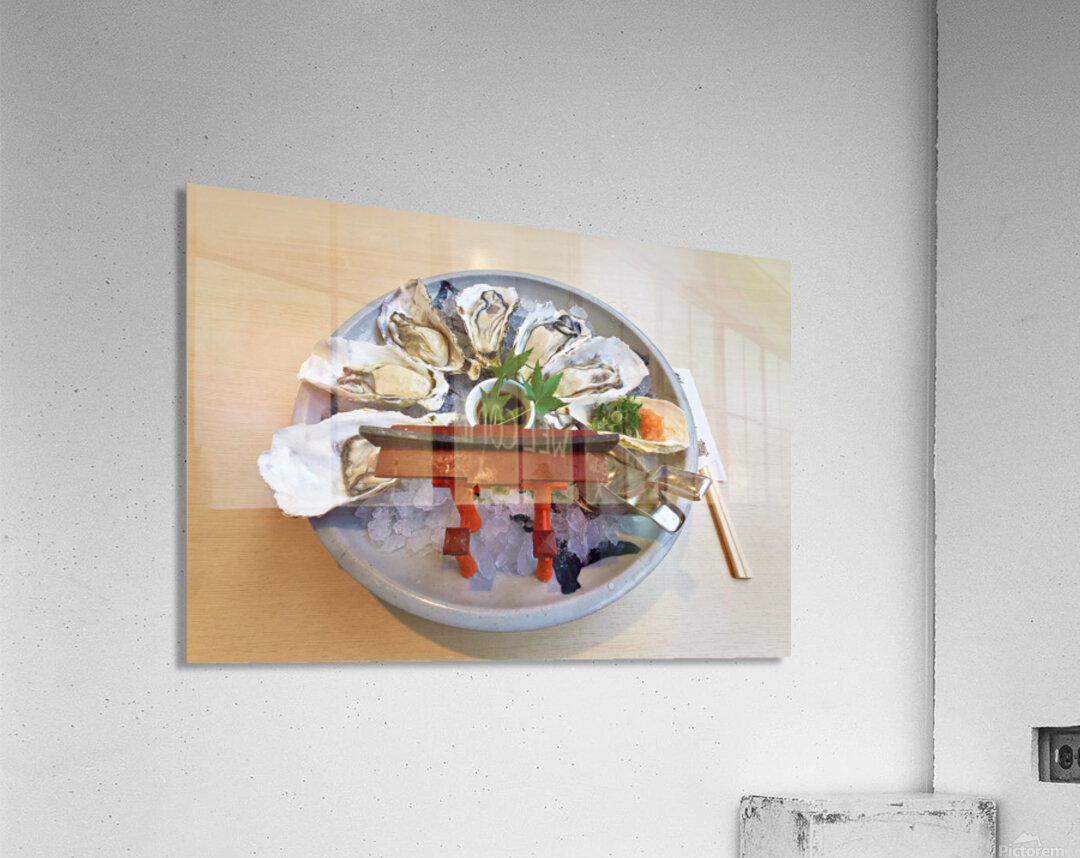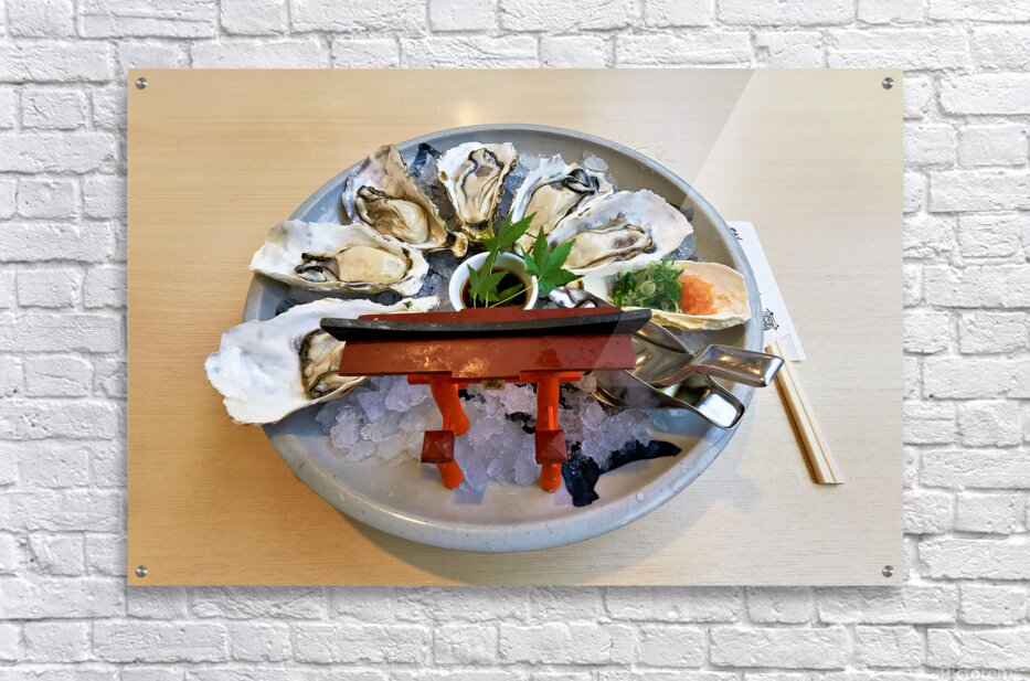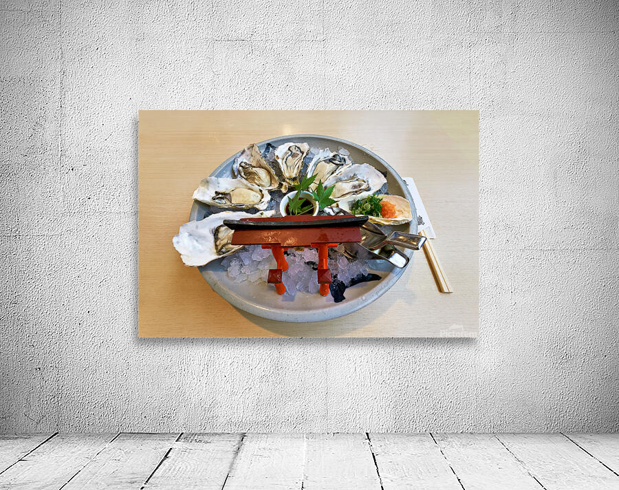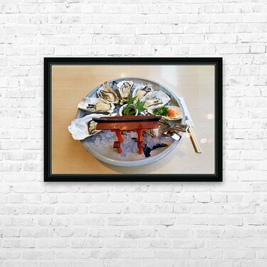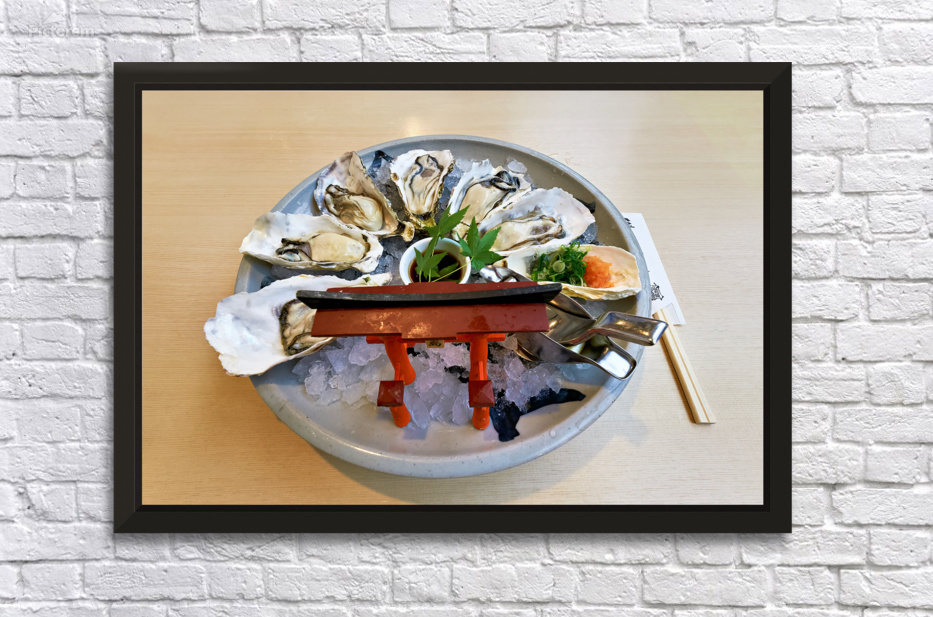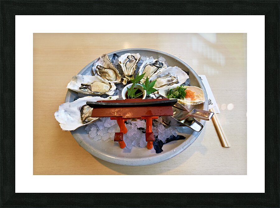 "Fresh giant oysters served on a plate in Miyajima Japan" in a framed print.
