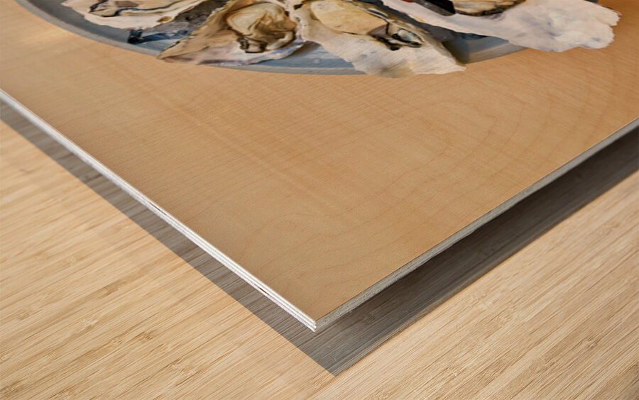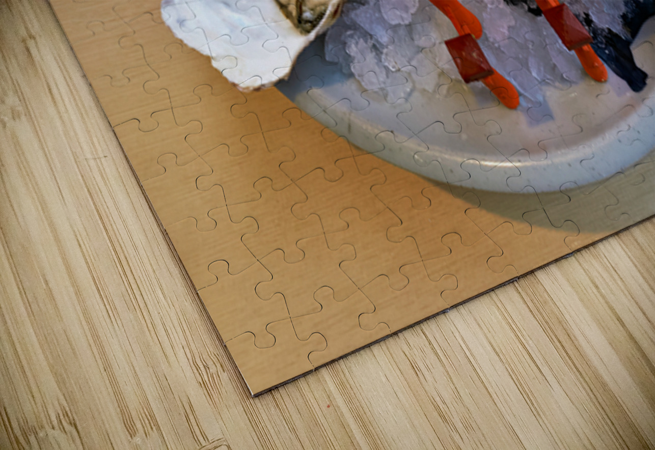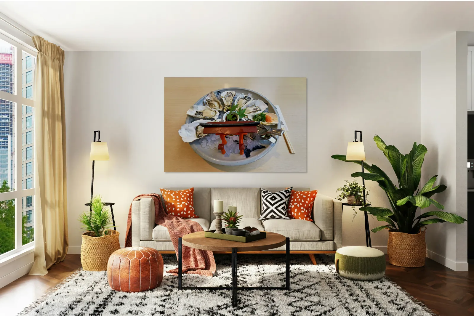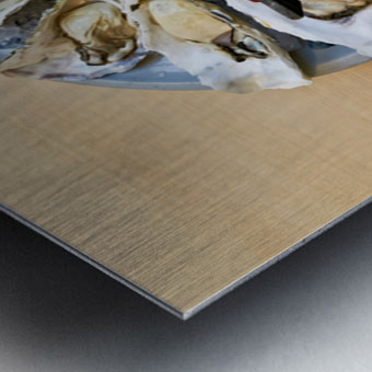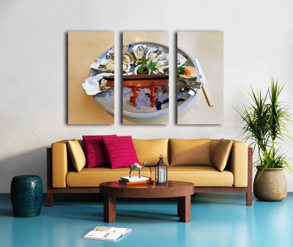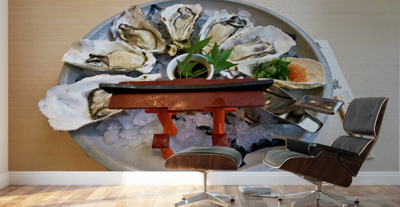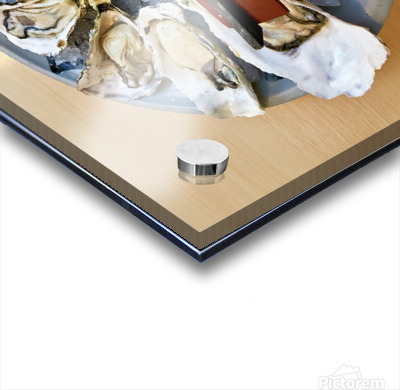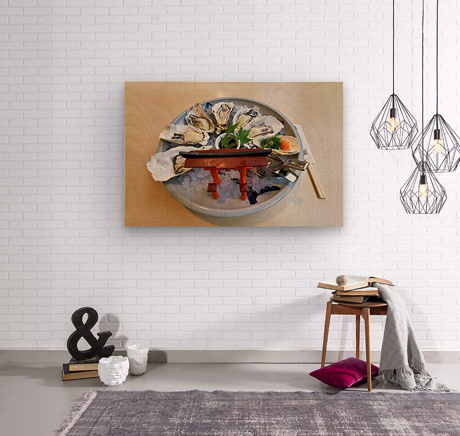 "Fresh giant oysters served on a plate in Miyajima Japan" in a framed print.