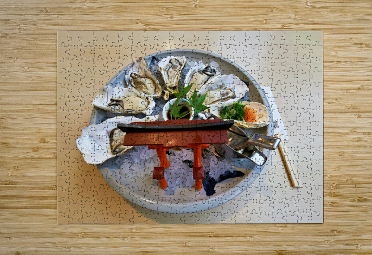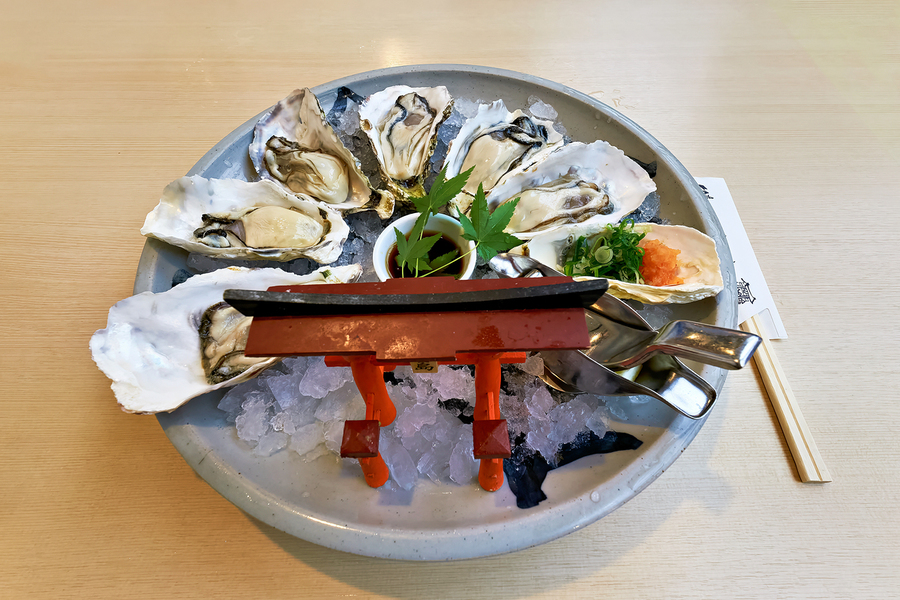 Fresh giant oysters are presented on a plate with garnishes in Miyajima Hiroshima Japan. The dish includes a small wooden shrine.