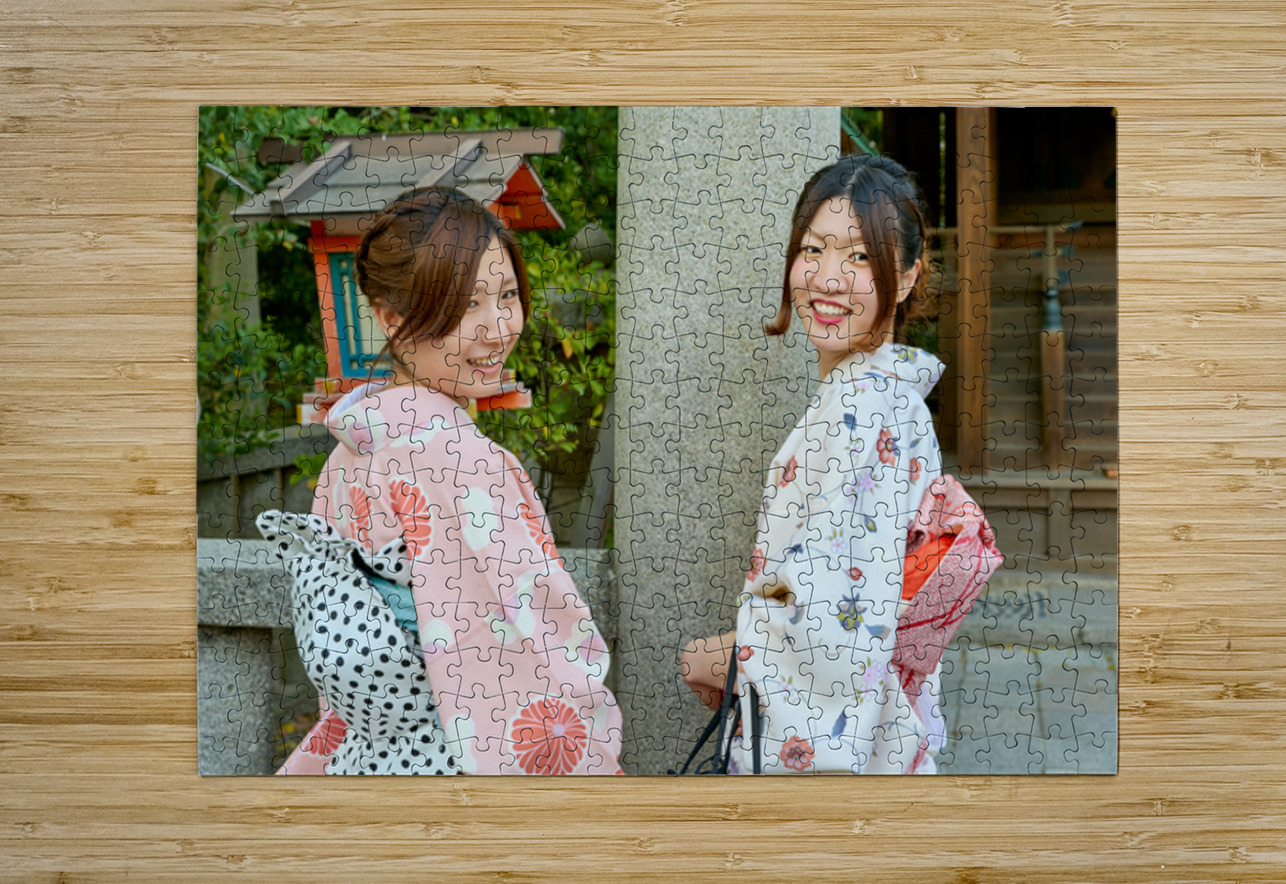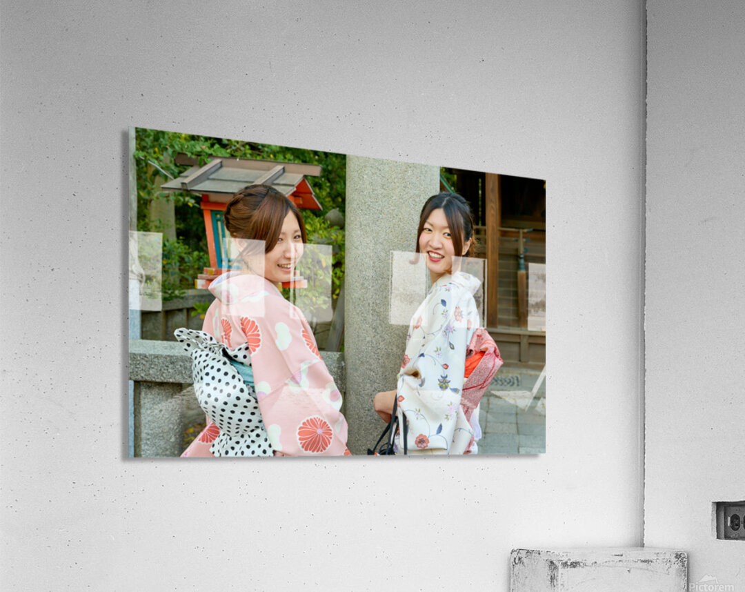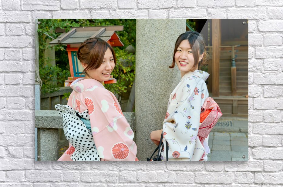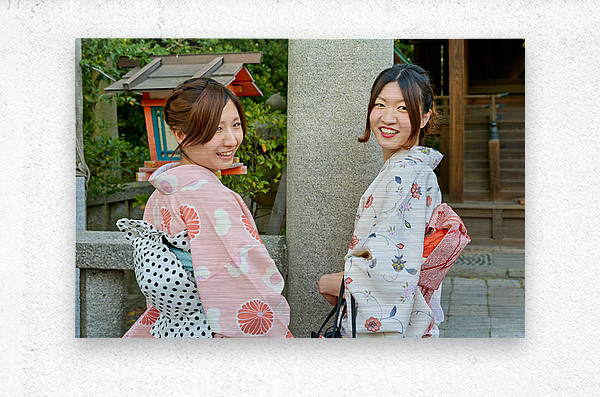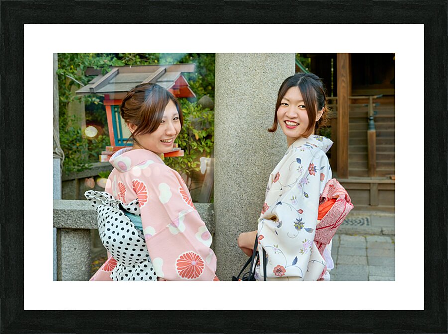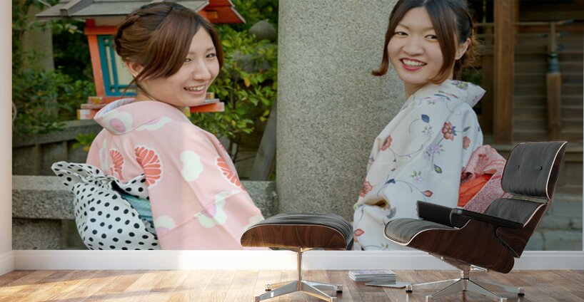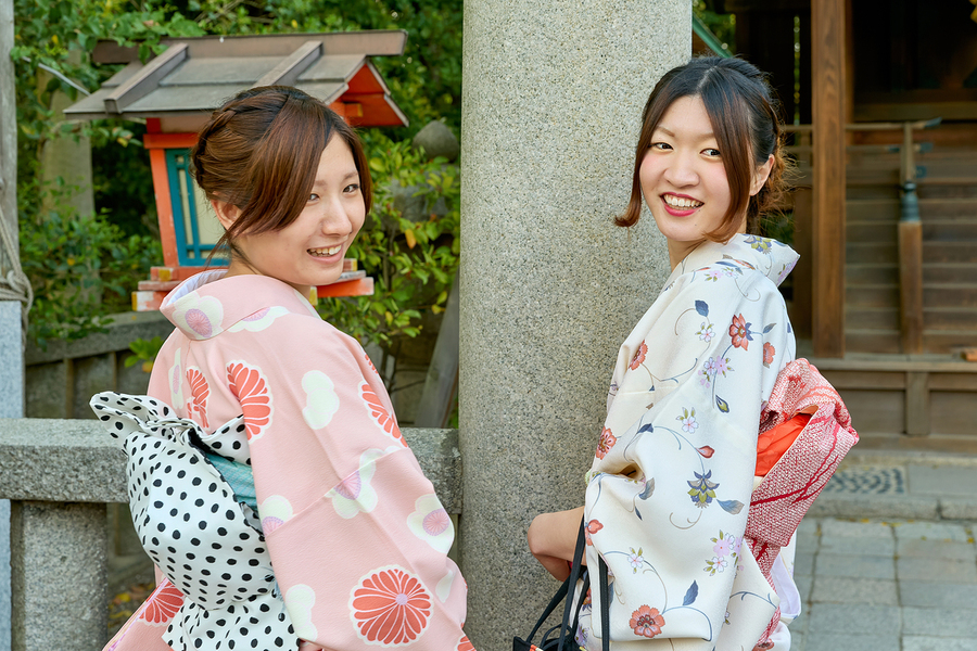 Smiling young women dress in traditional kimono while visiting Yasaka Shrine in Kyoto. They enjoy their time at the temple.