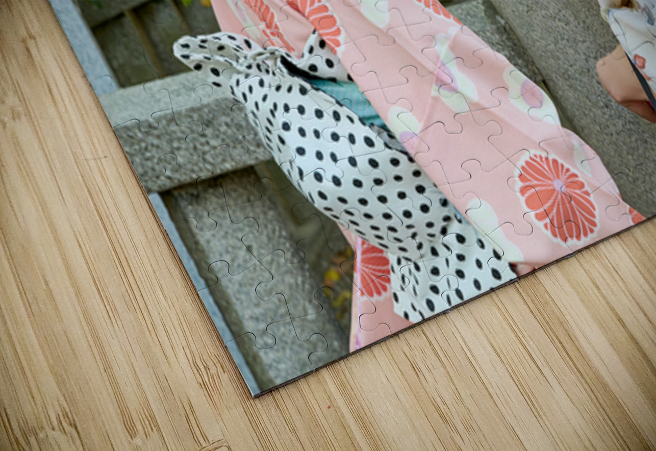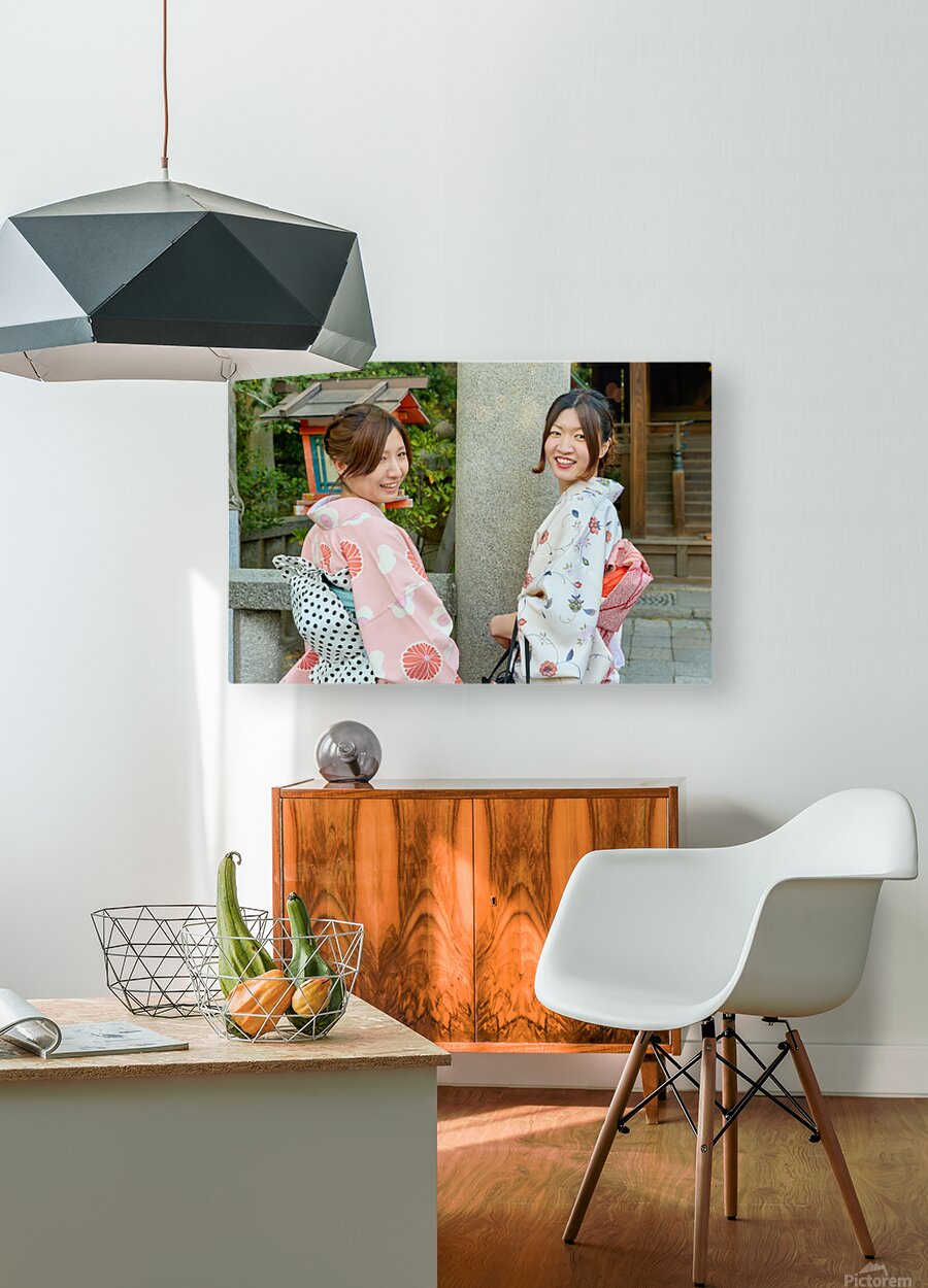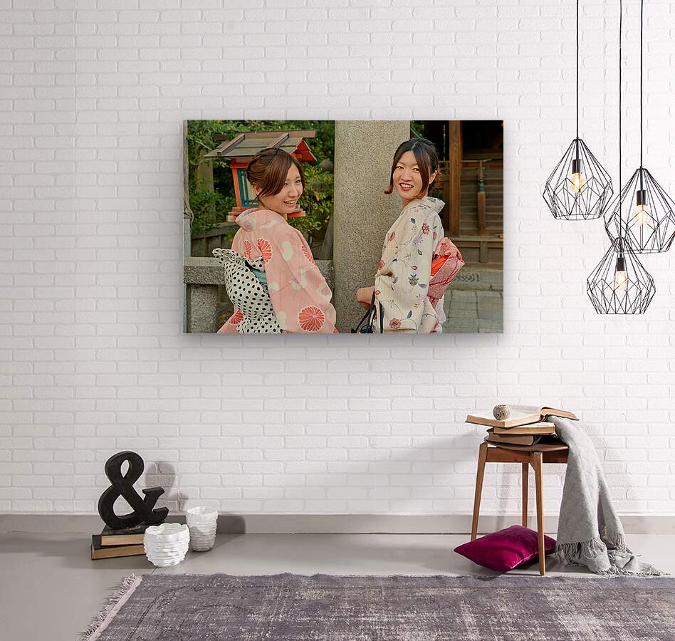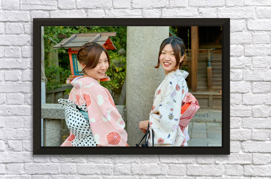 Smiling young women dress in traditional kimono while visiting Yasaka Shrine in Kyoto. They enjoy their time at the temple.