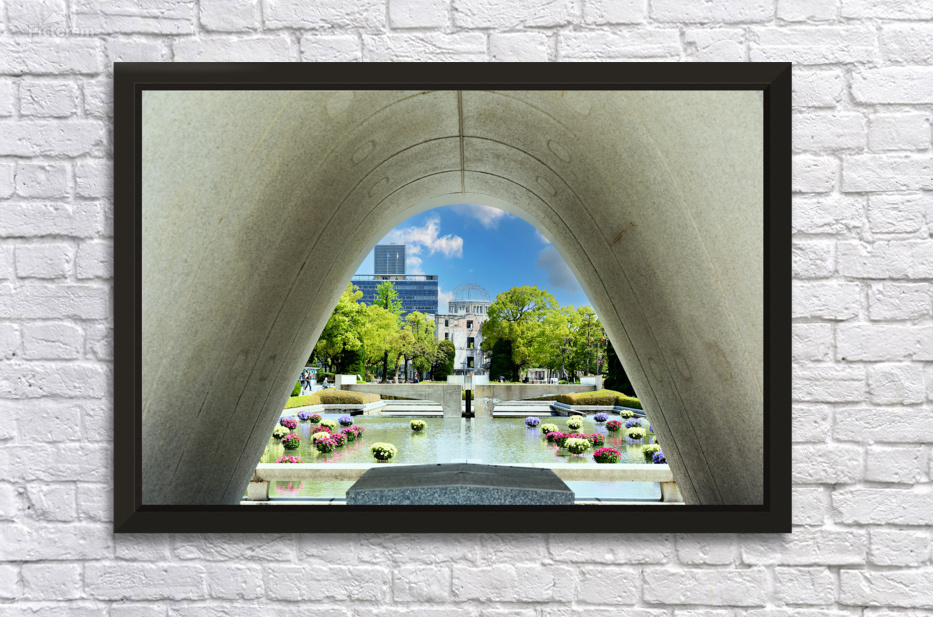 Visitors walk through Hiroshima Peace Memorial Park. The park includes flowers trees and important structures creating a space for reflection.