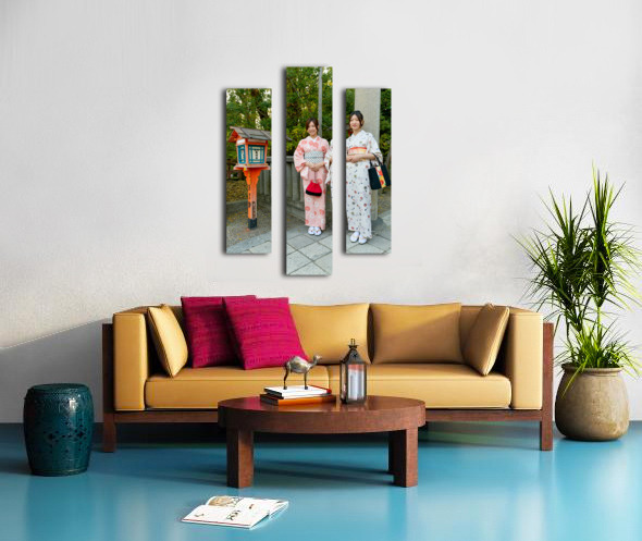 Get this artwork "Young women in traditional kimono at Yasaka Shrine in Kyoto" in a framed print.