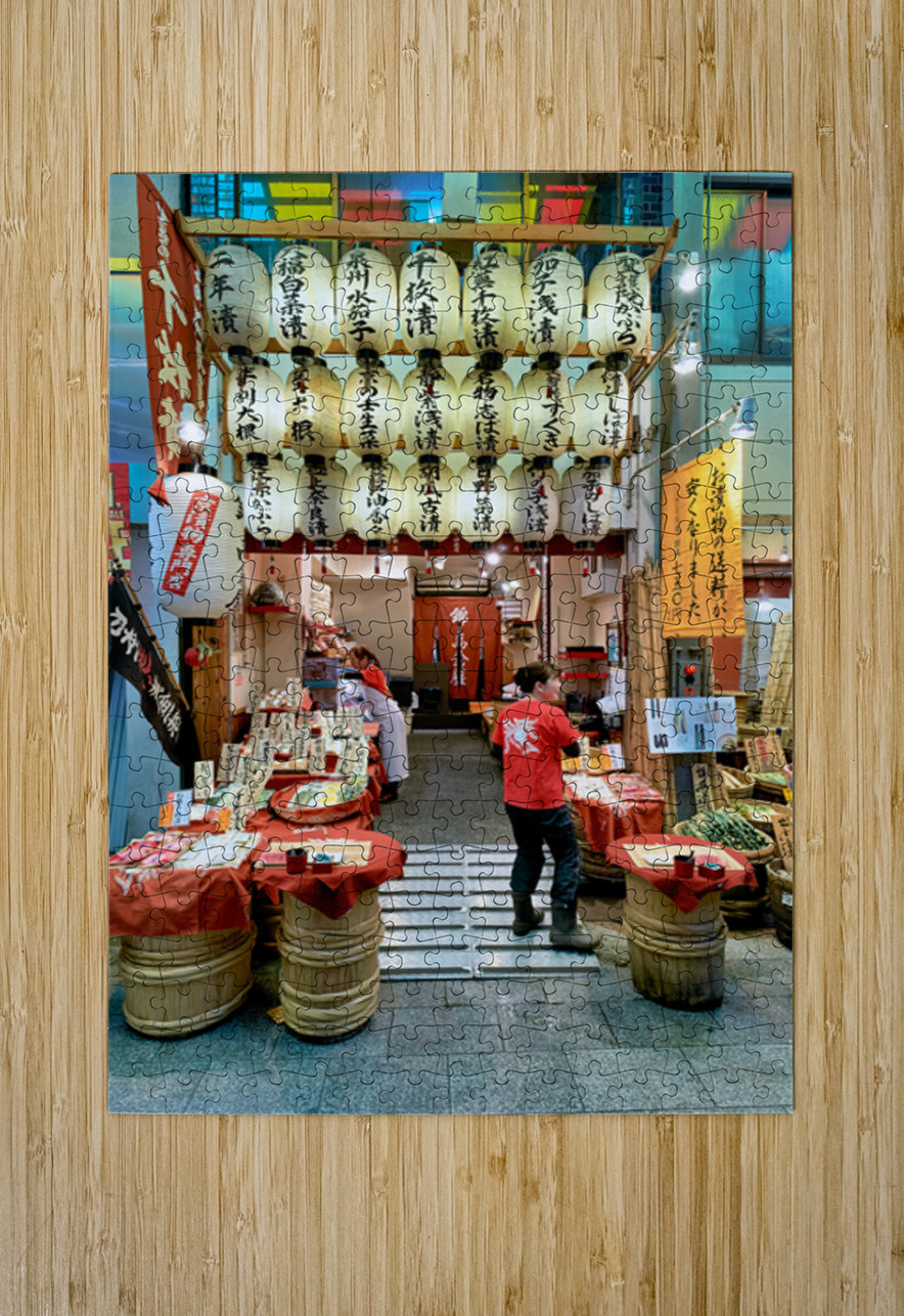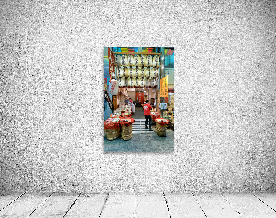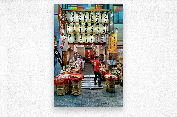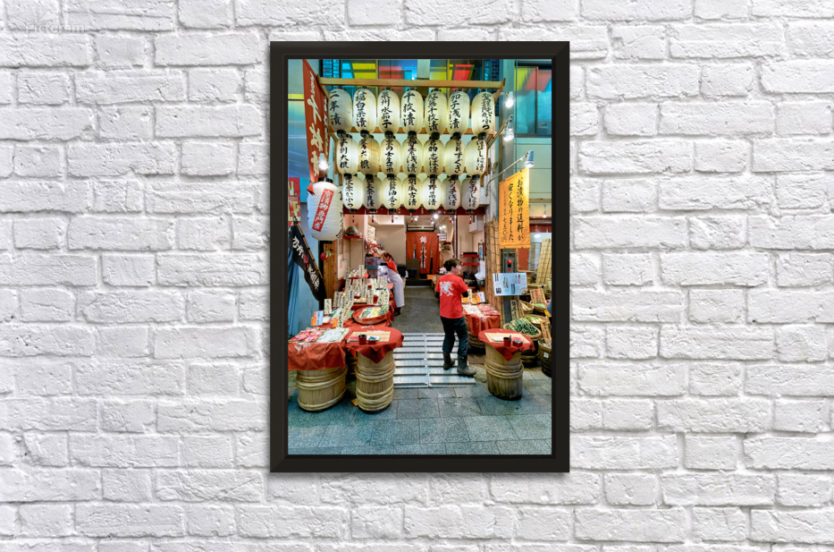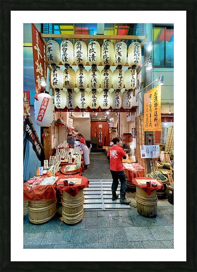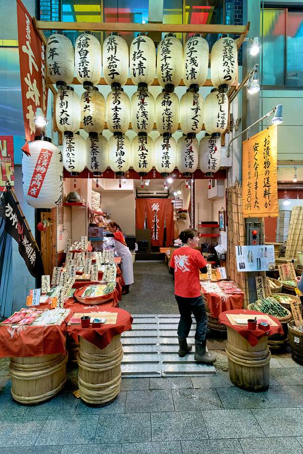 Shops line the narrow street of Nishiki Market as visitors browse local foods and goods in Kyoto Japan. The market is busy with activity.
