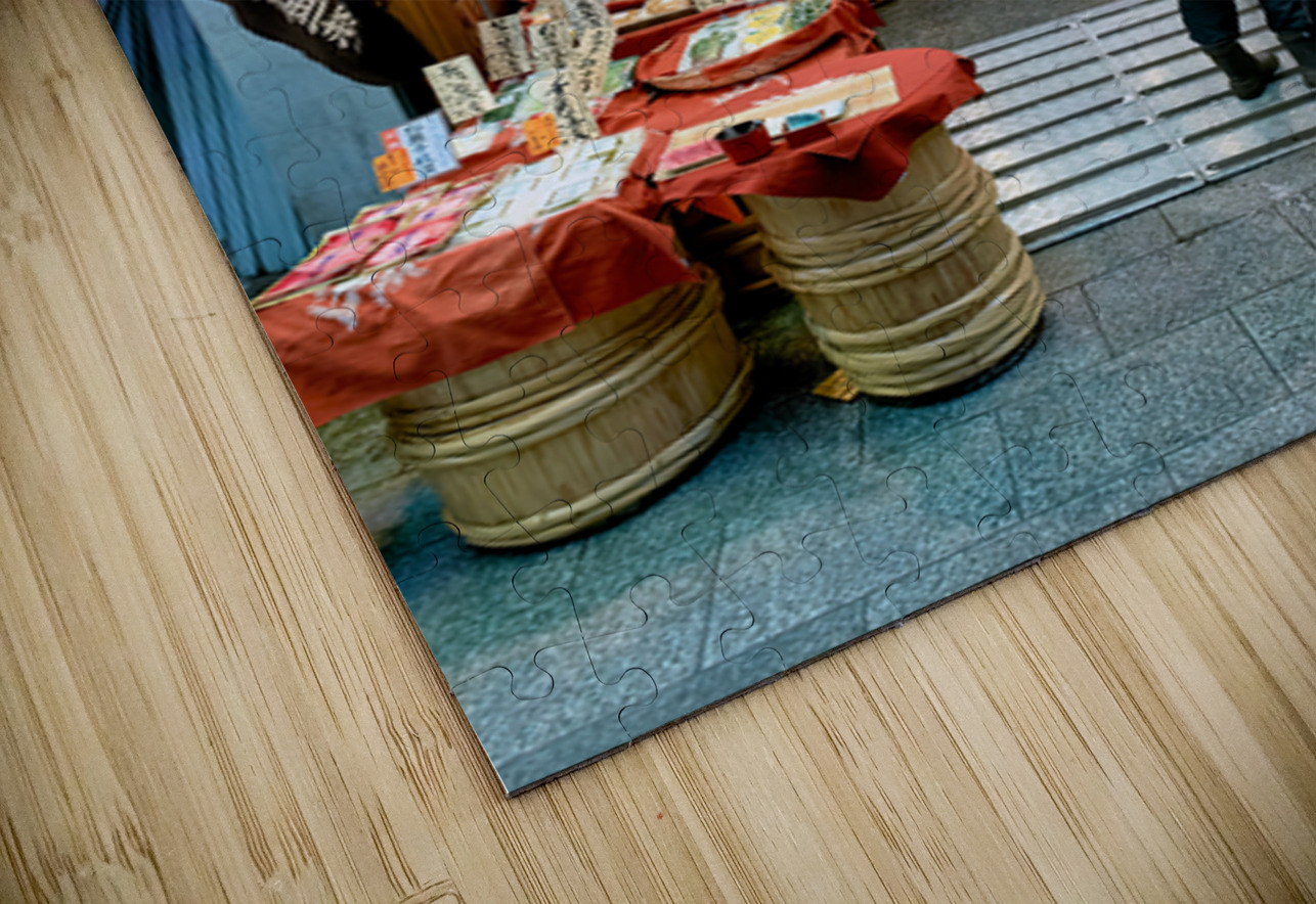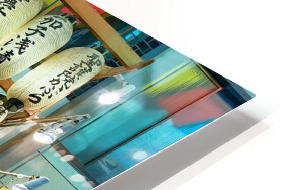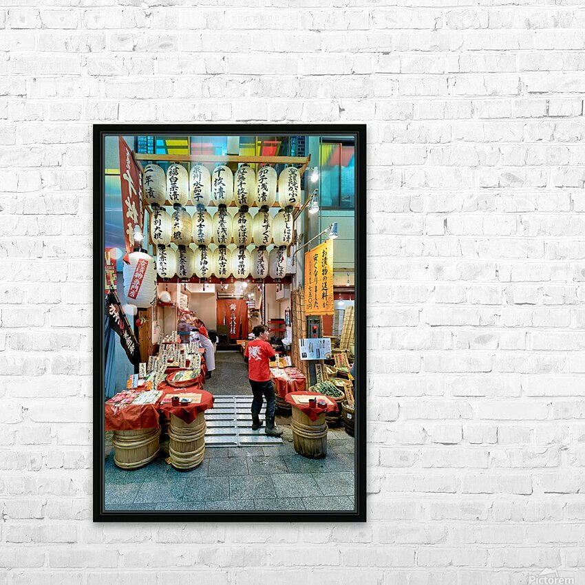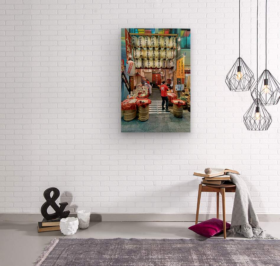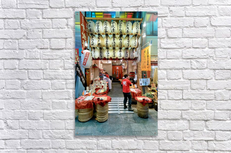 Shops line the narrow street of Nishiki Market as visitors browse local foods and goods in Kyoto Japan. The market is busy with activity.
