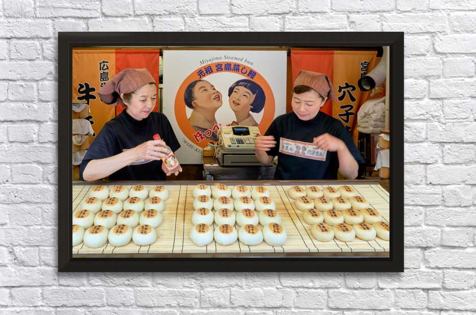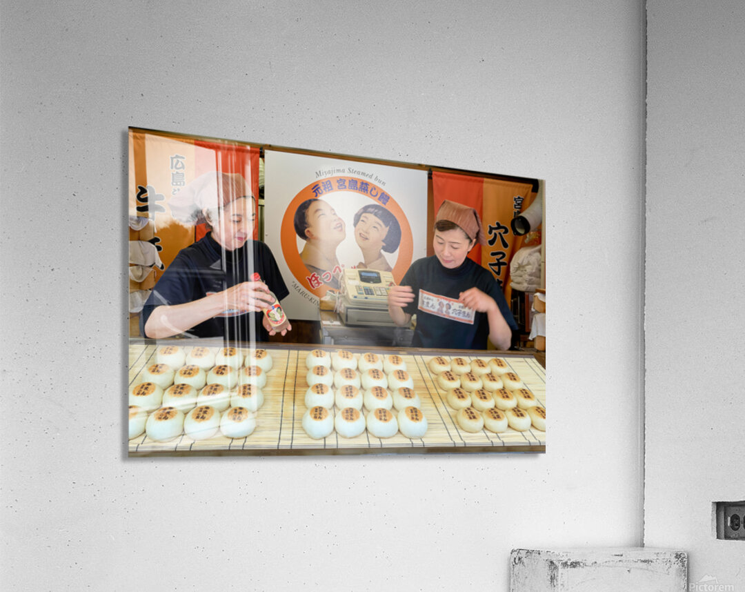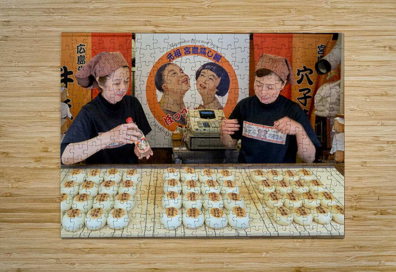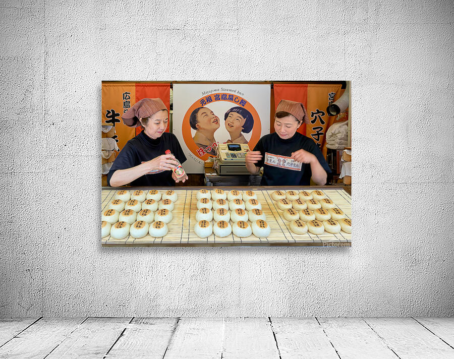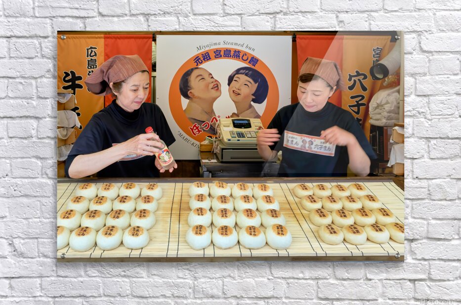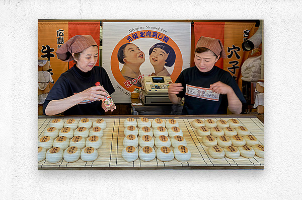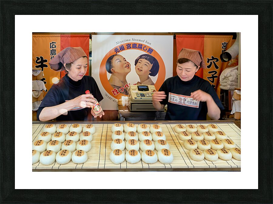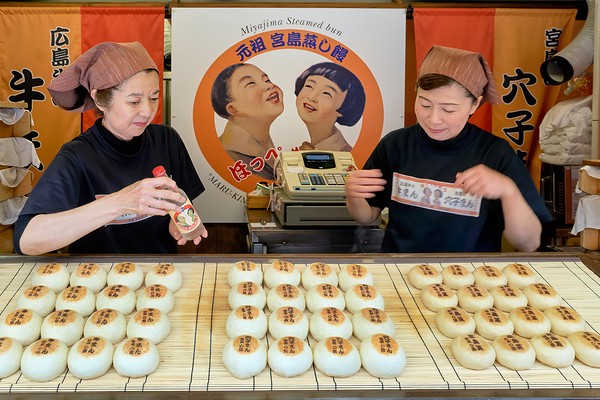 Two women prepare traditional steamed buns in Miyajima Hiroshima. The buns are lined up on a table for sale.