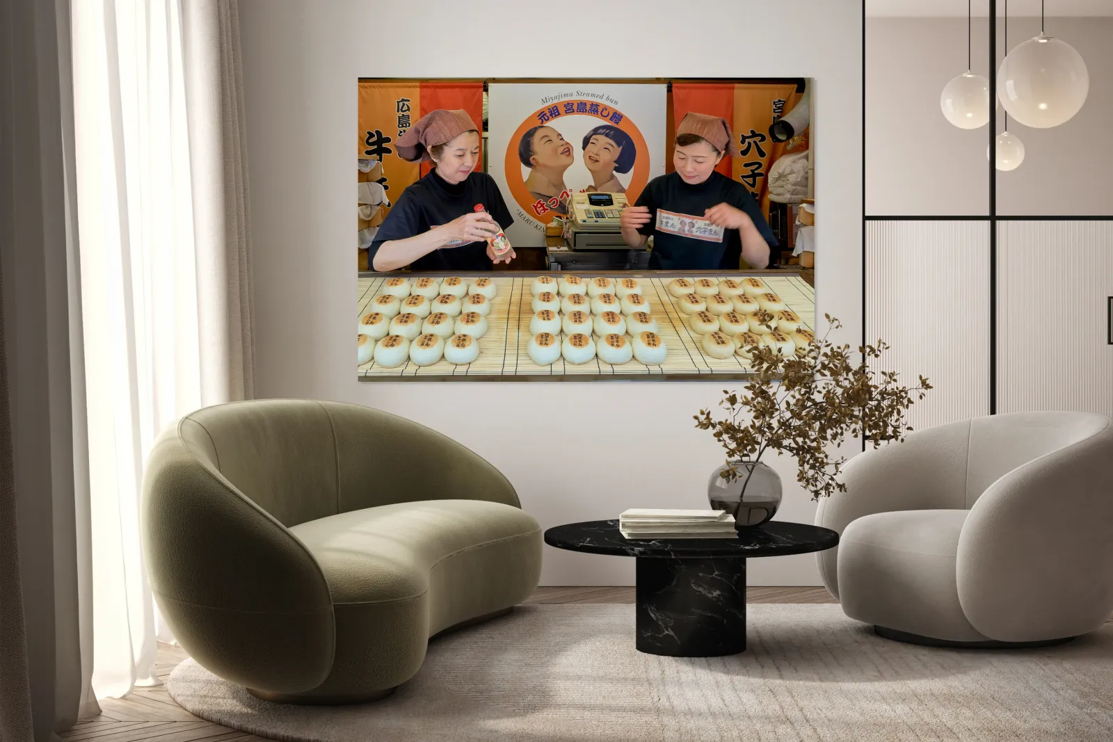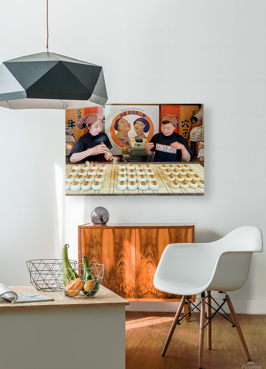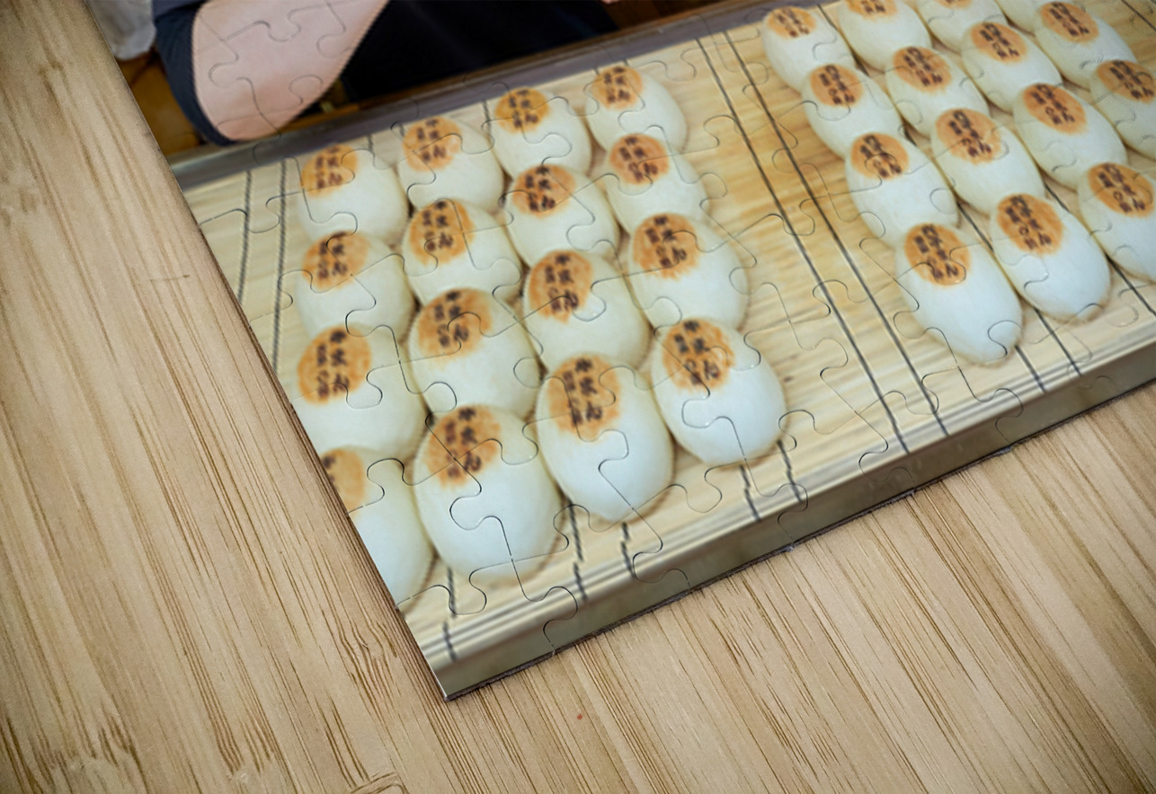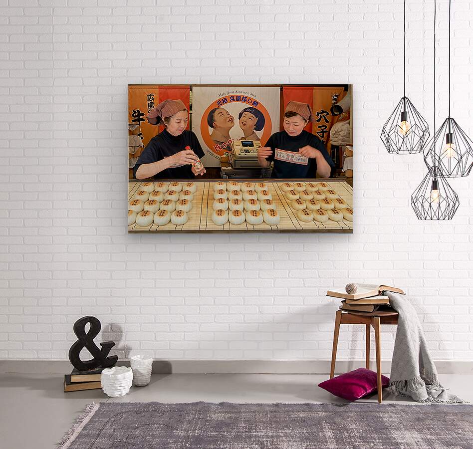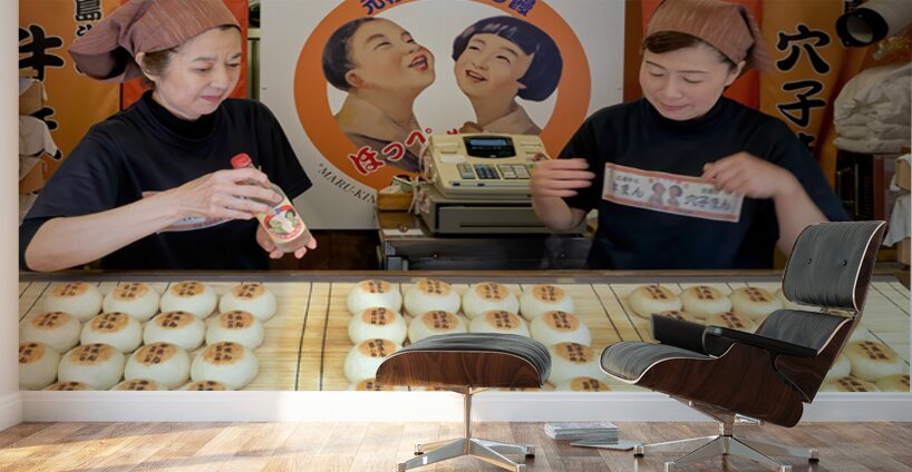 Two women prepare traditional steamed buns in Miyajima Hiroshima. The buns are lined up on a table for sale.