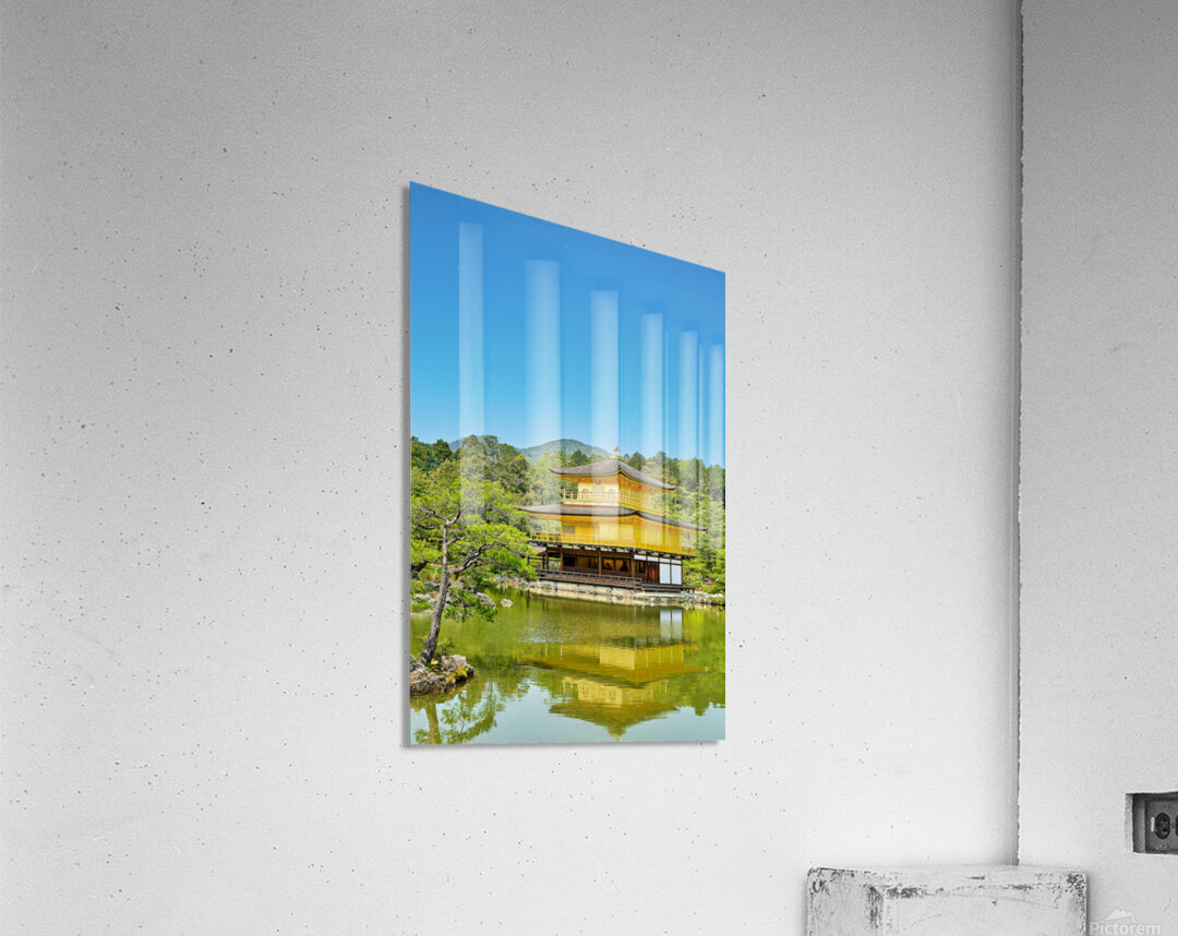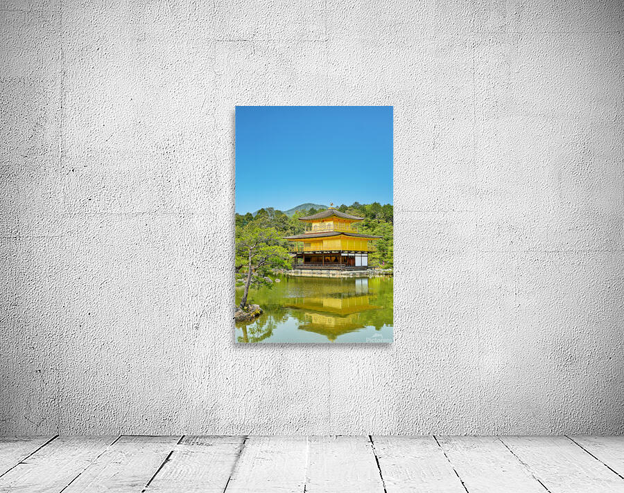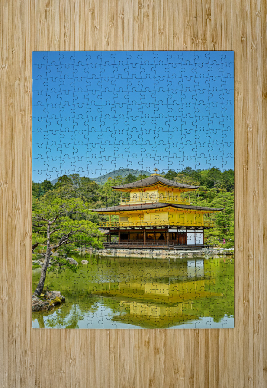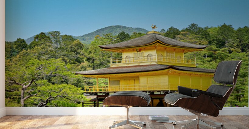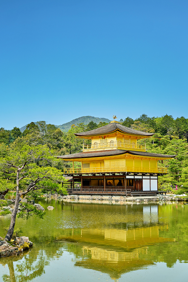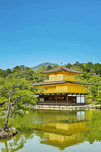 Kinkaku-ji Temple stands by a pond in Kyoto Japan. The structure is covered in gold and surrounded by trees and greenery on a sunny day.