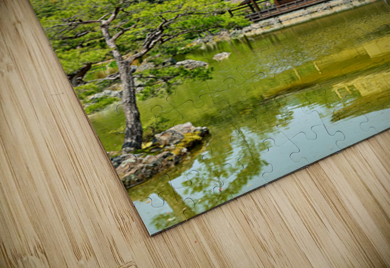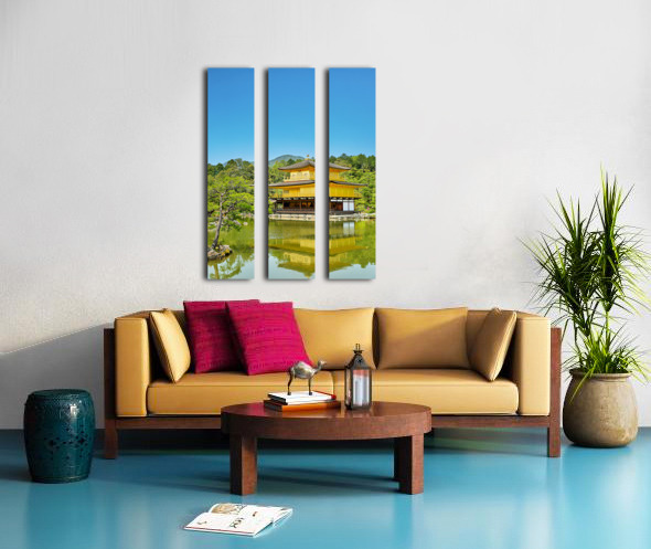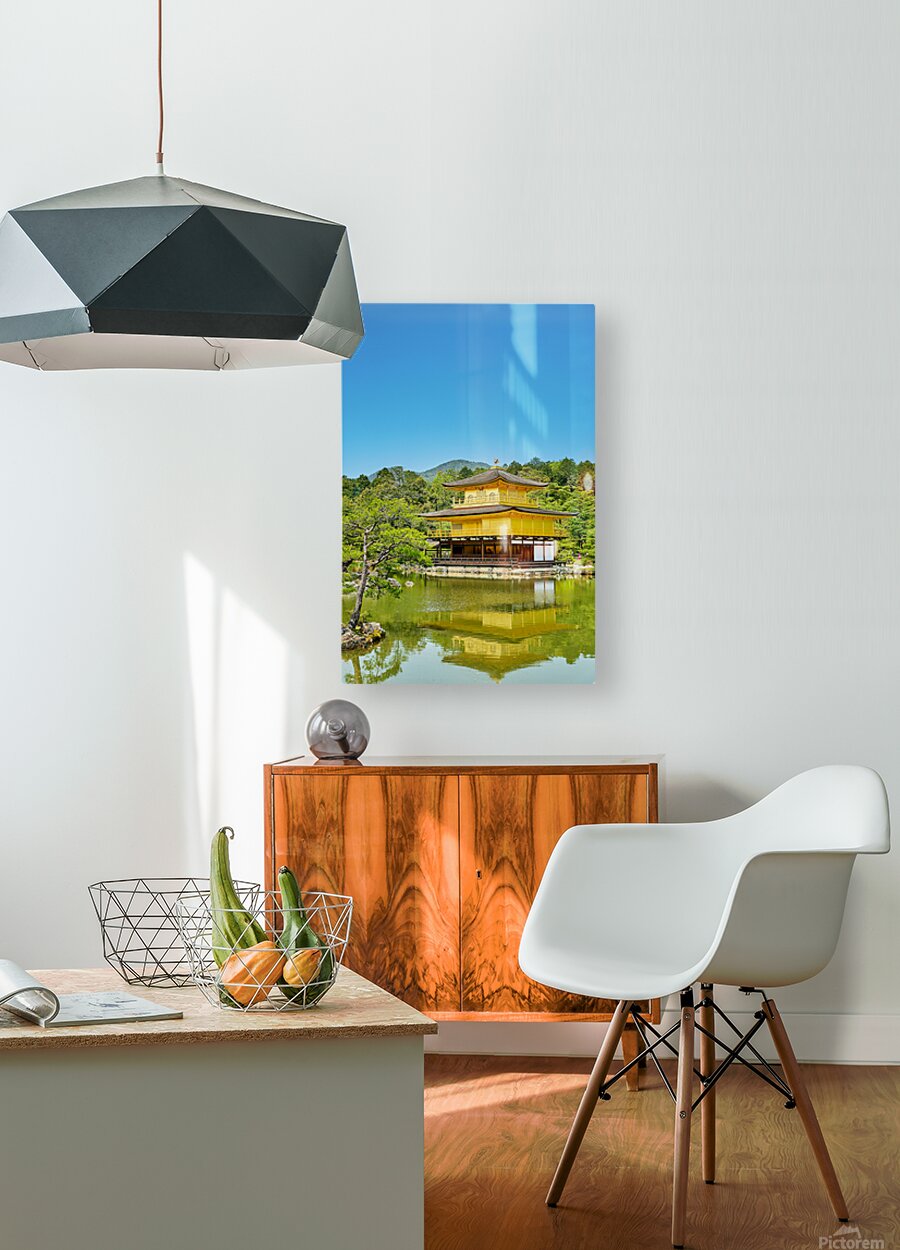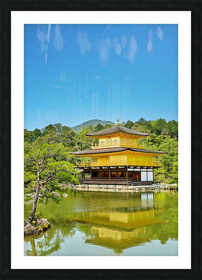 Kinkaku-ji Temple stands by a pond in Kyoto Japan. The structure is covered in gold and surrounded by trees and greenery on a sunny day.