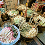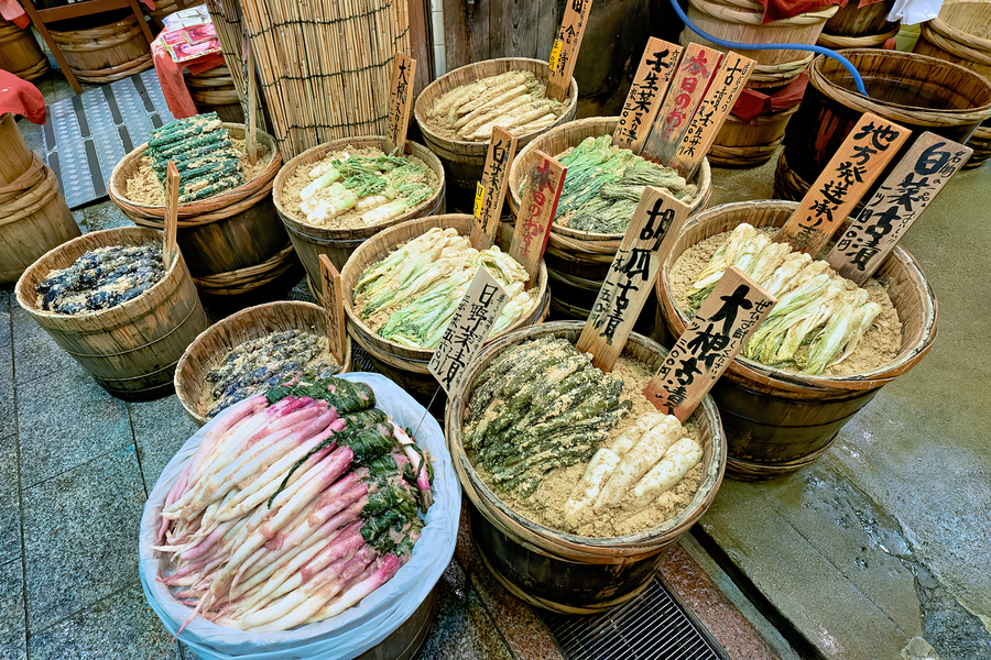 Baskets filled with various pickled vegetables are arranged in Nishiki Market in Kyoto. Visitors explore the vibrant market and sample food.