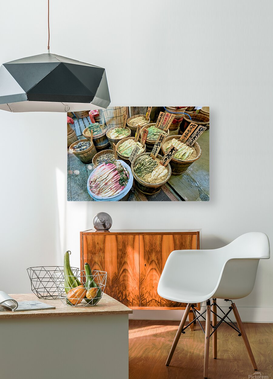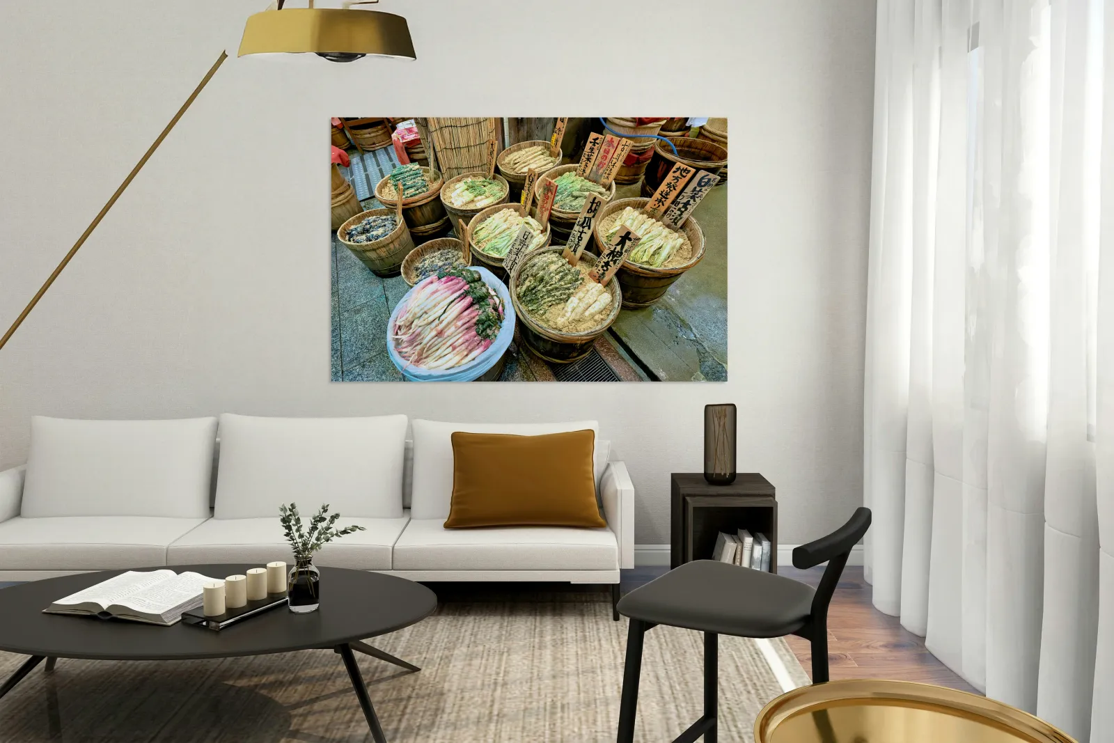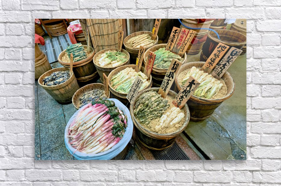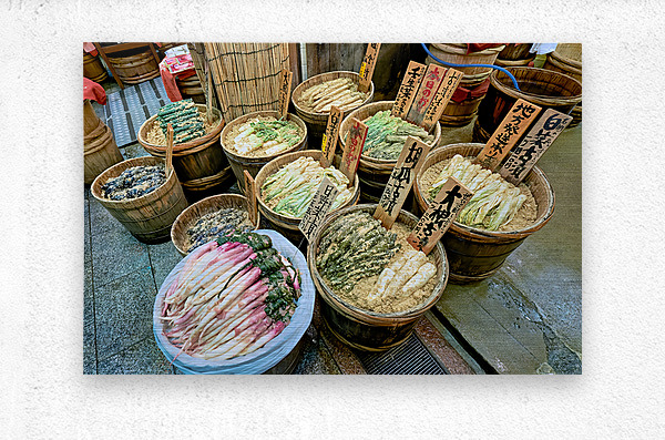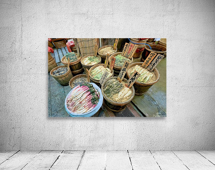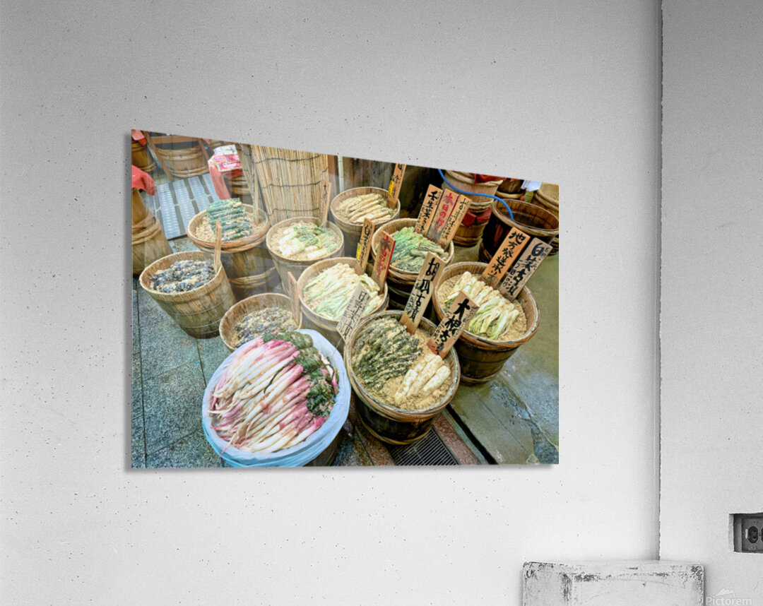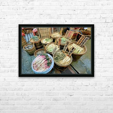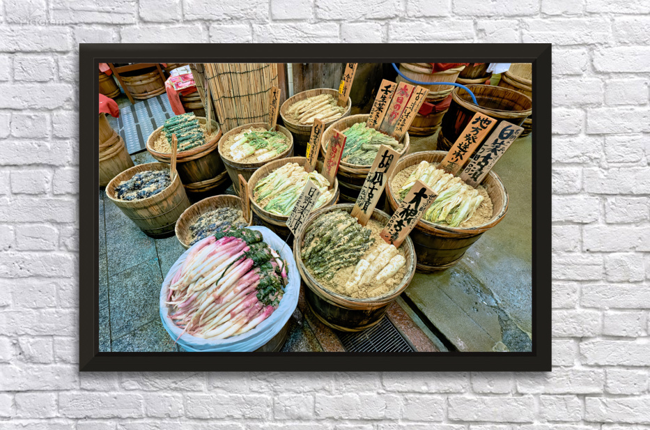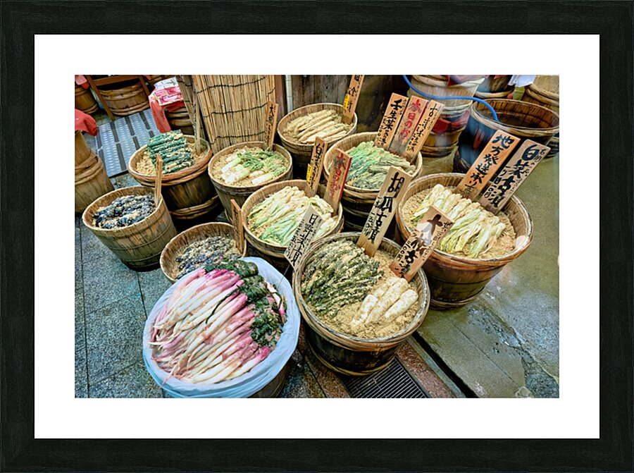 "Market display of pickled vegetables in Nishiki Market Kyoto" in a framed print.