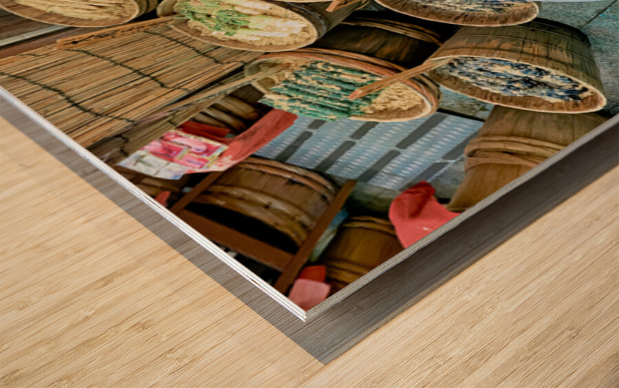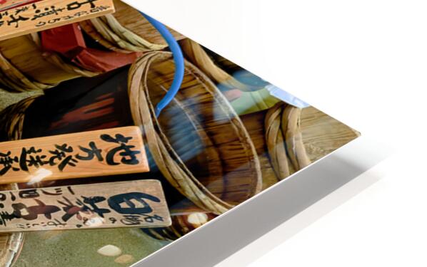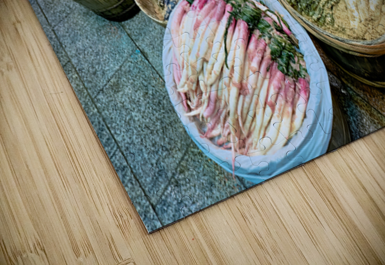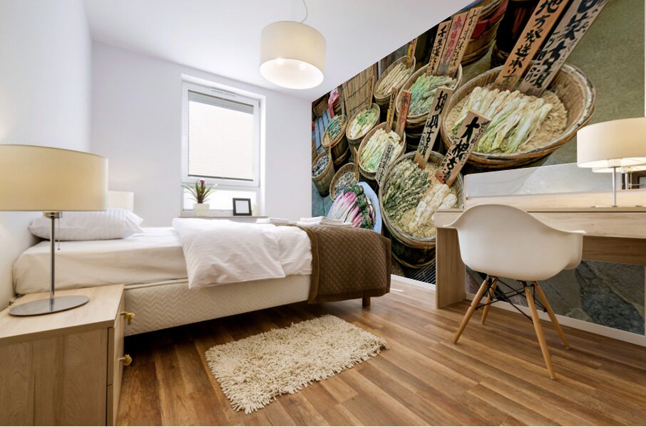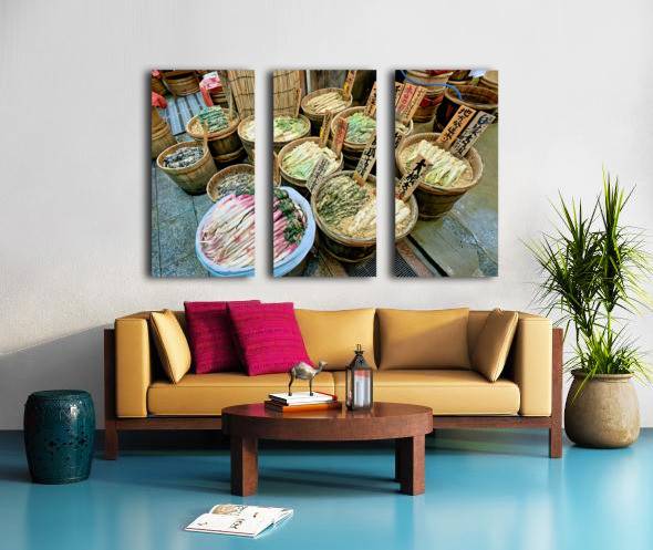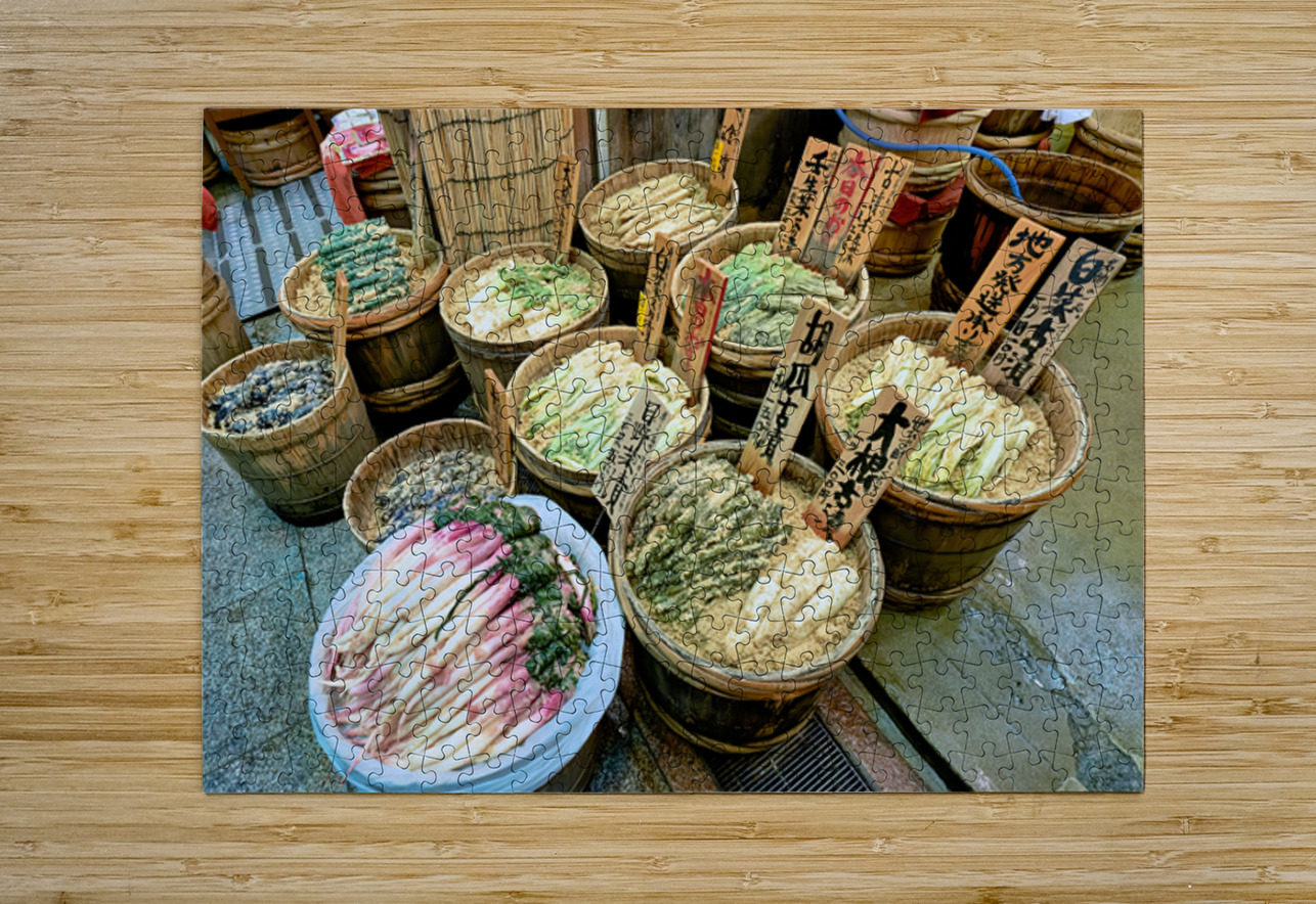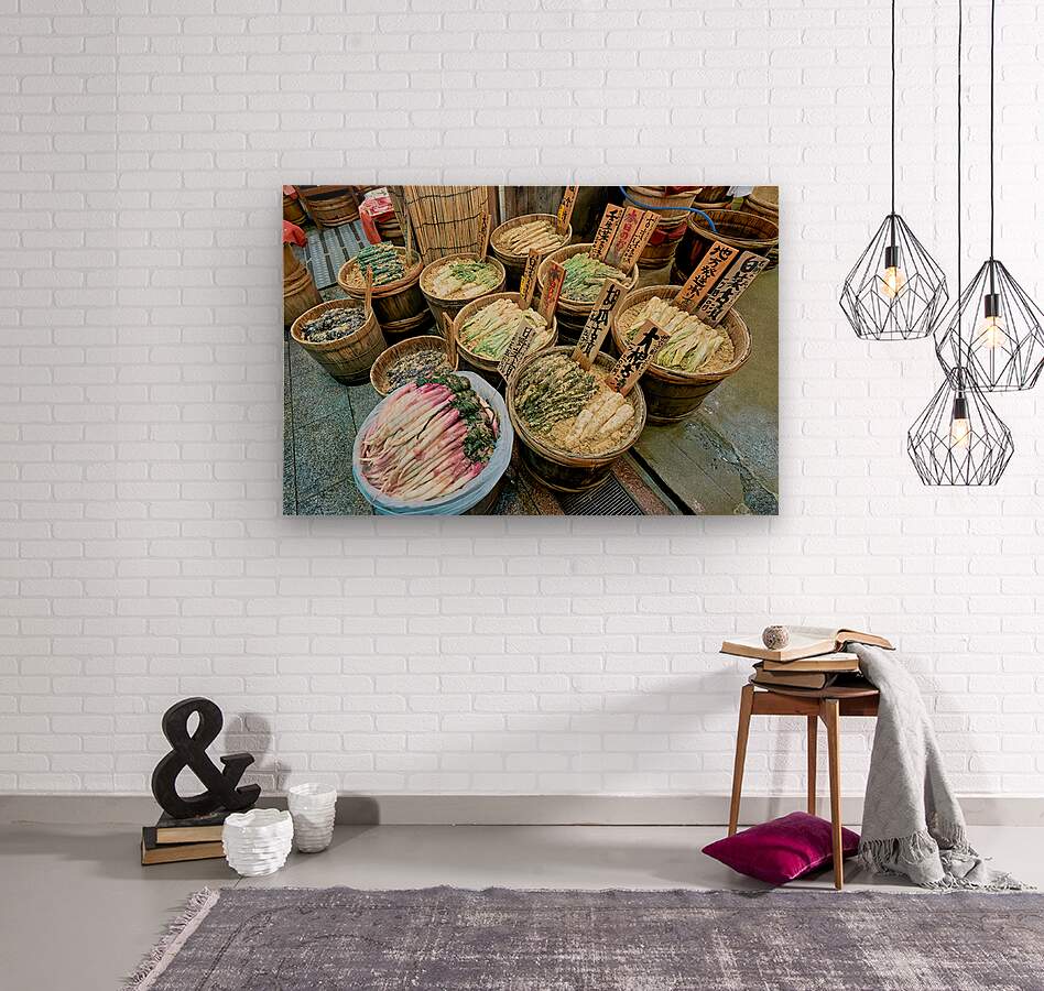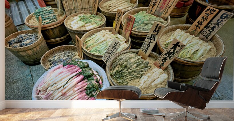 "Market display of pickled vegetables in Nishiki Market Kyoto" in a framed print.