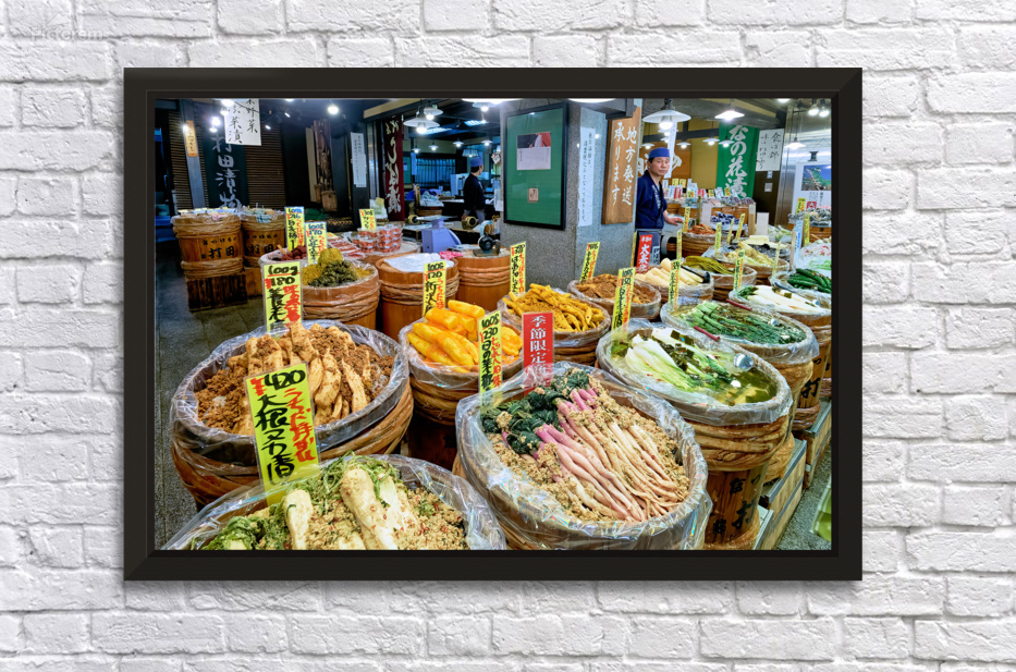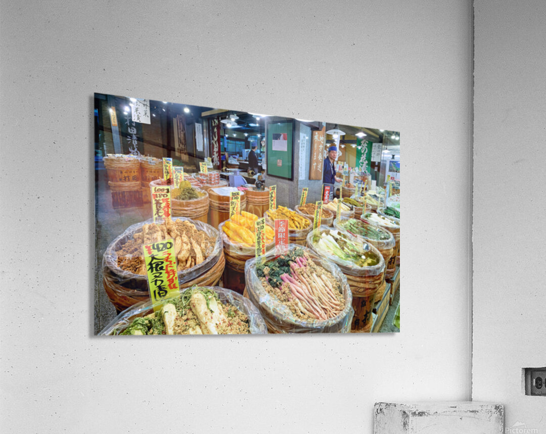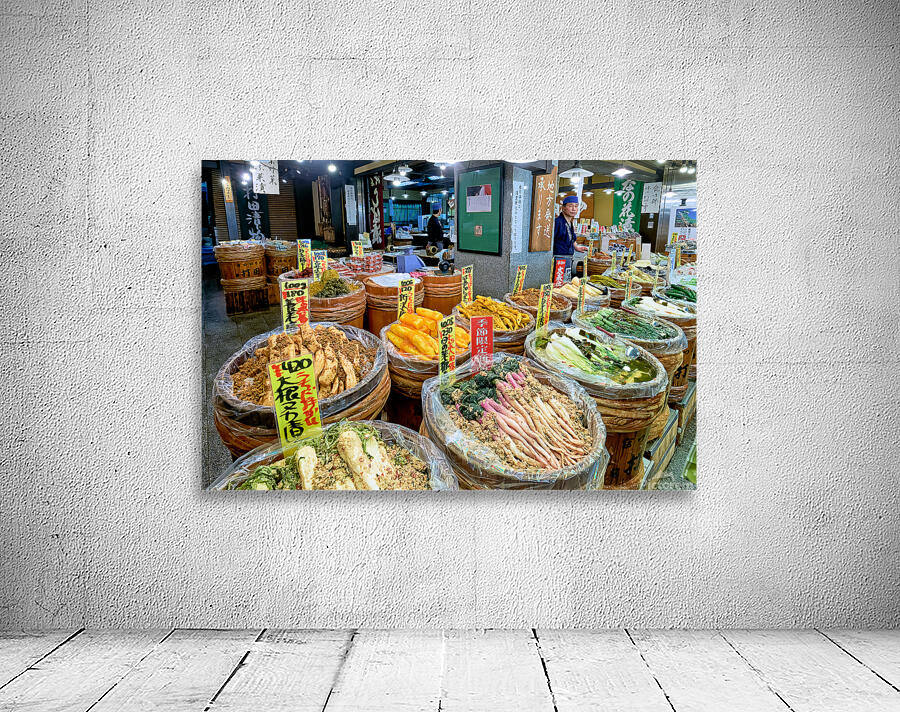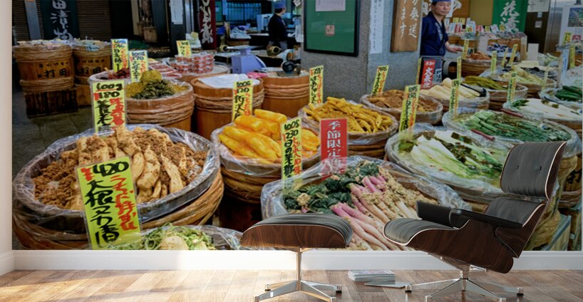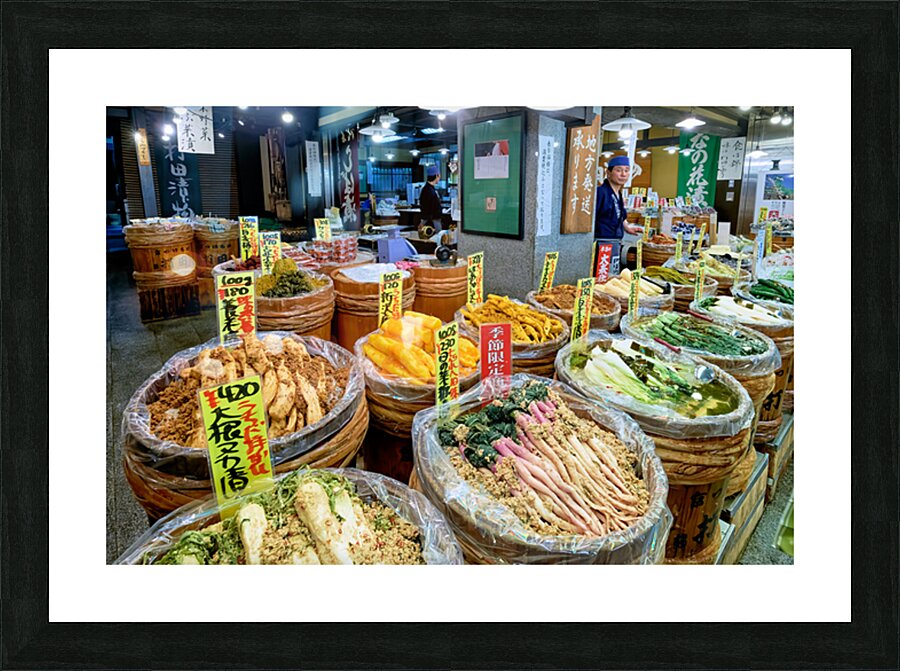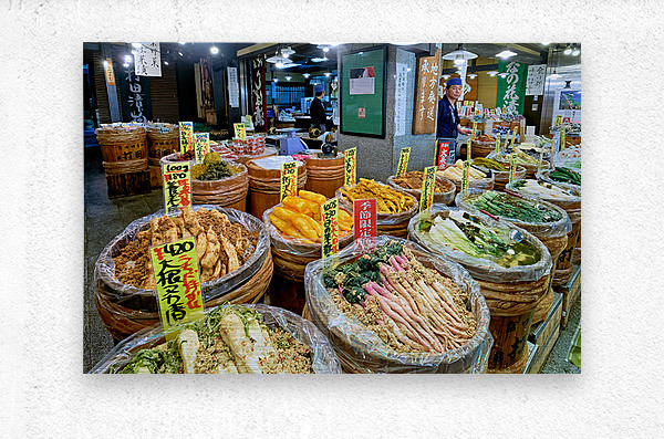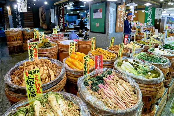 Stalls in Nishiki Market display various types of vegetables for sale. Shoppers browse different stands during a busy market day.