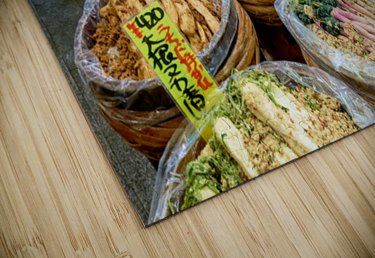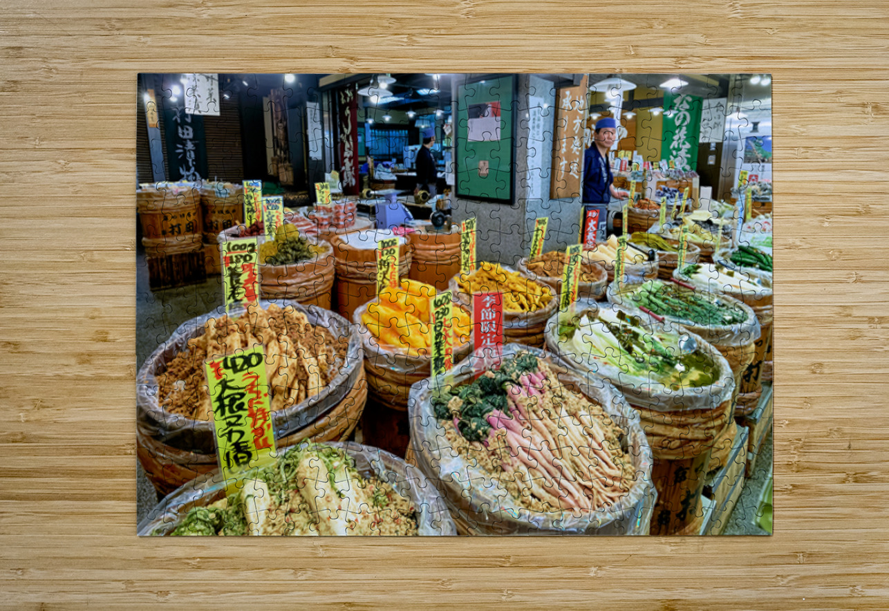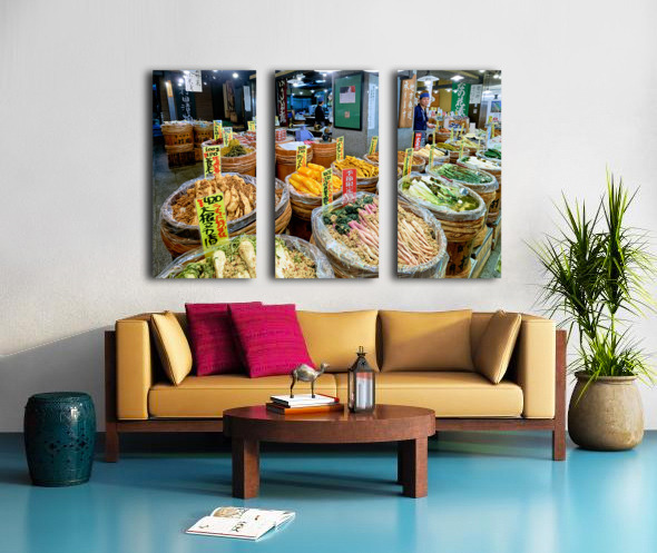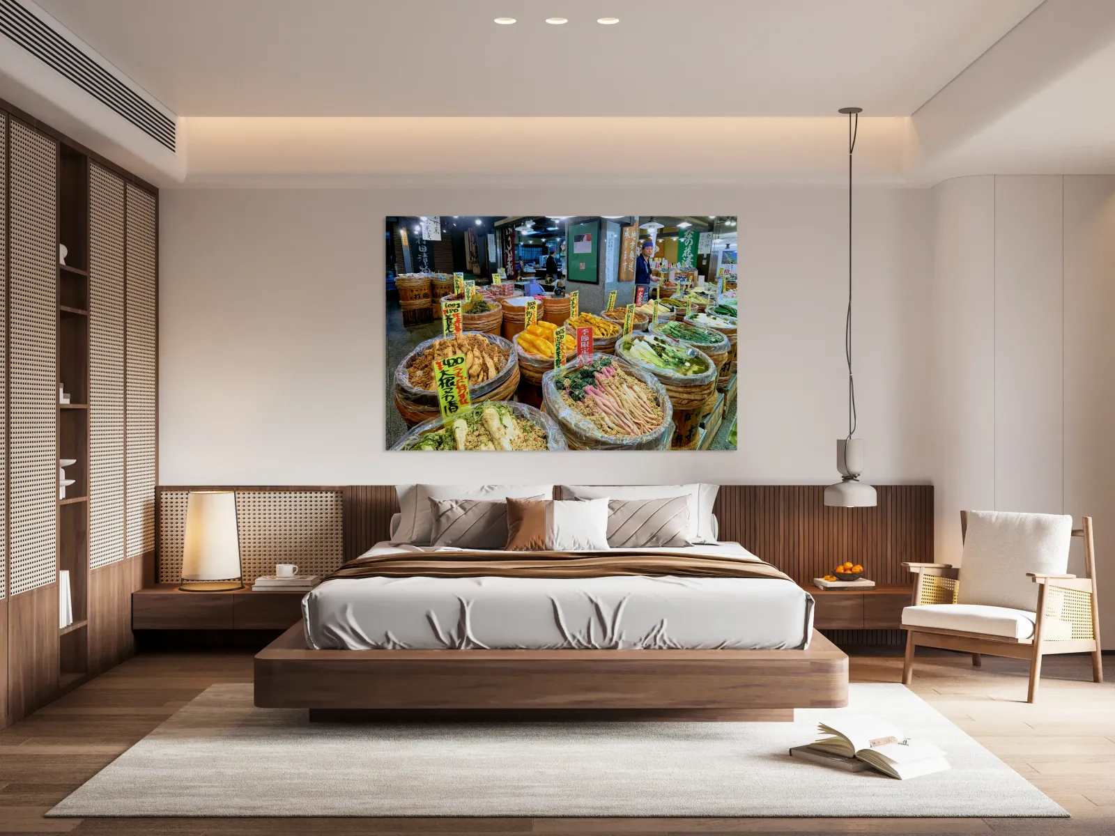 Stalls in Nishiki Market display various types of vegetables for sale. Shoppers browse different stands during a busy market day.