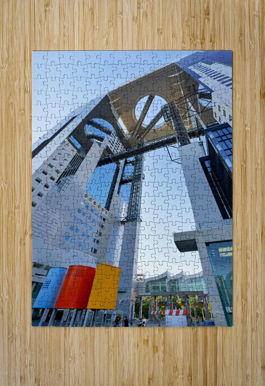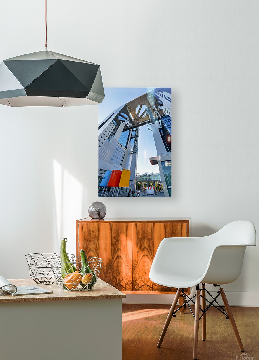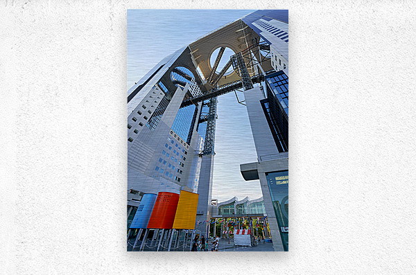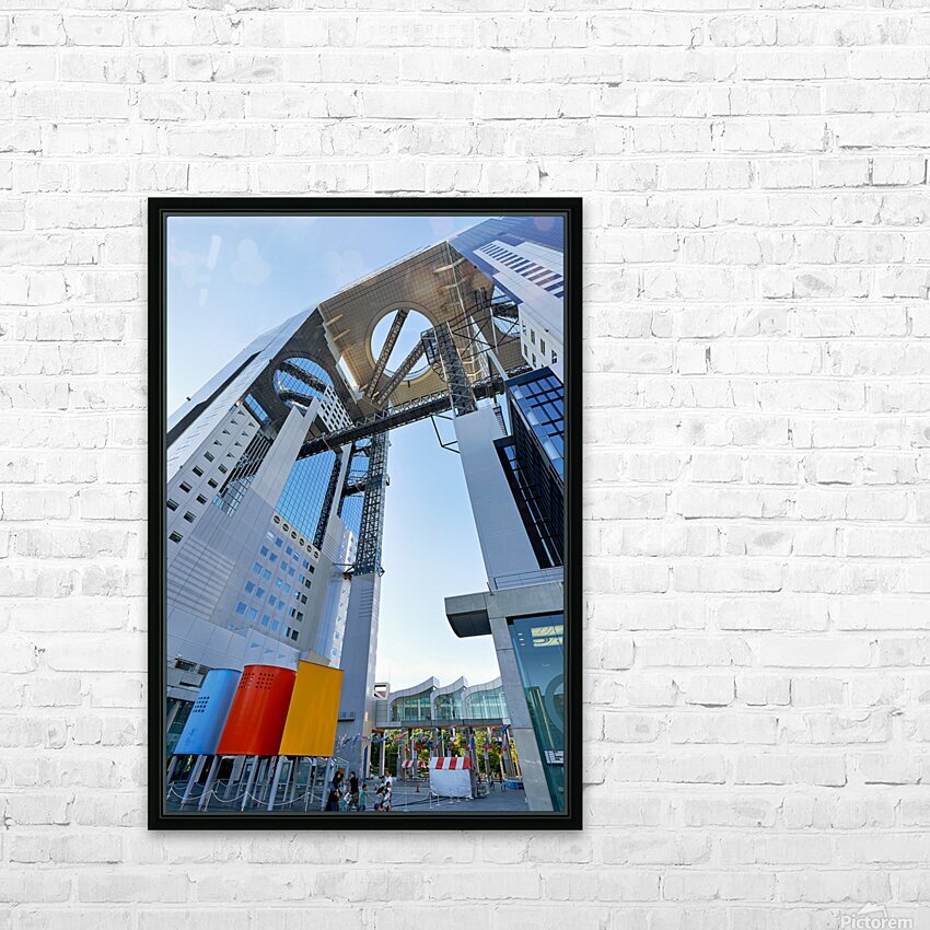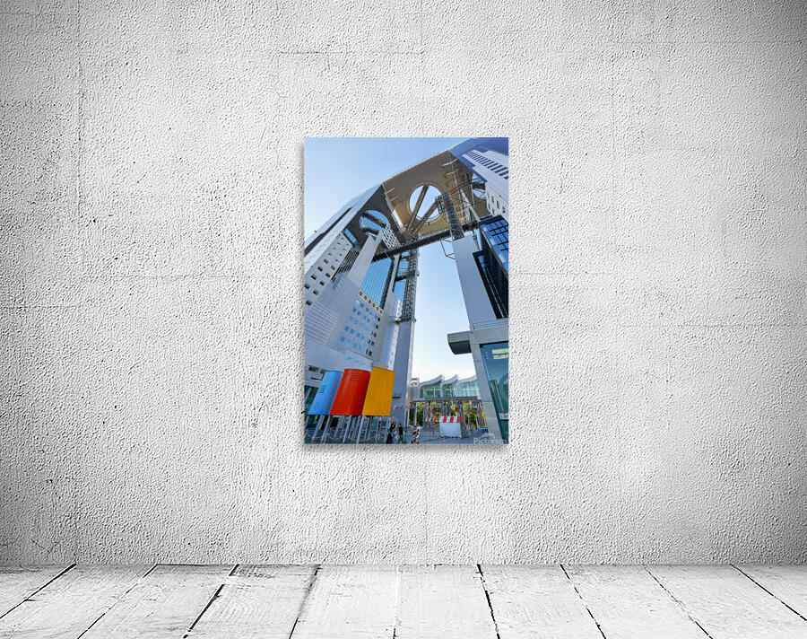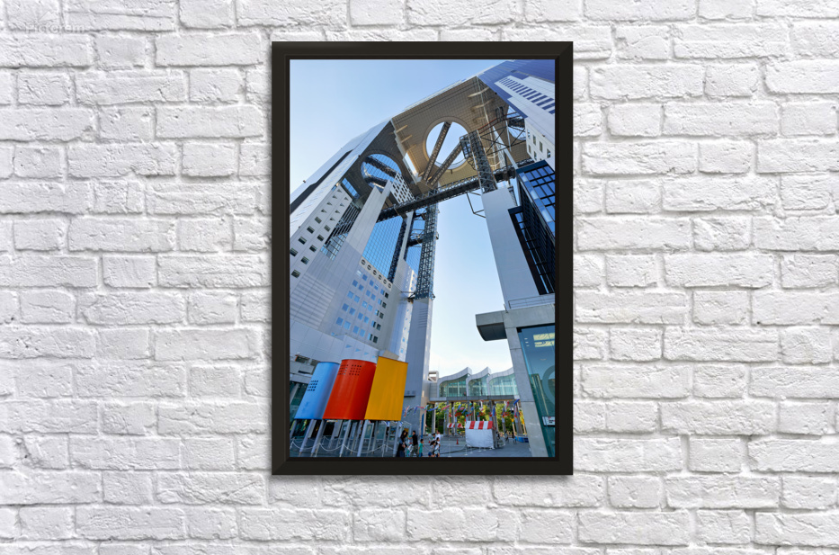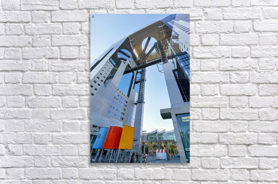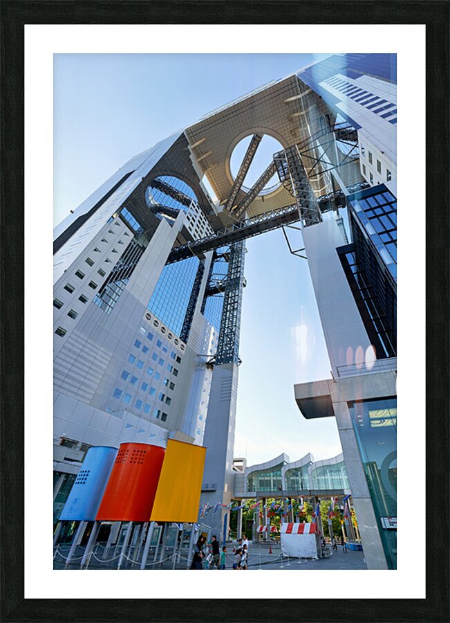 Visitors walk near the Umeda Sky Building in Osaka Japan. The structure has a unique design with an open sky area above.