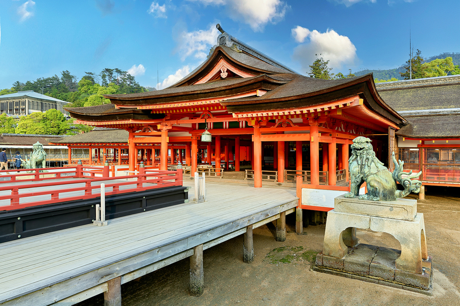 Visitors explore the Itsukushima shrine known for its unique architecture and historical significance. The shrine sits on the waterfront at low tide.