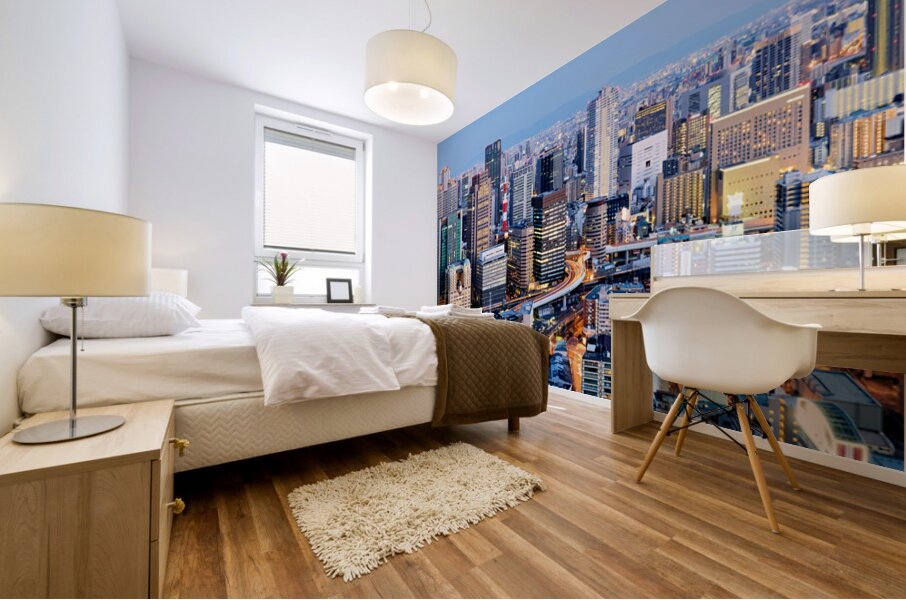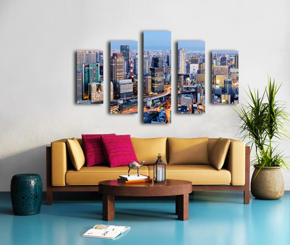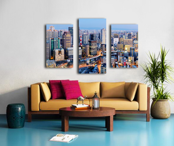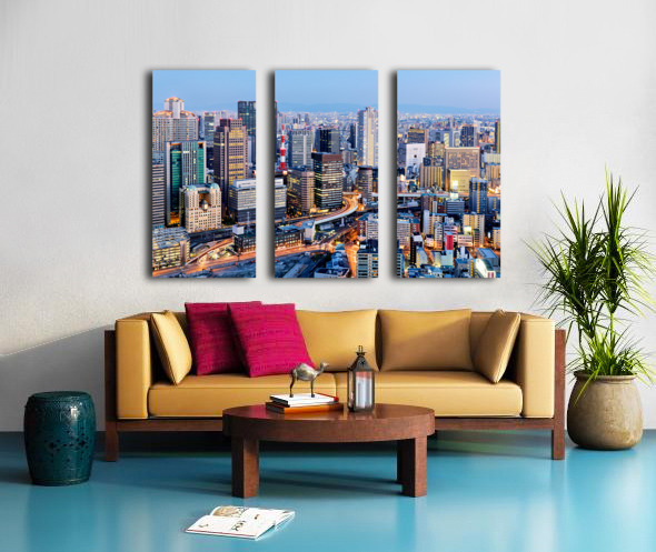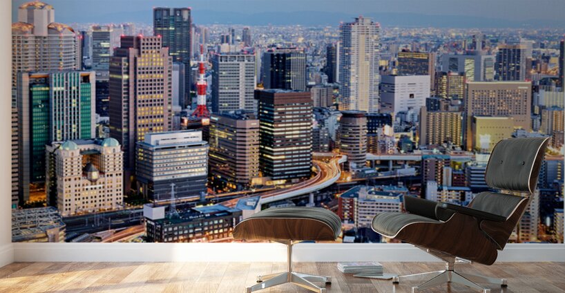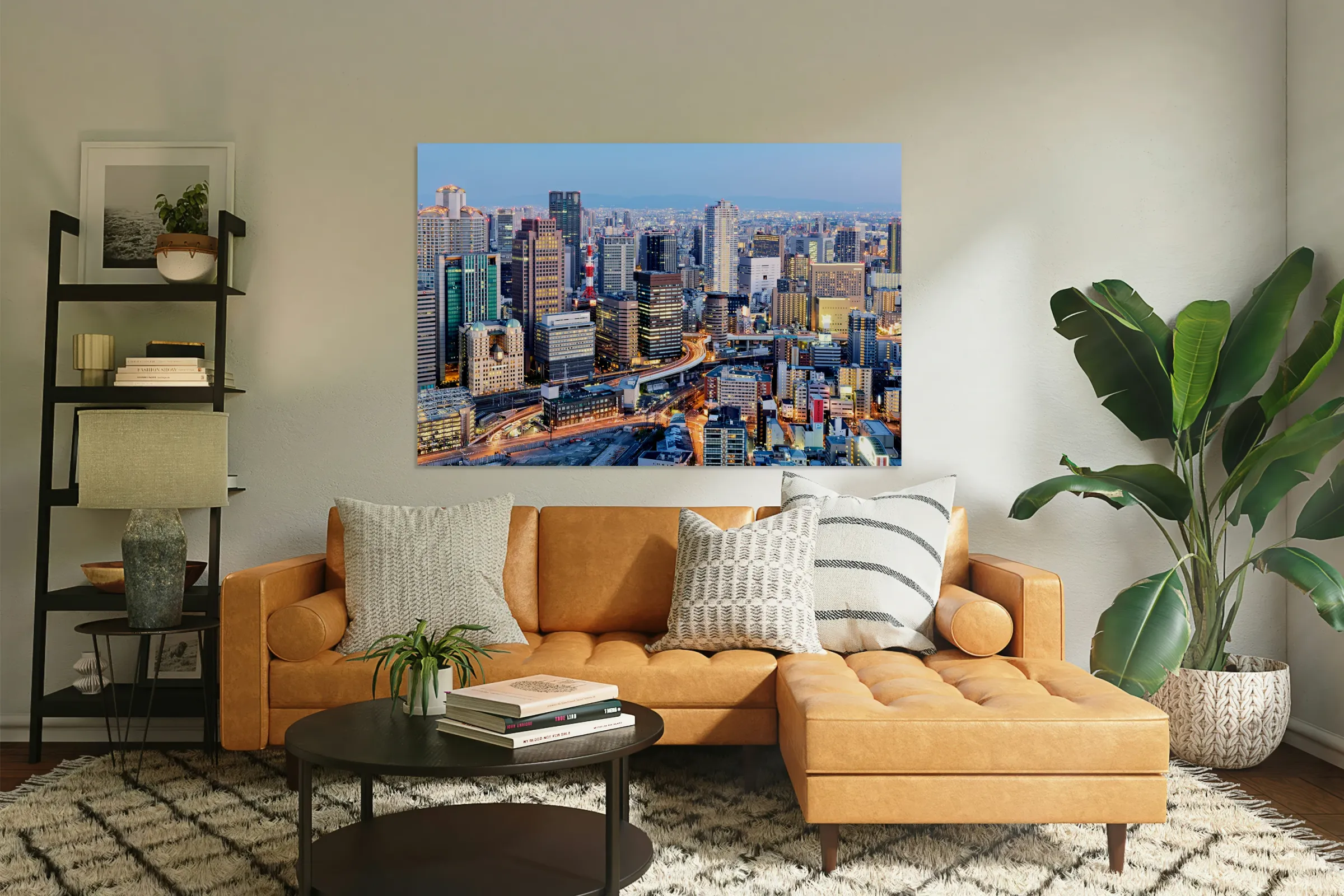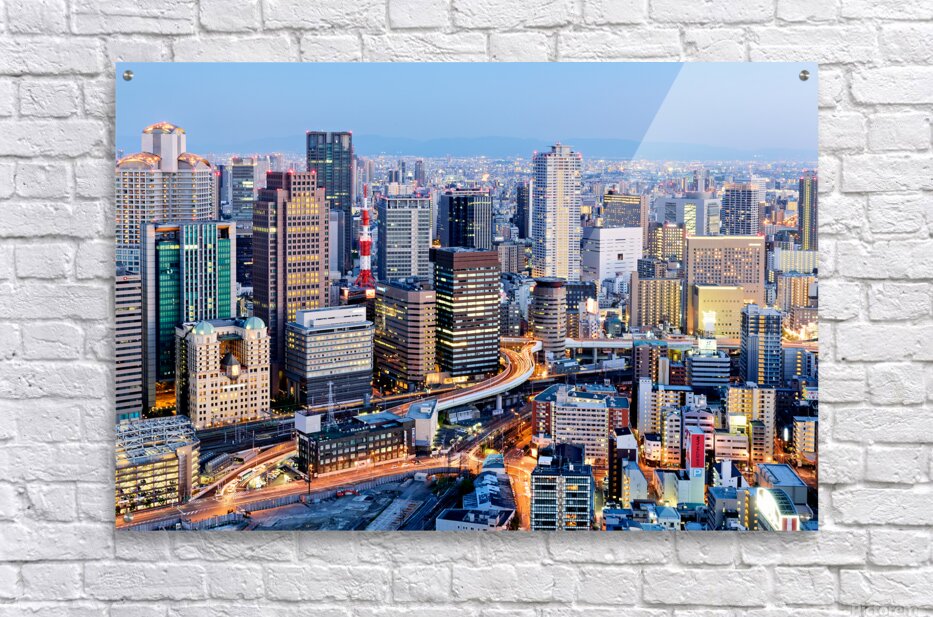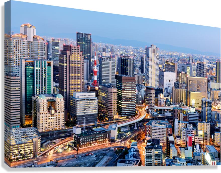 Get this artwork "Osaka business district at dusk with city lights and buildings" in a framed print.