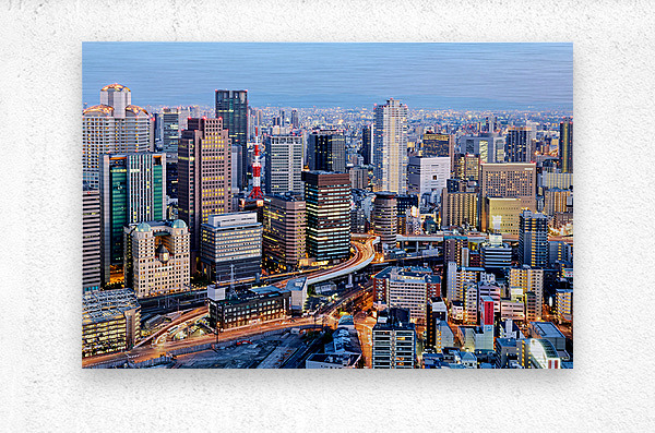 ABOUT THIS ARTWORK: OSAKA BUSINESS DISTRICT AT DUSK WITH CITY LIGHTS AND BUILDINGS
