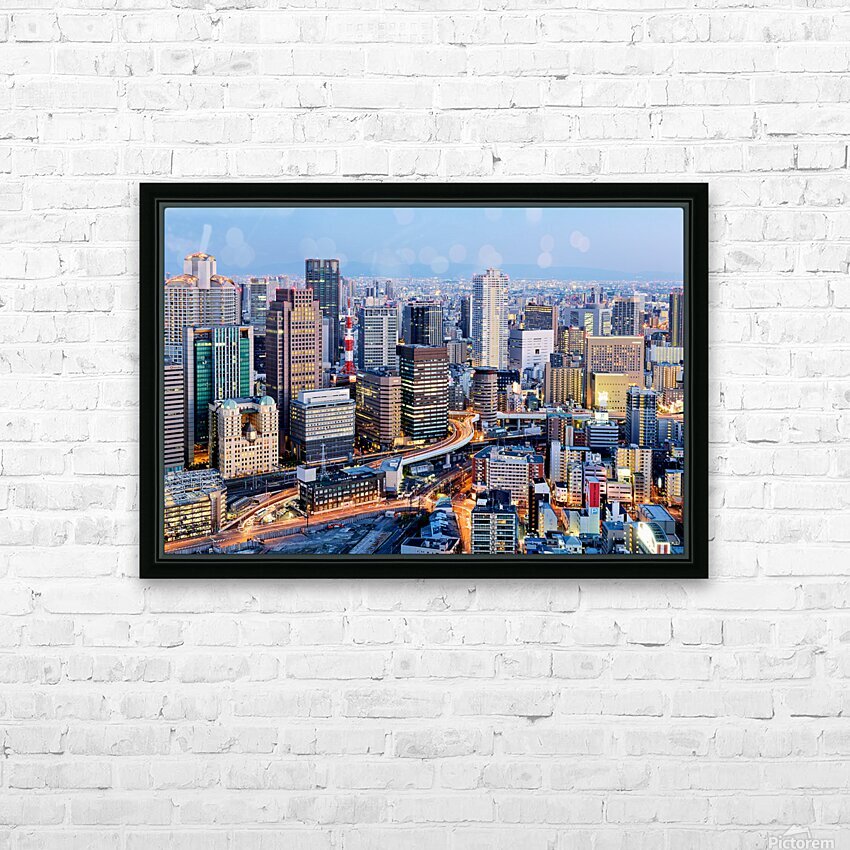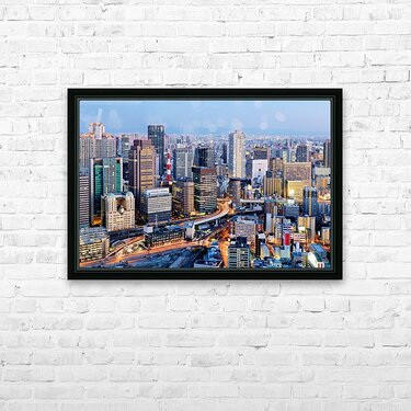 Osaka business district at dusk with city lights and buildings Picture Frame Printing