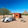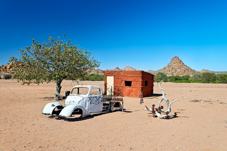 A car wreck sits in the Namibian desert. Nearby is a simple structure and some trees under a clear blue sky.
