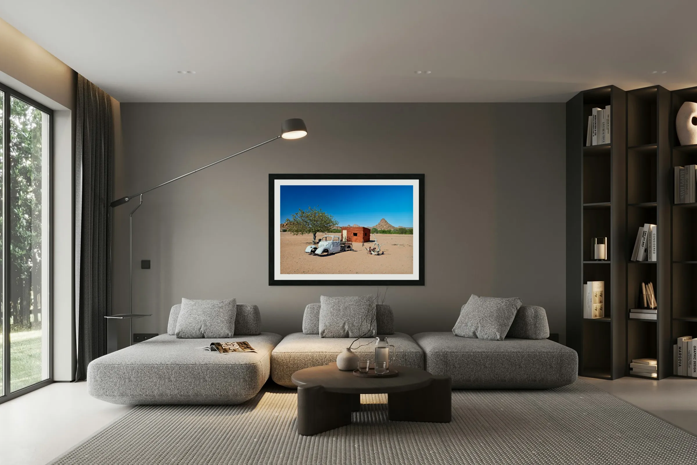 Get this artwork "Classic car wreck in Namibias desert landscape near a structure" in a framed print.