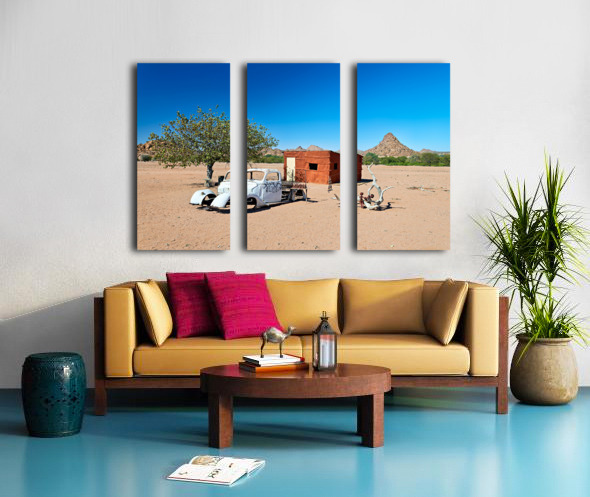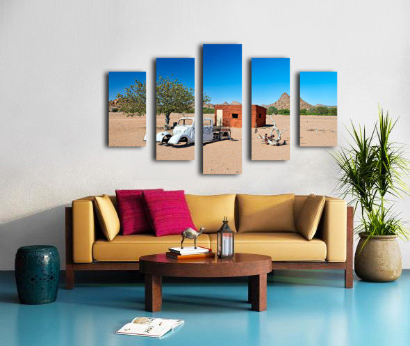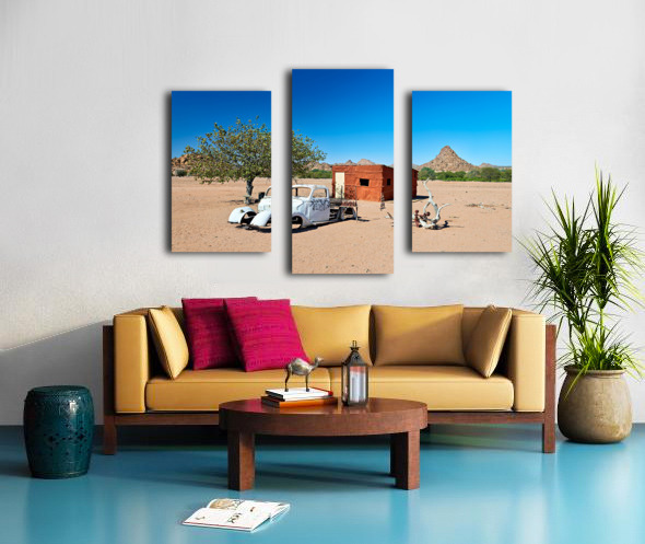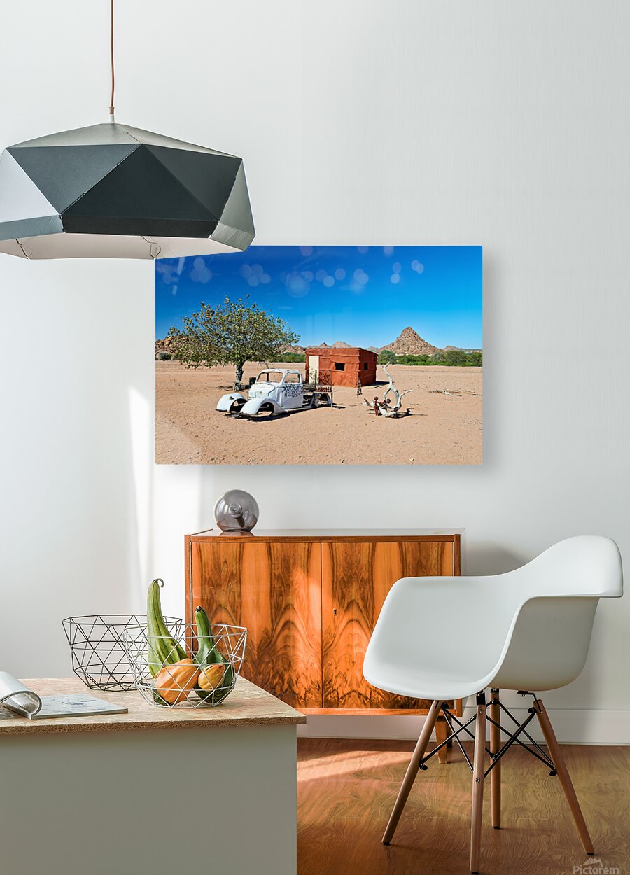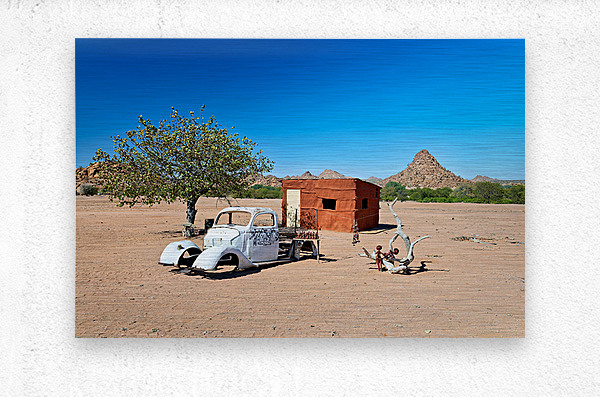 ABOUT THIS ARTWORK: CLASSIC CAR WRECK IN NAMIBIAS DESERT LANDSCAPE NEAR A STRUCTURE