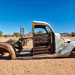 ABOUT THIS ARTWORK: CLASSIC CAR WRECK RESTS IN THE NAMIB DESERT UNDER A CLEAR SKY