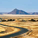A vehicle travels along a winding road in Namib Naukluft National Park. Scenic views of mountains and open landscapes are visible.