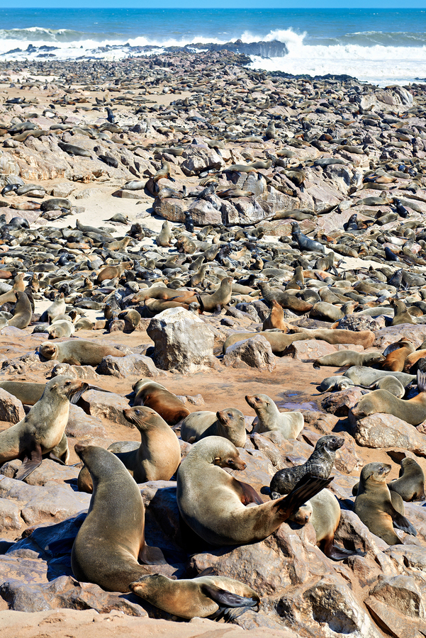 Cape fur seals rest and interact at Cape Cross on the Skeleton Coast of Namibia. The colony is busy and many seals are seen among the rocks.