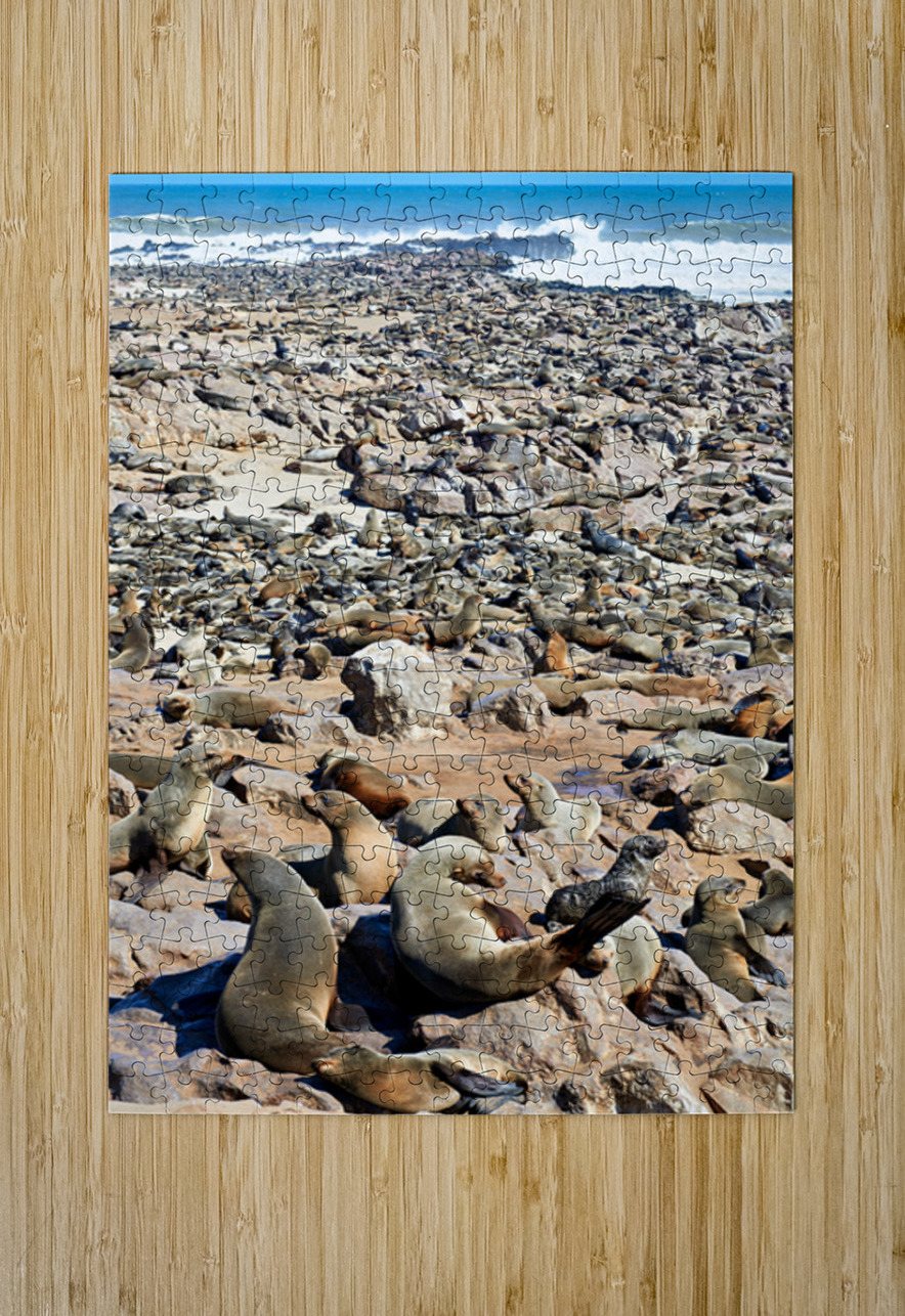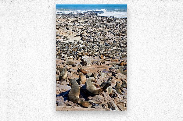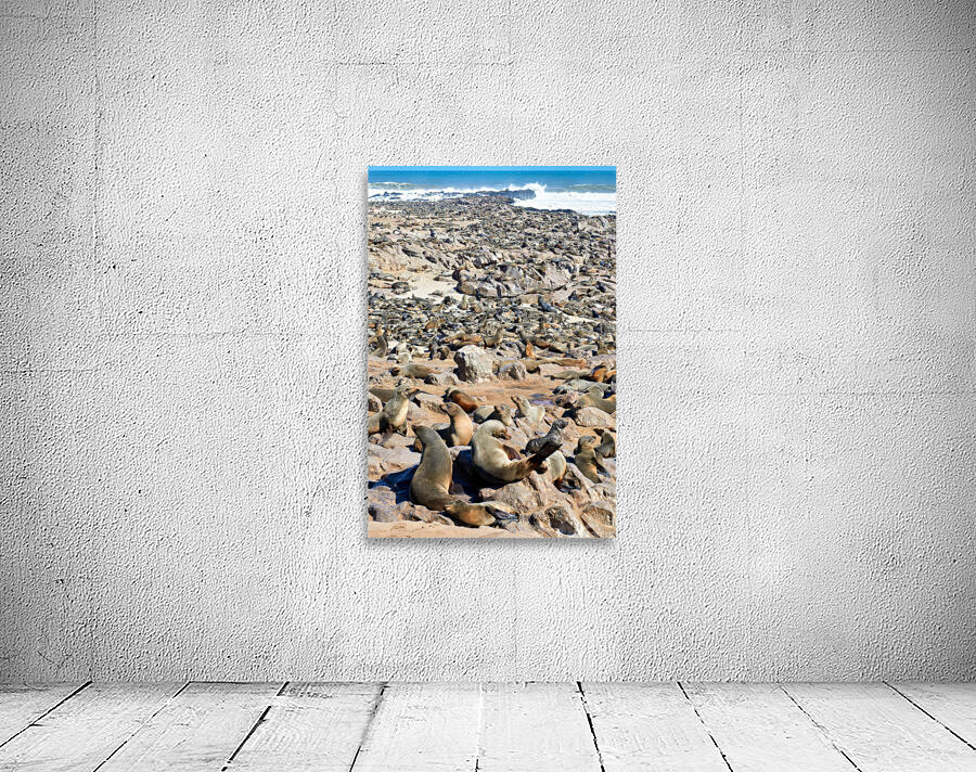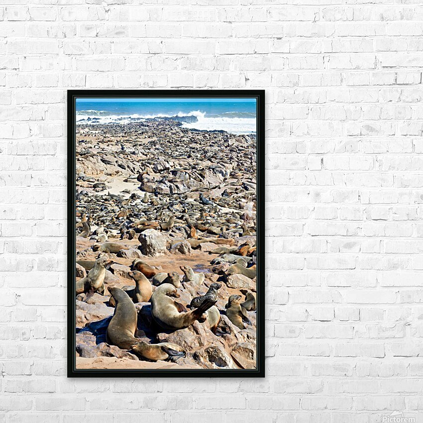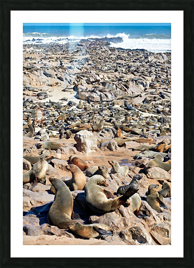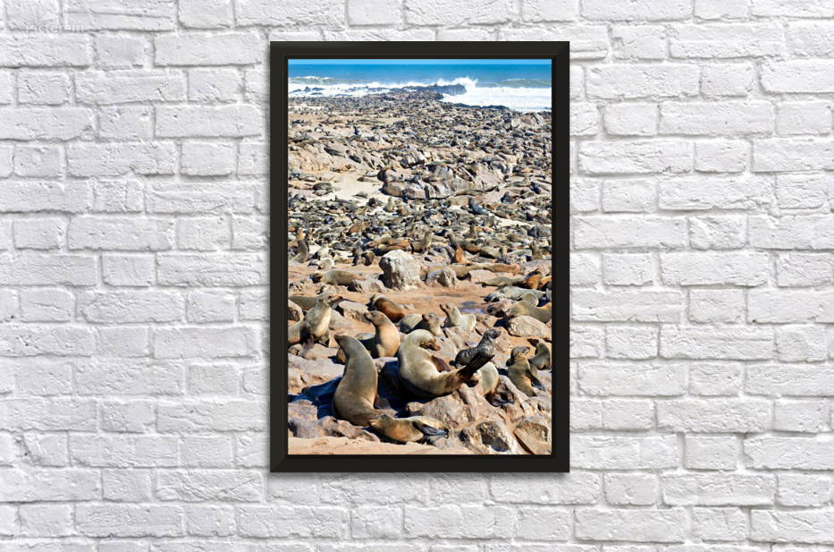 "Cape fur seals gather at Cape Cross in Namibias Skeleton Coast" in a framed print.