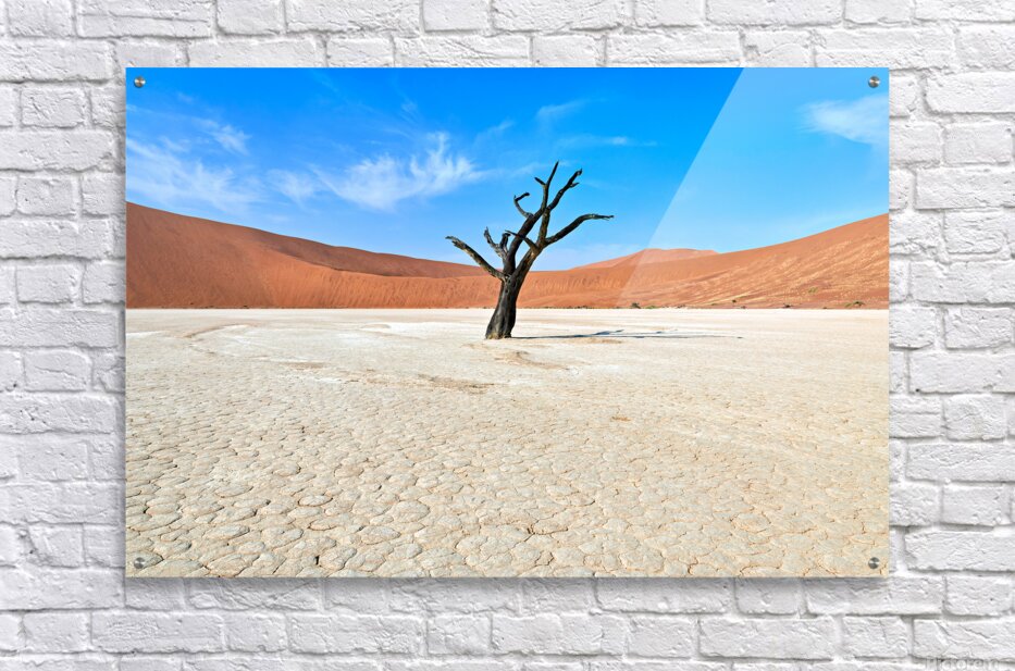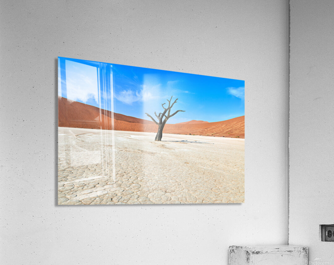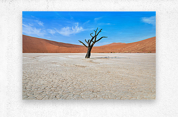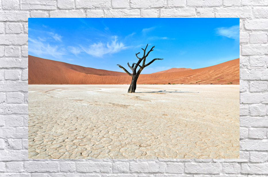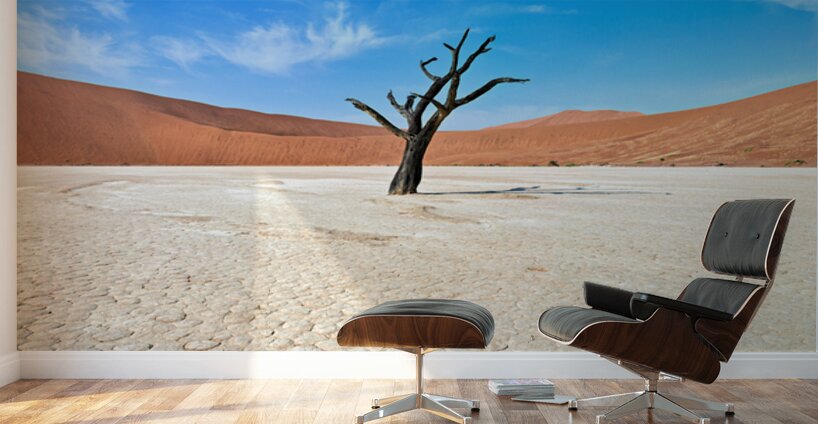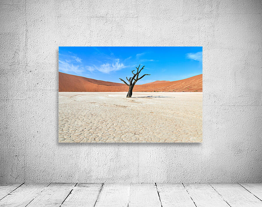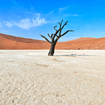 Deadvlei in Namibia features a dry landscape with cracked earth and a dead tree. The area is surrounded by high red dunes under a blue sky.