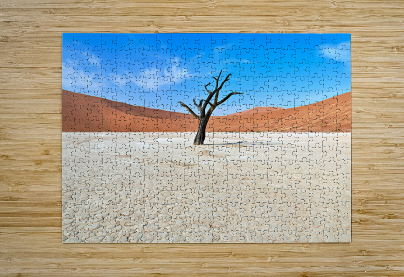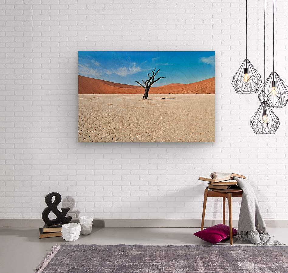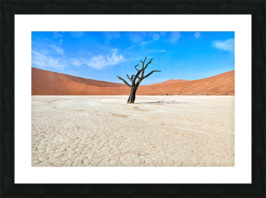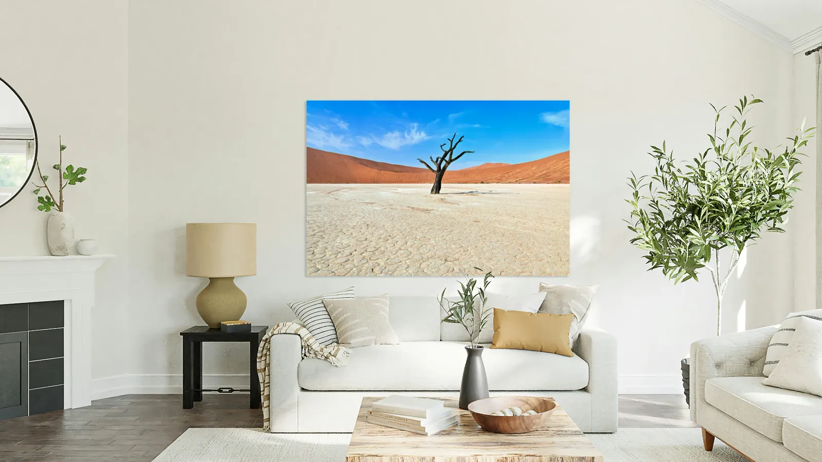 Deadvlei in Namibia features a dry landscape with cracked earth and a dead tree. The area is surrounded by high red dunes under a blue sky.